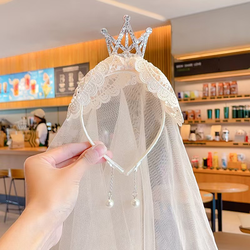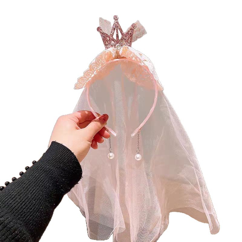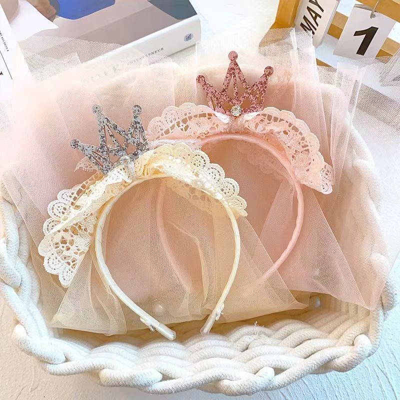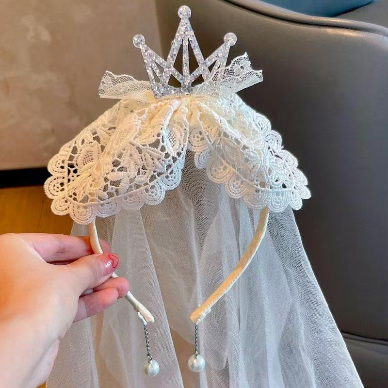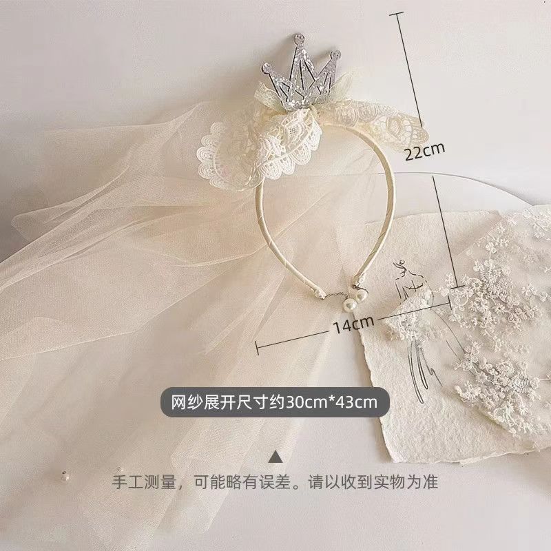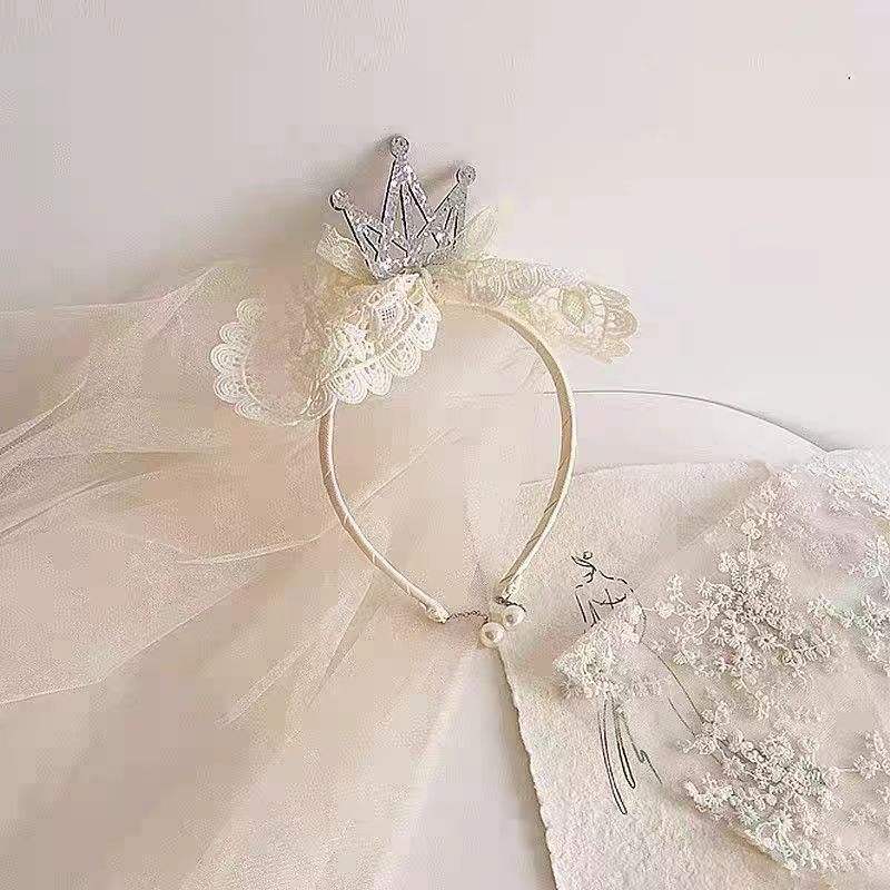 女童宝宝周岁生日头纱甜美公主头饰洛丽塔皇冠蕾丝蝴蝶结披沙发箍