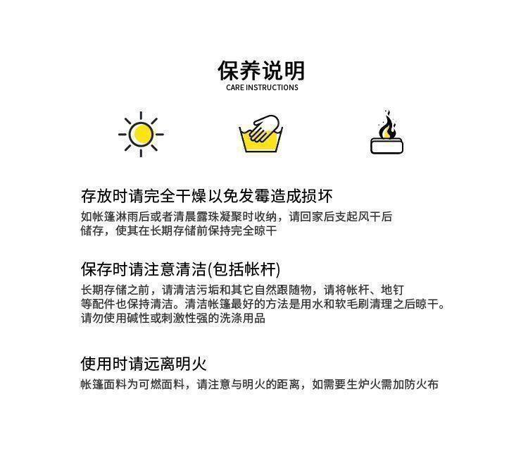 常见问题:1.帐篷表面出现破裂,可购买帐篷专用修补胶带进行修复。2.帐篷使用变脏,可直接用水清洗,清洗后晾干即可。3.拉链损坏,可购买万能拉链头替换。