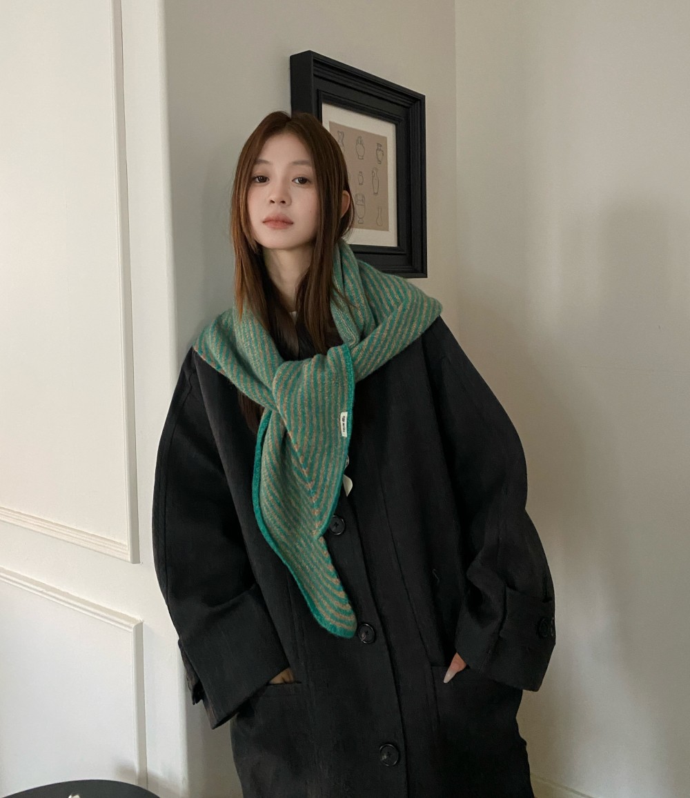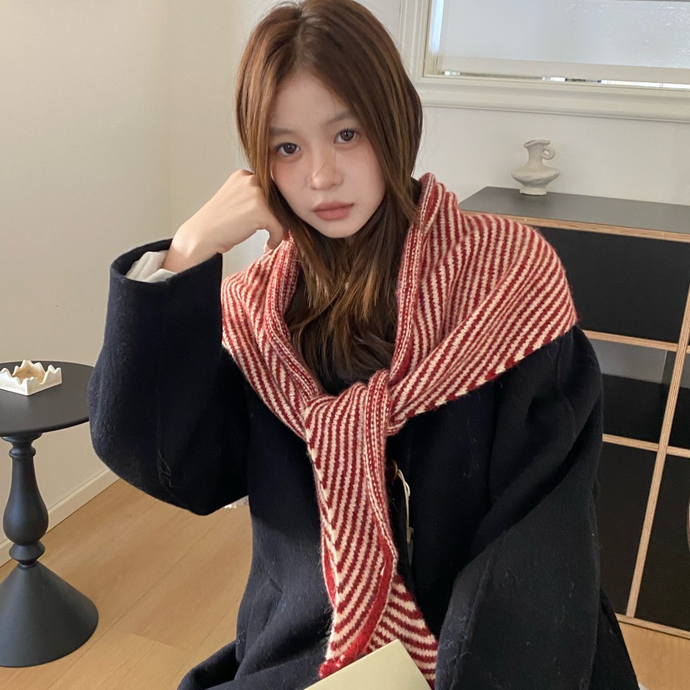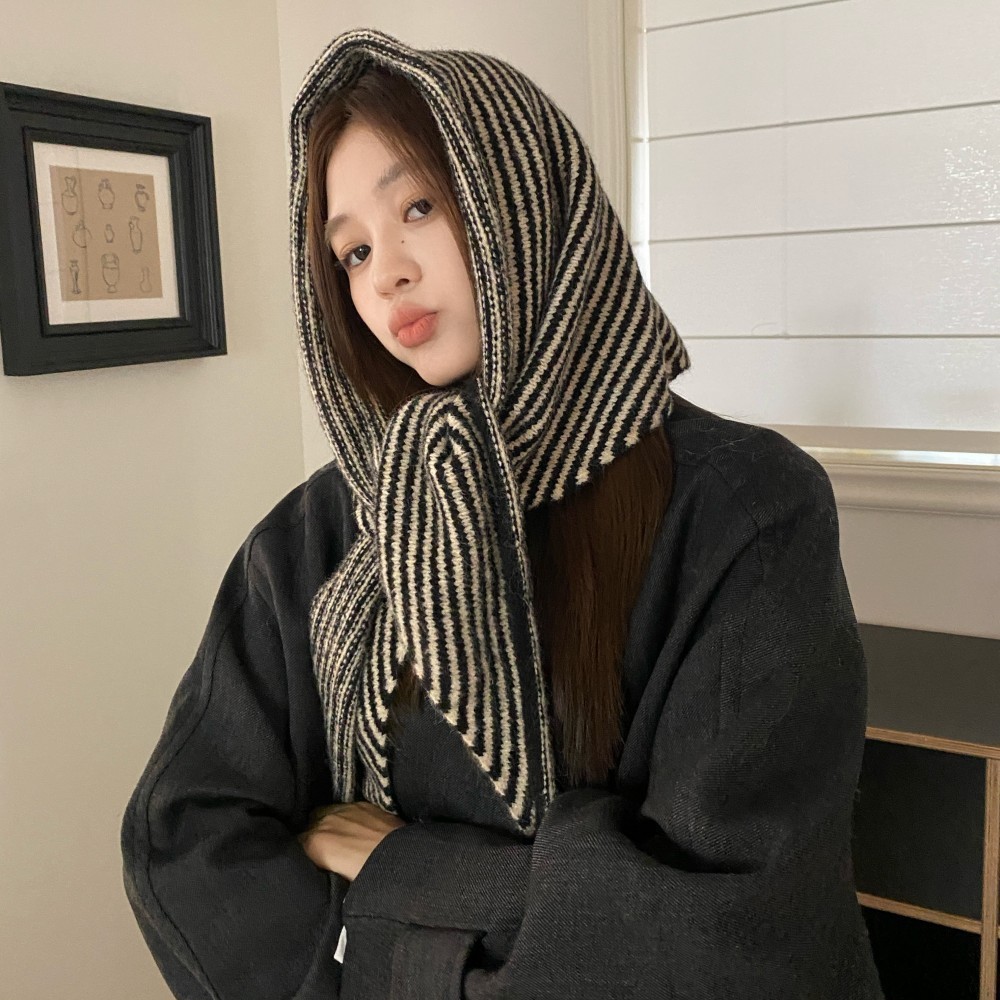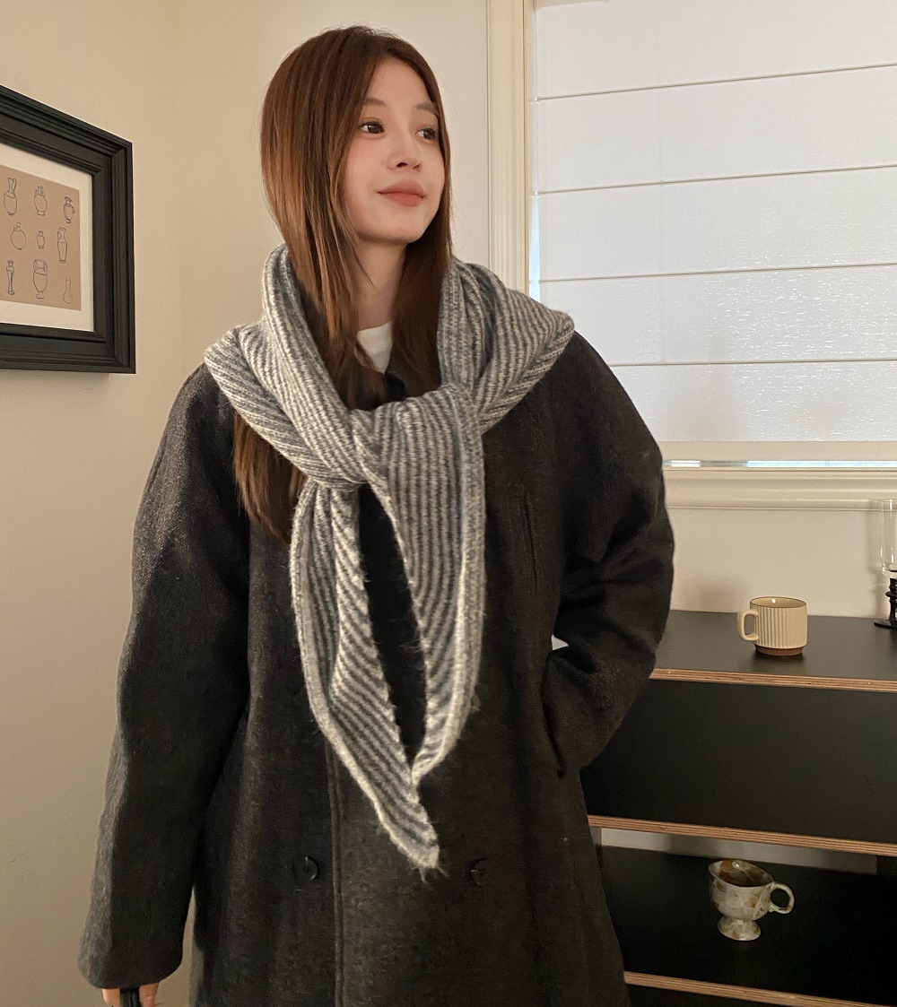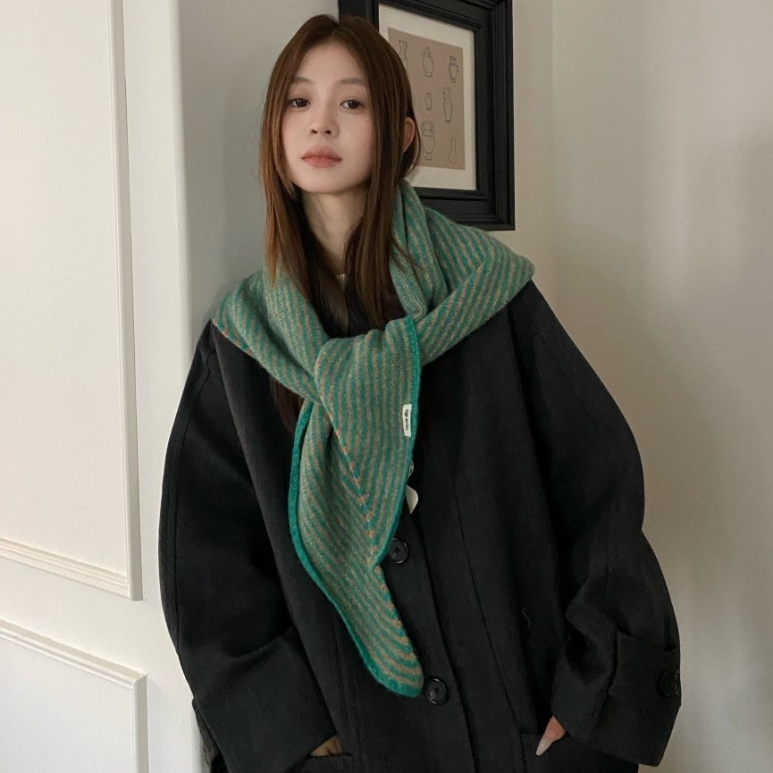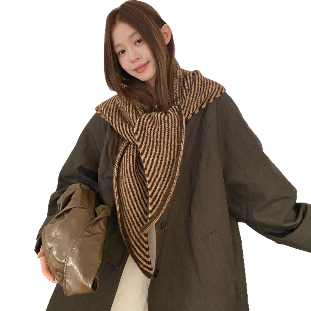 韩代春秋时尚含羊毛凹造型三角巾披肩女秋冬保暖针织条纹坎肩围巾