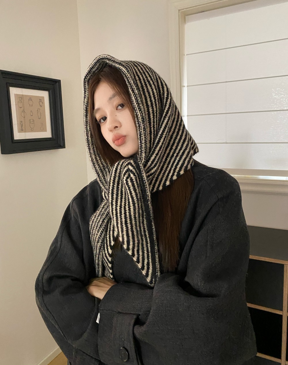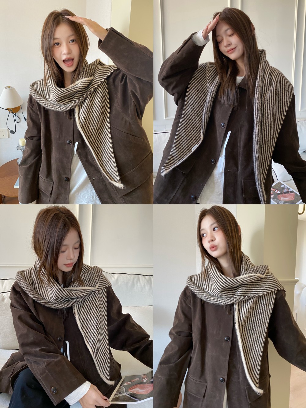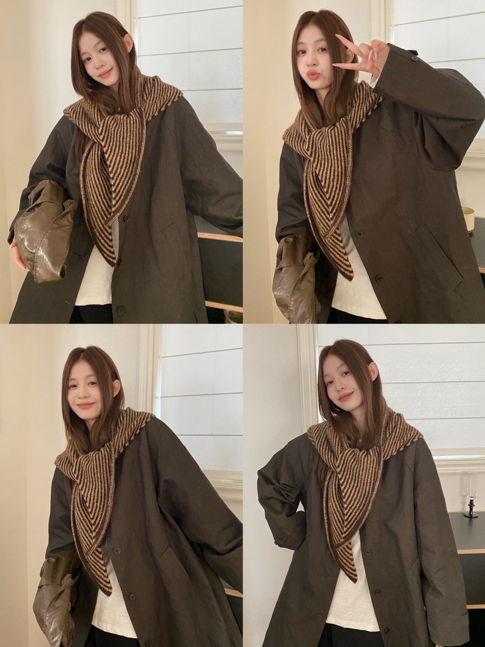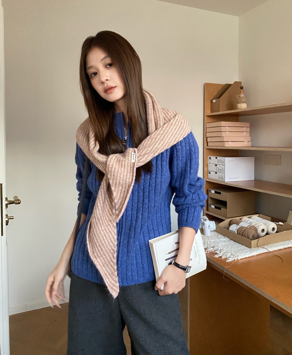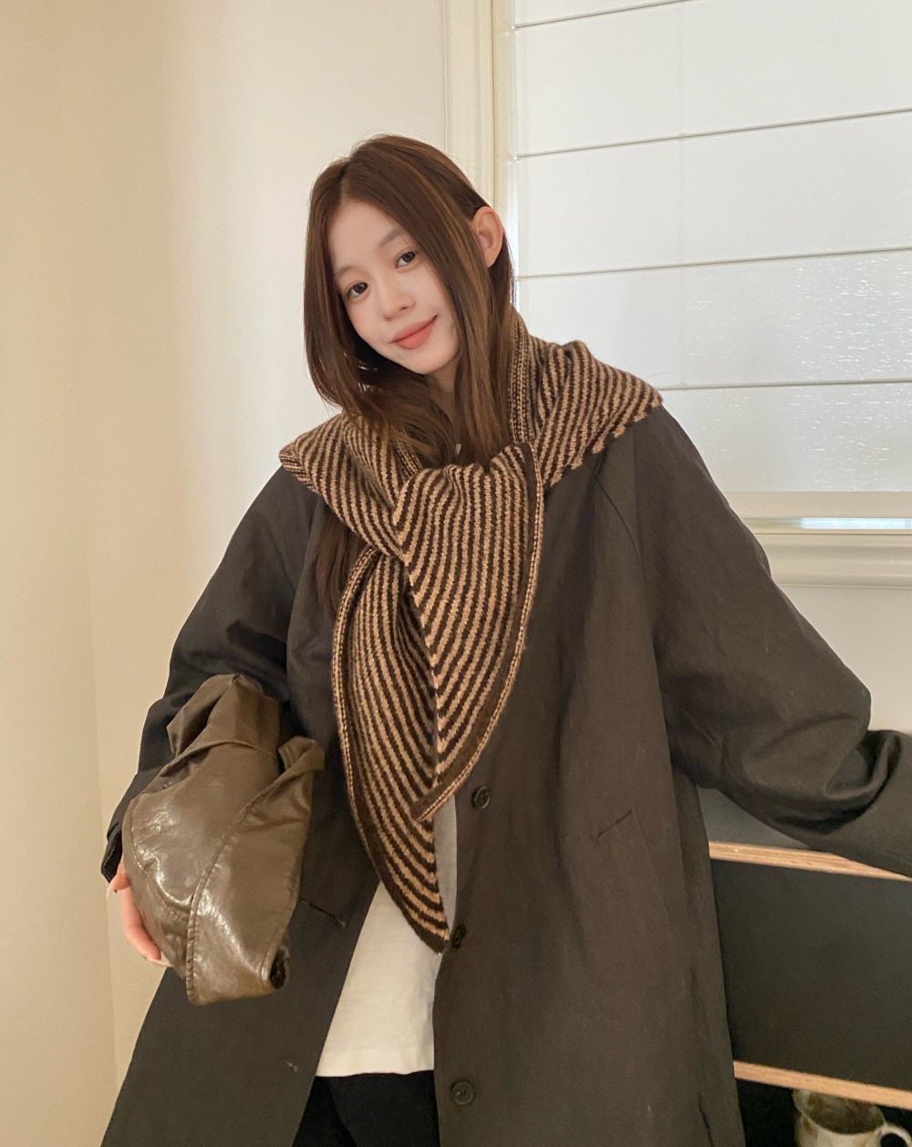 韩代春秋时尚含羊毛凹造型三角巾披肩女秋冬保暖针织条纹坎肩围巾