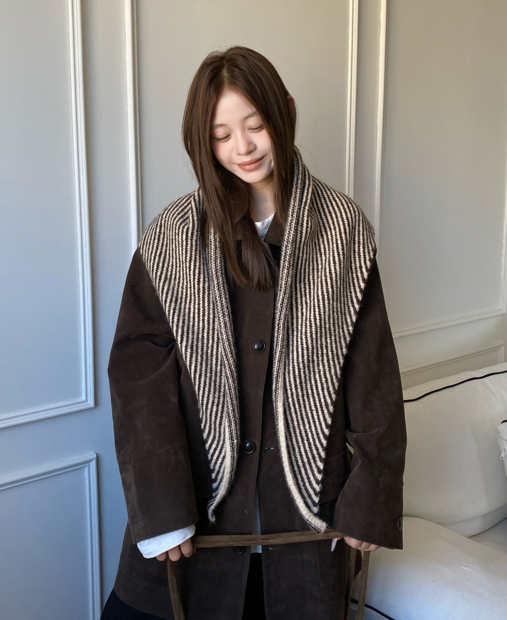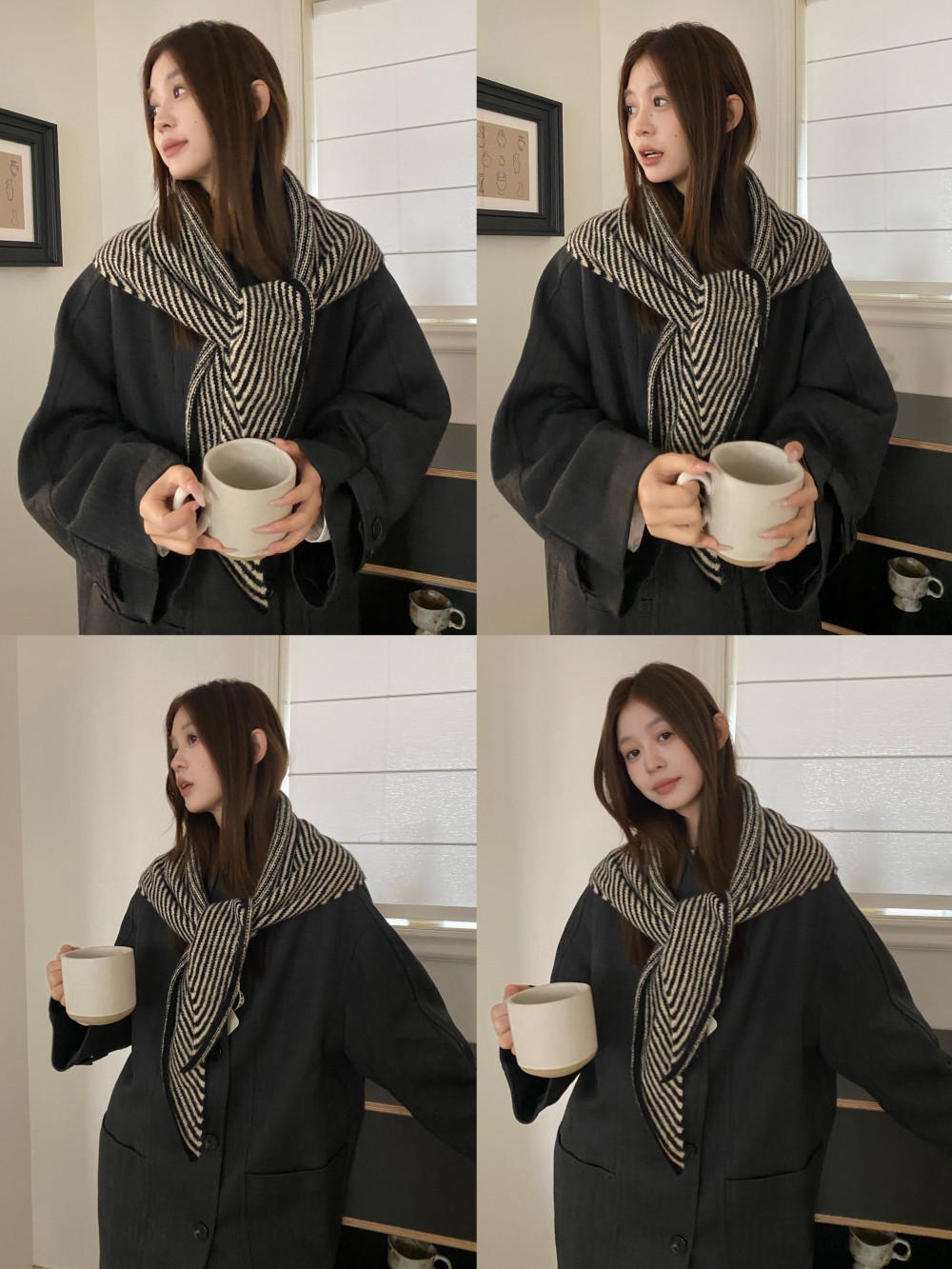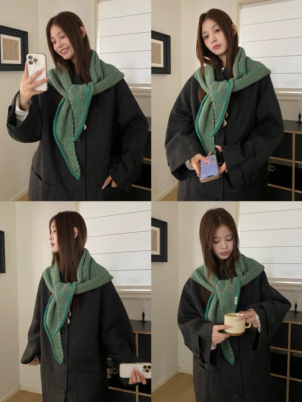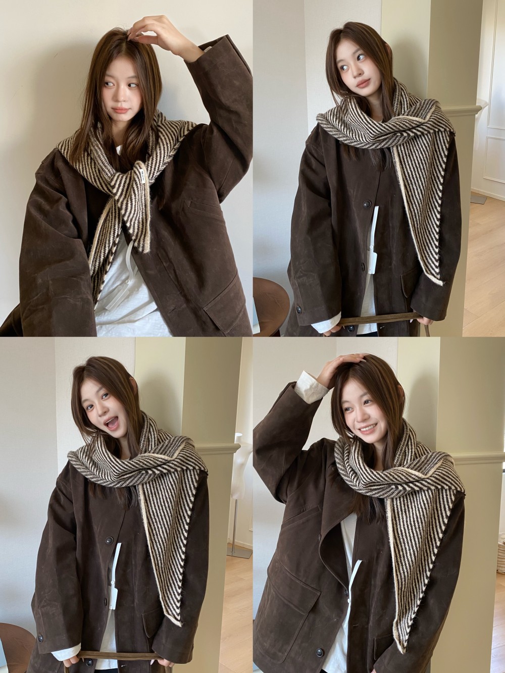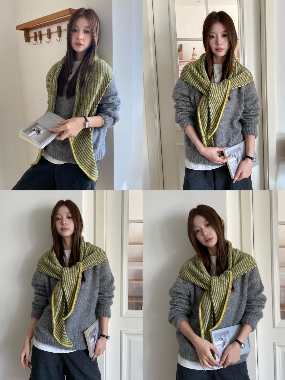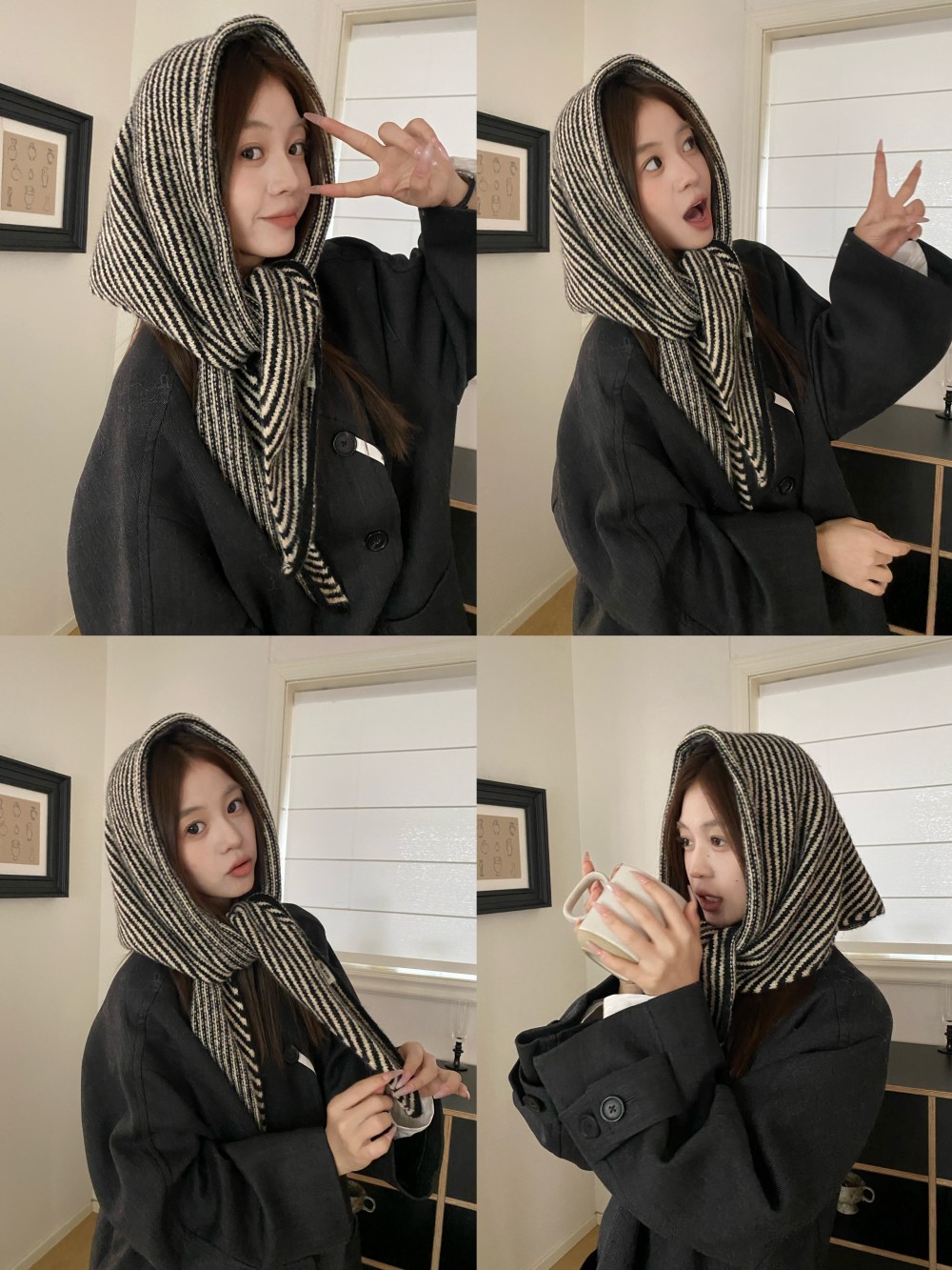 韩代春秋时尚含羊毛凹造型三角巾披肩女秋冬保暖针织条纹坎肩围巾