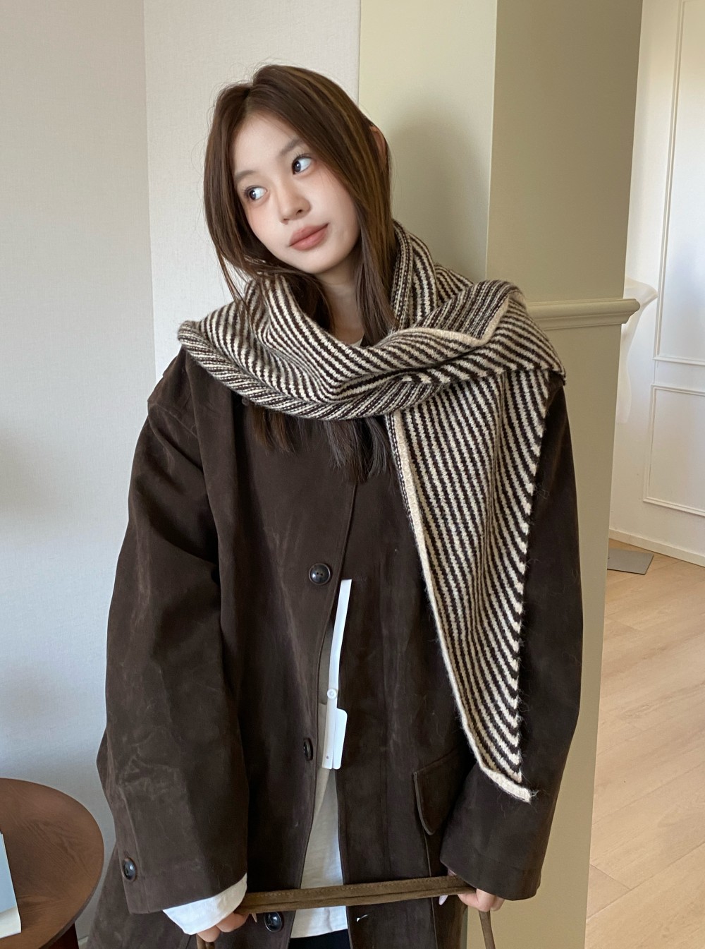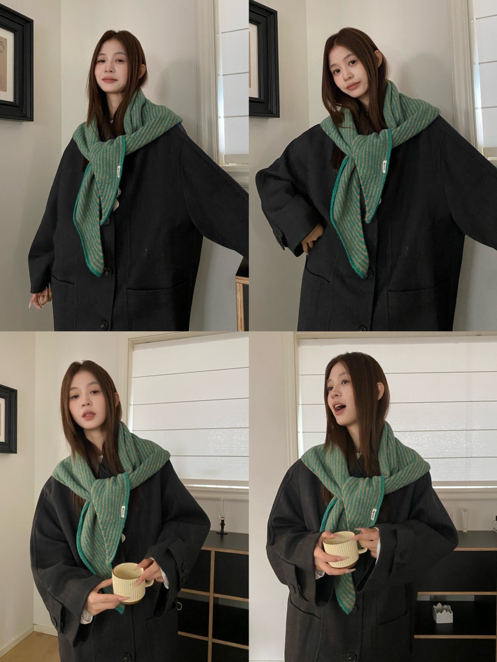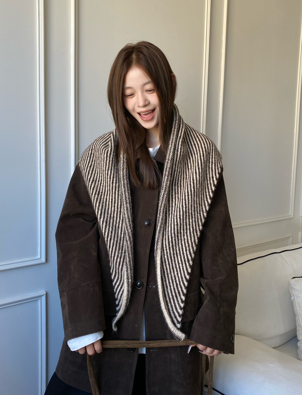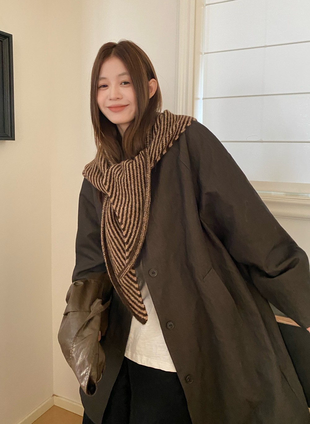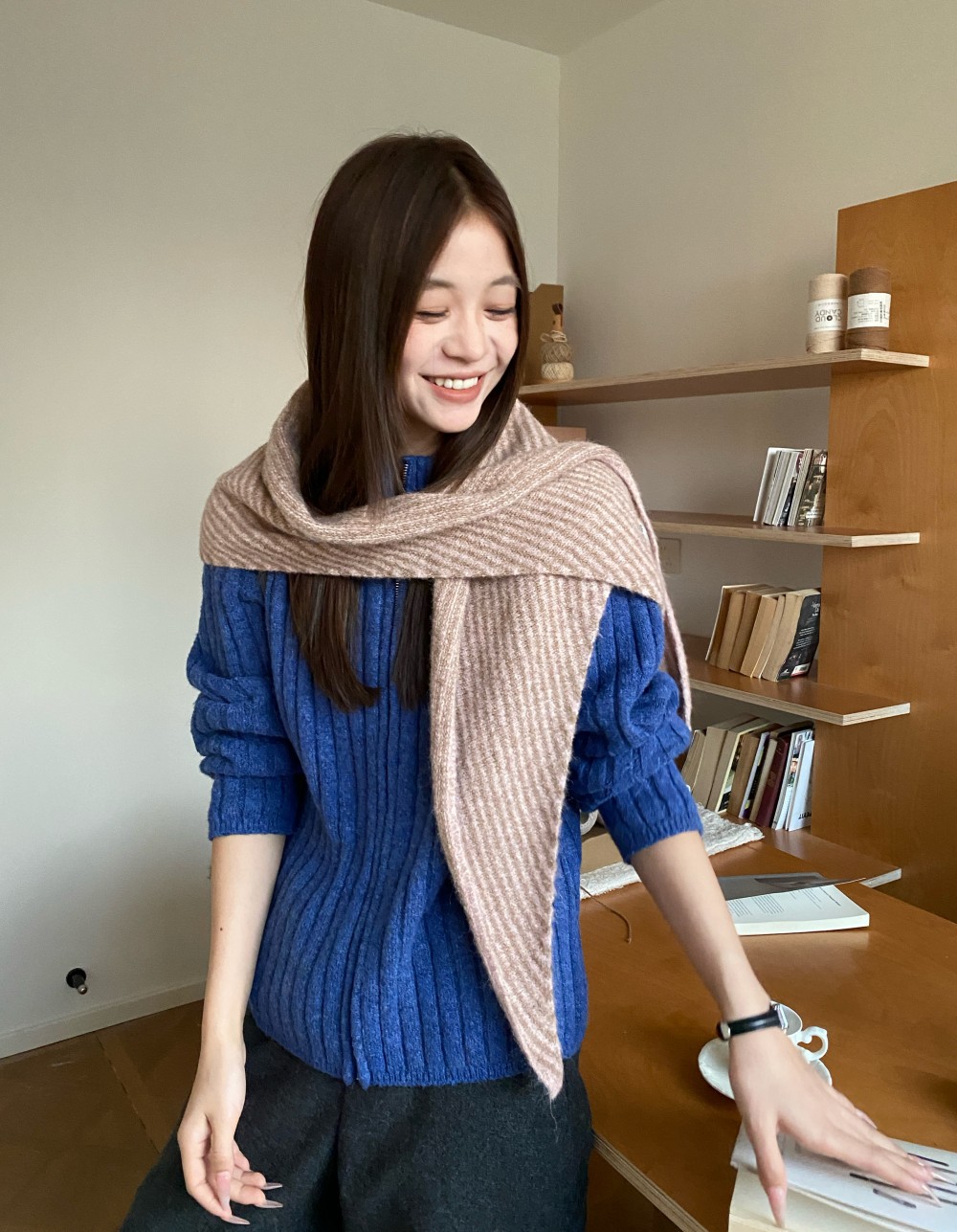韩代春秋时尚含羊毛凹造型三角巾披肩女秋冬保暖针织条纹坎肩围巾