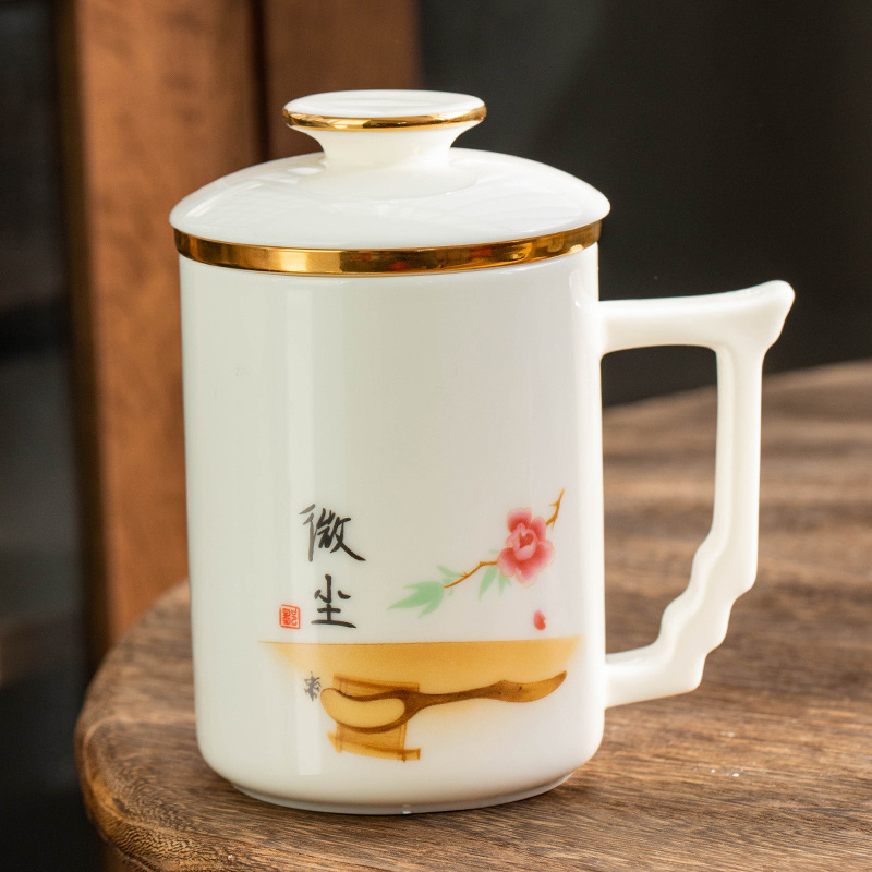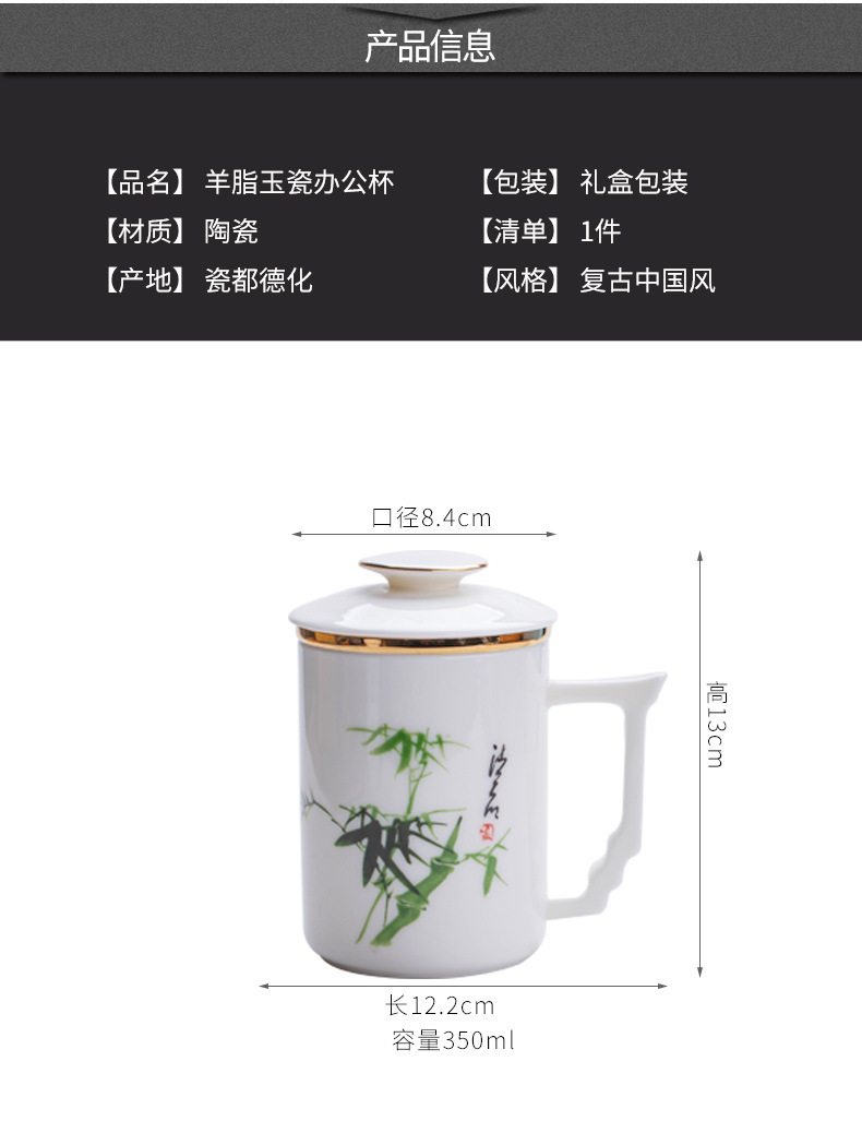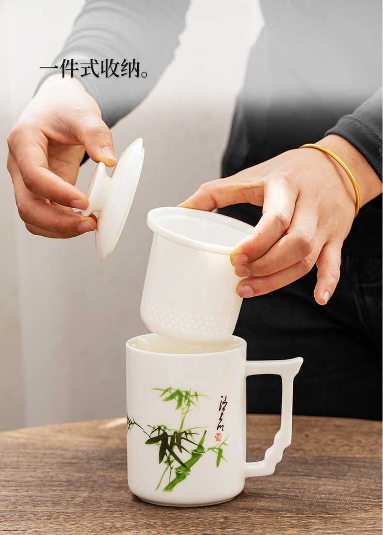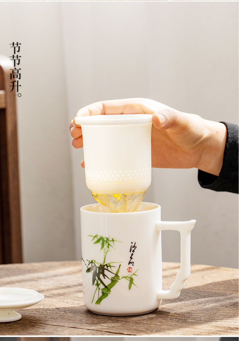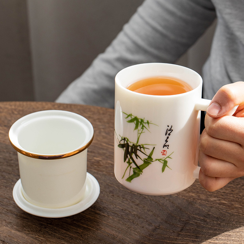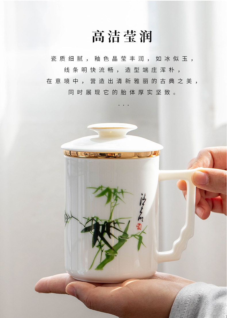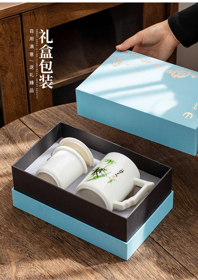 羊脂玉陶瓷办公杯水杯茶杯带盖茶水分离白瓷办公室公司礼品印logo