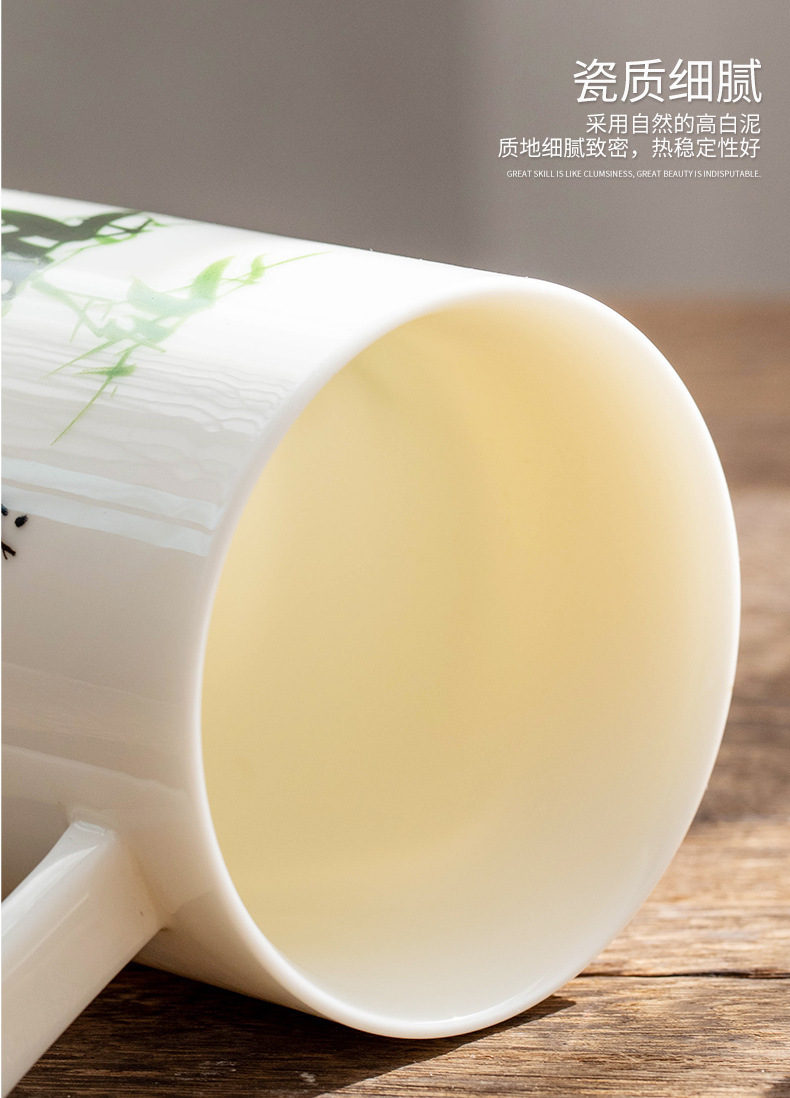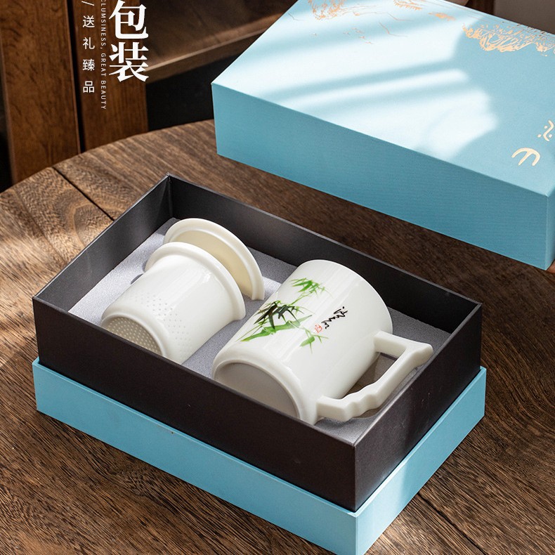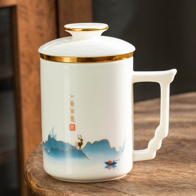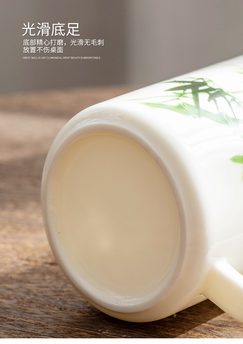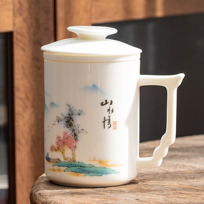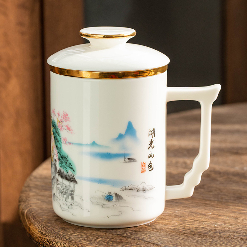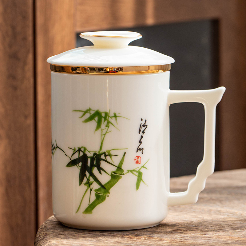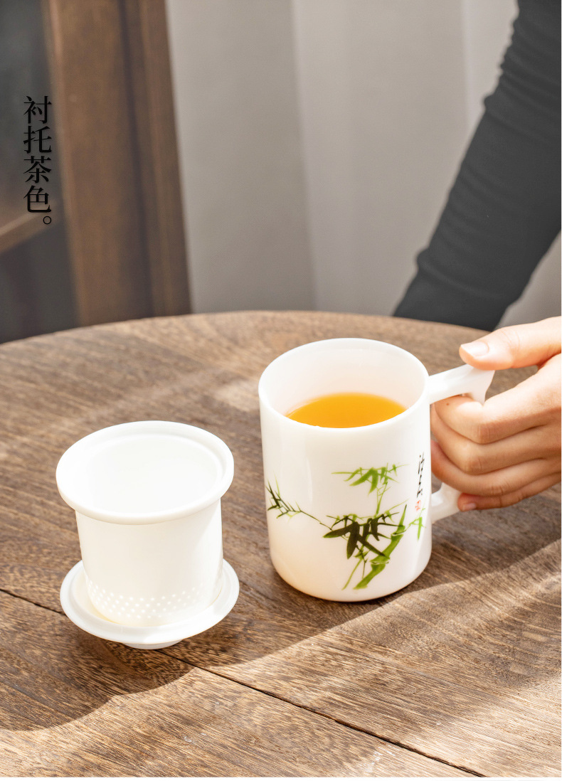 羊脂玉陶瓷办公杯水杯茶杯带盖茶水分离白瓷办公室公司礼品印logo