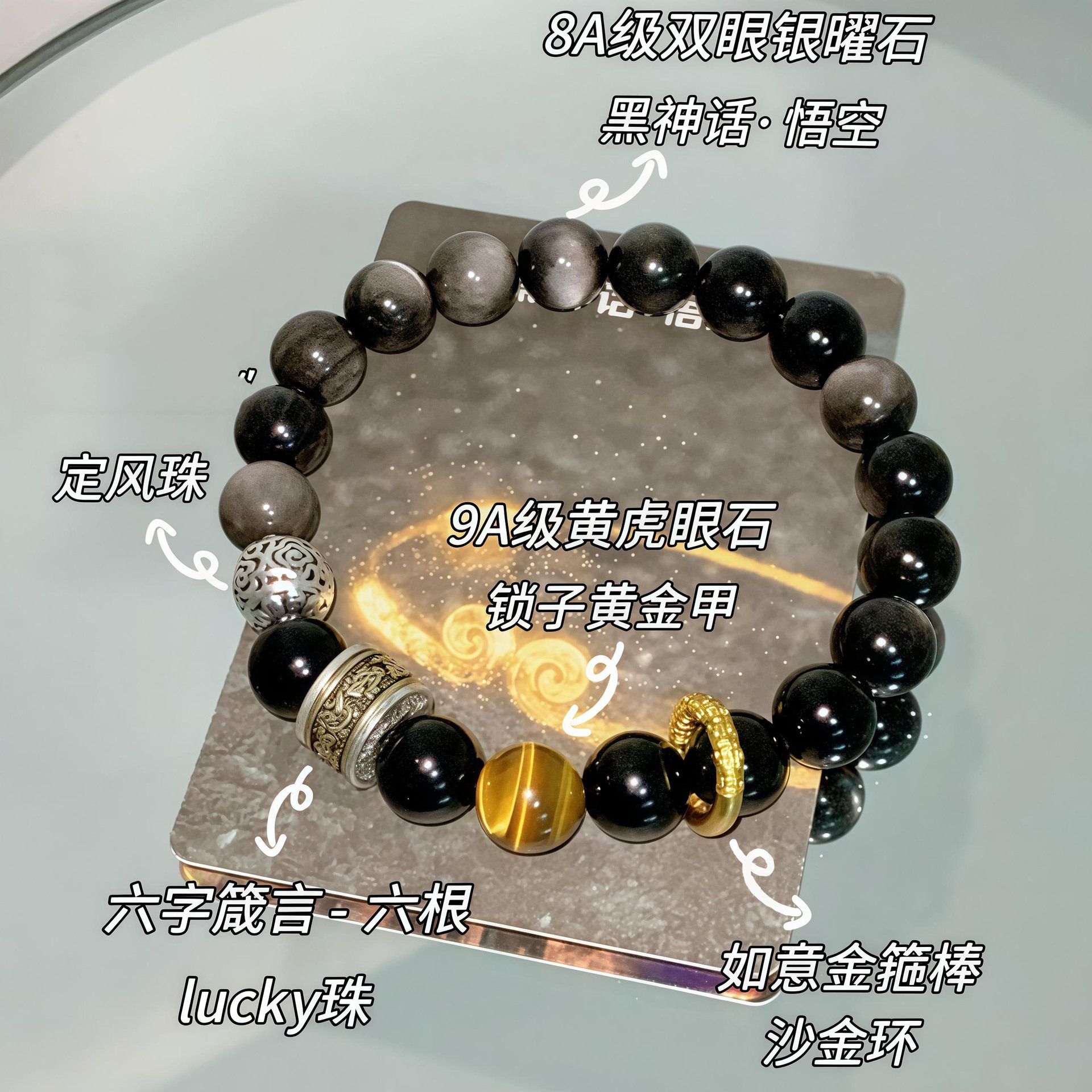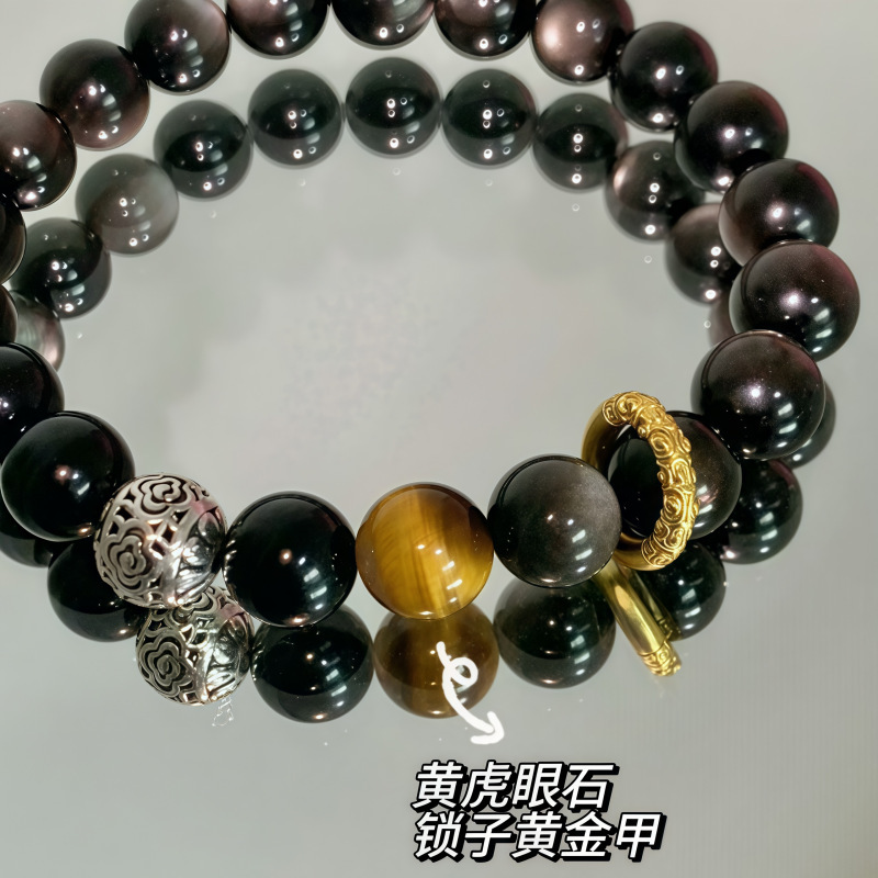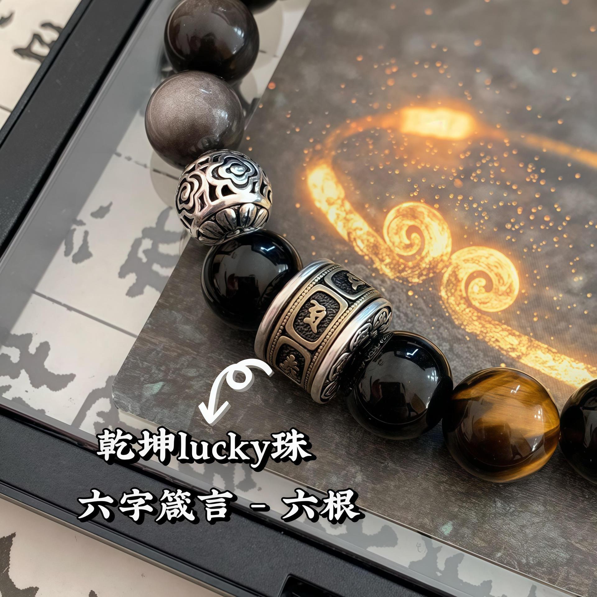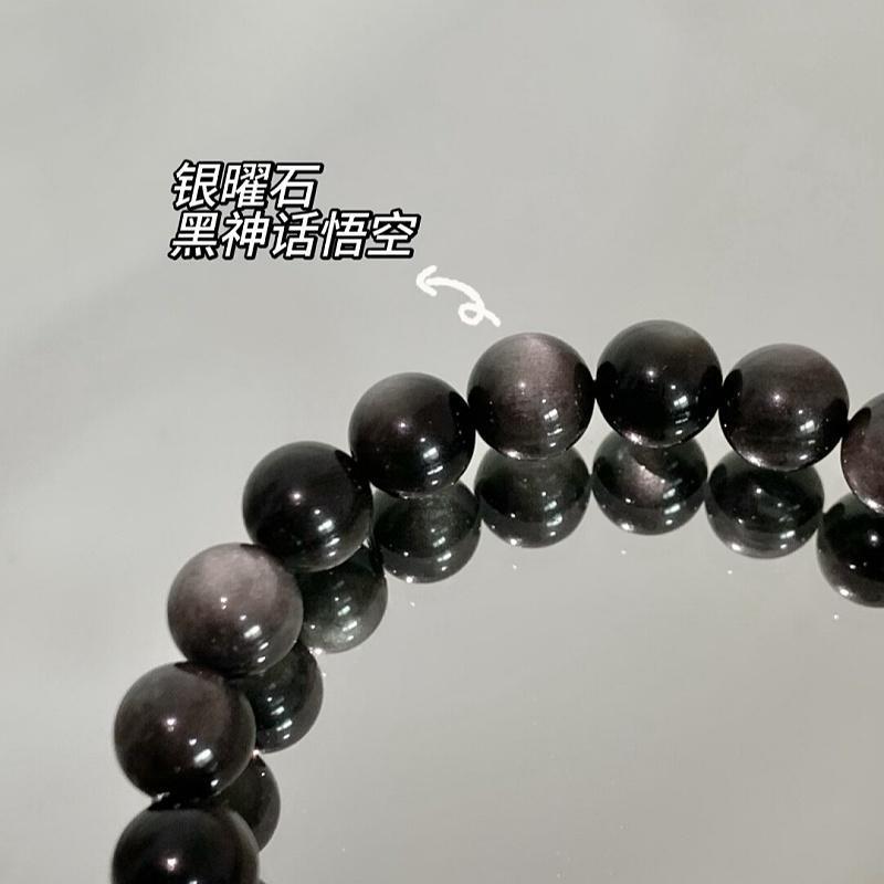 天然银曜石金曜石手串男女款好运六字箴言佛珠黑曜石手串高级感