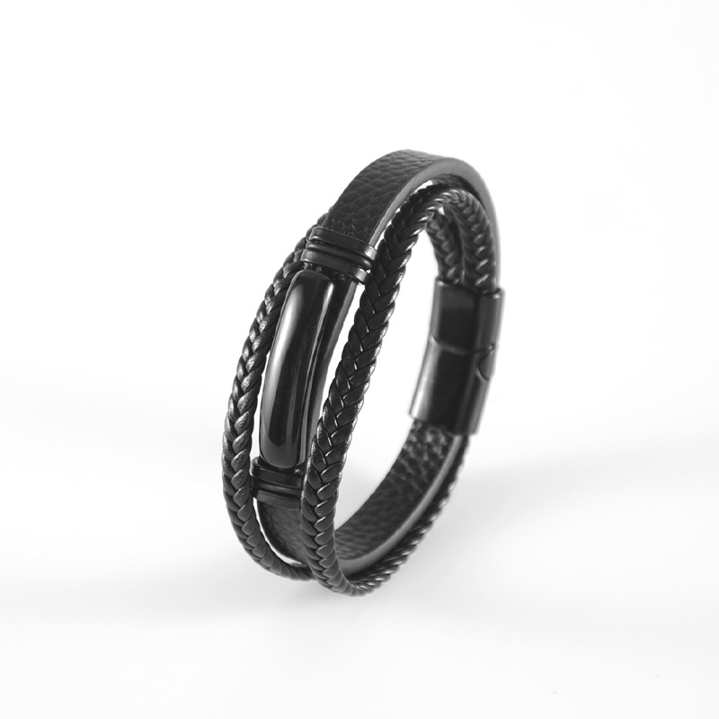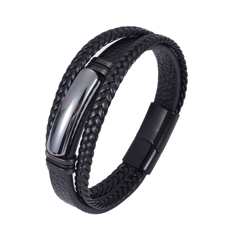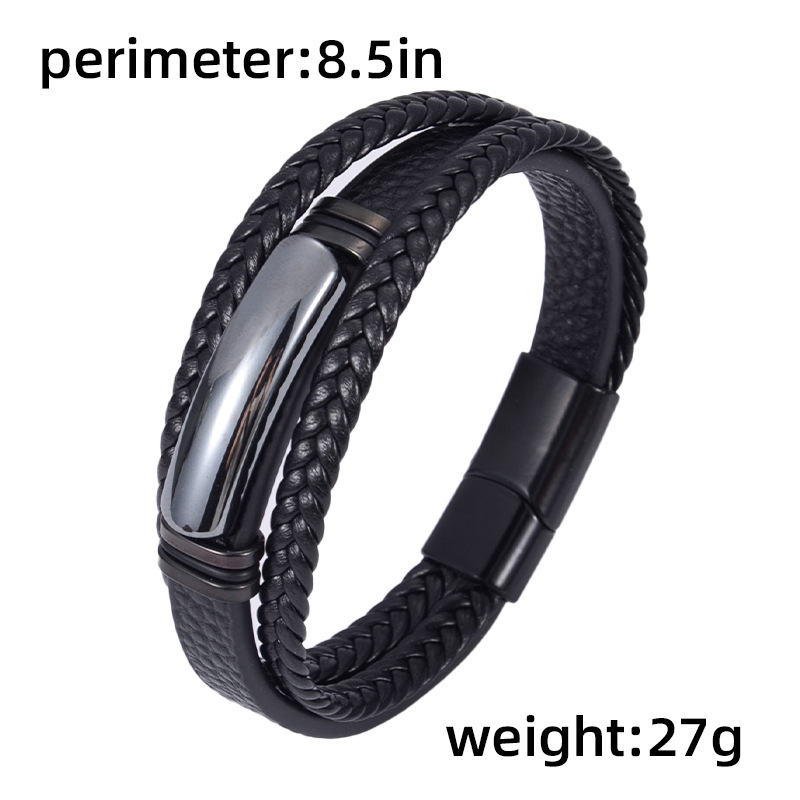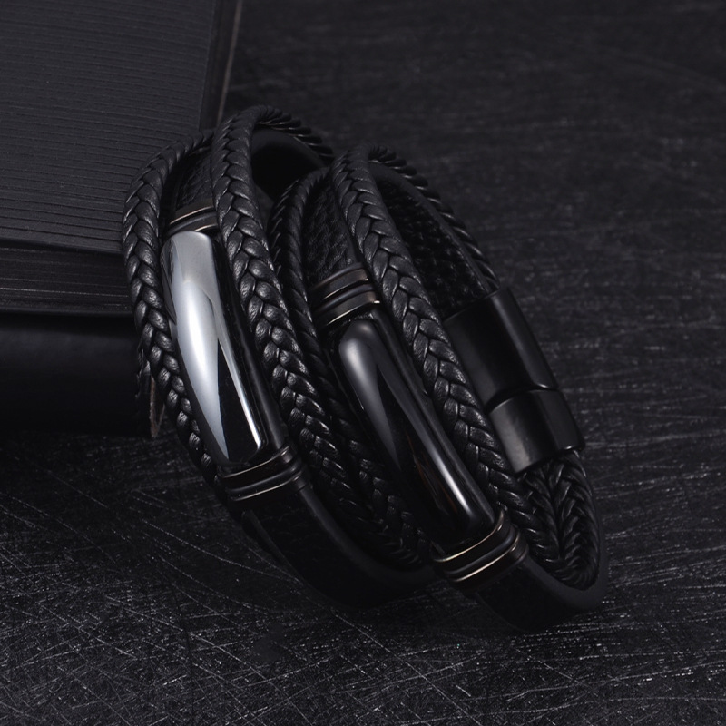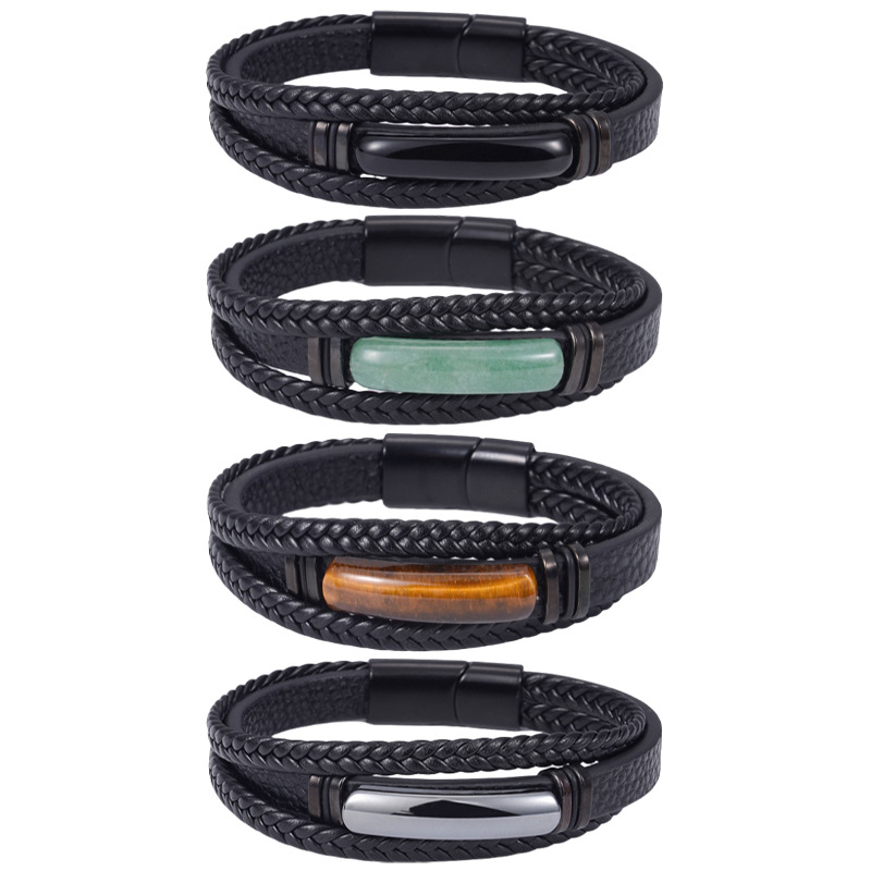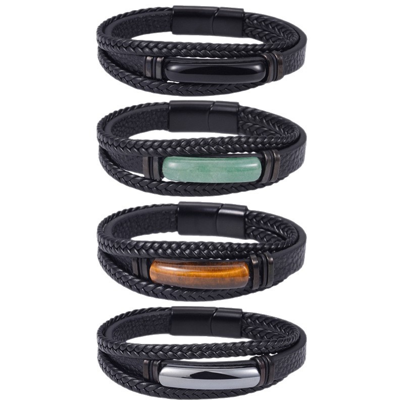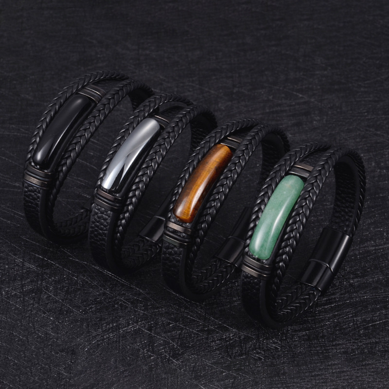 跨境皮革手工编制多层手镯男士欧美风复古不锈钢扣手环虎眼石手镯