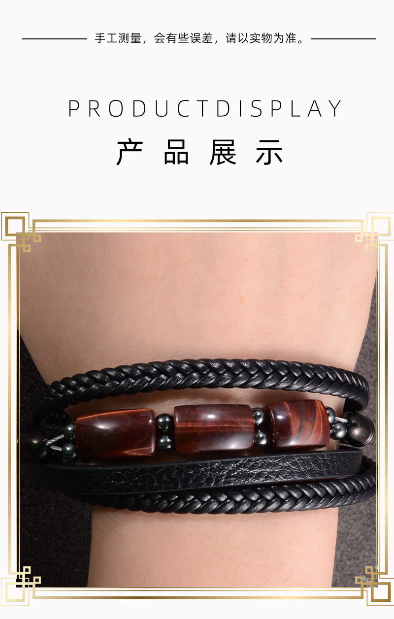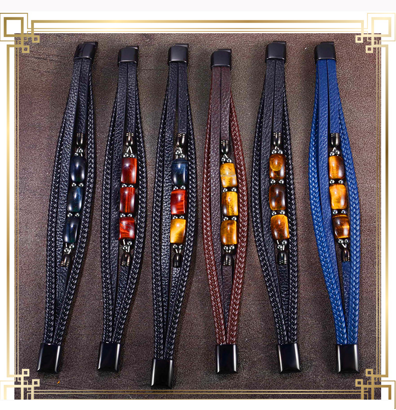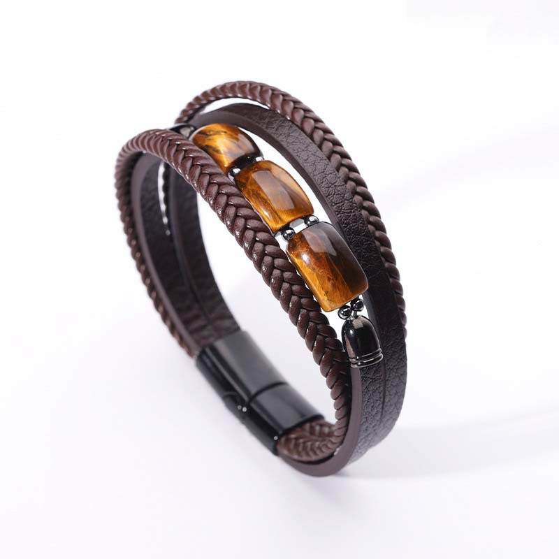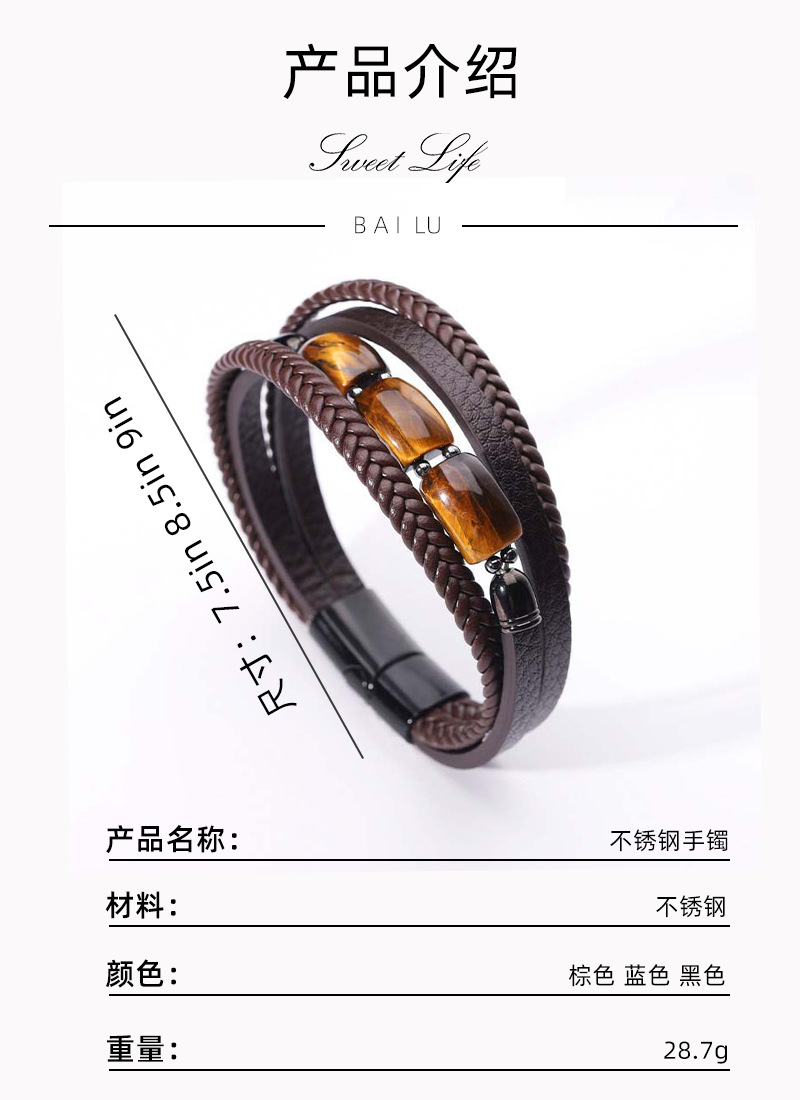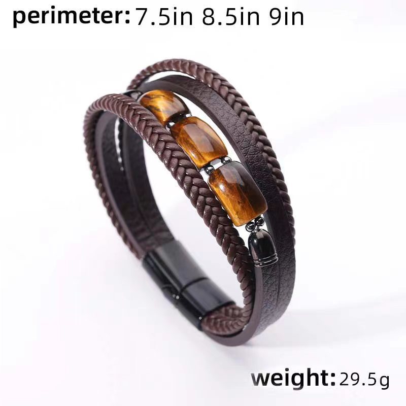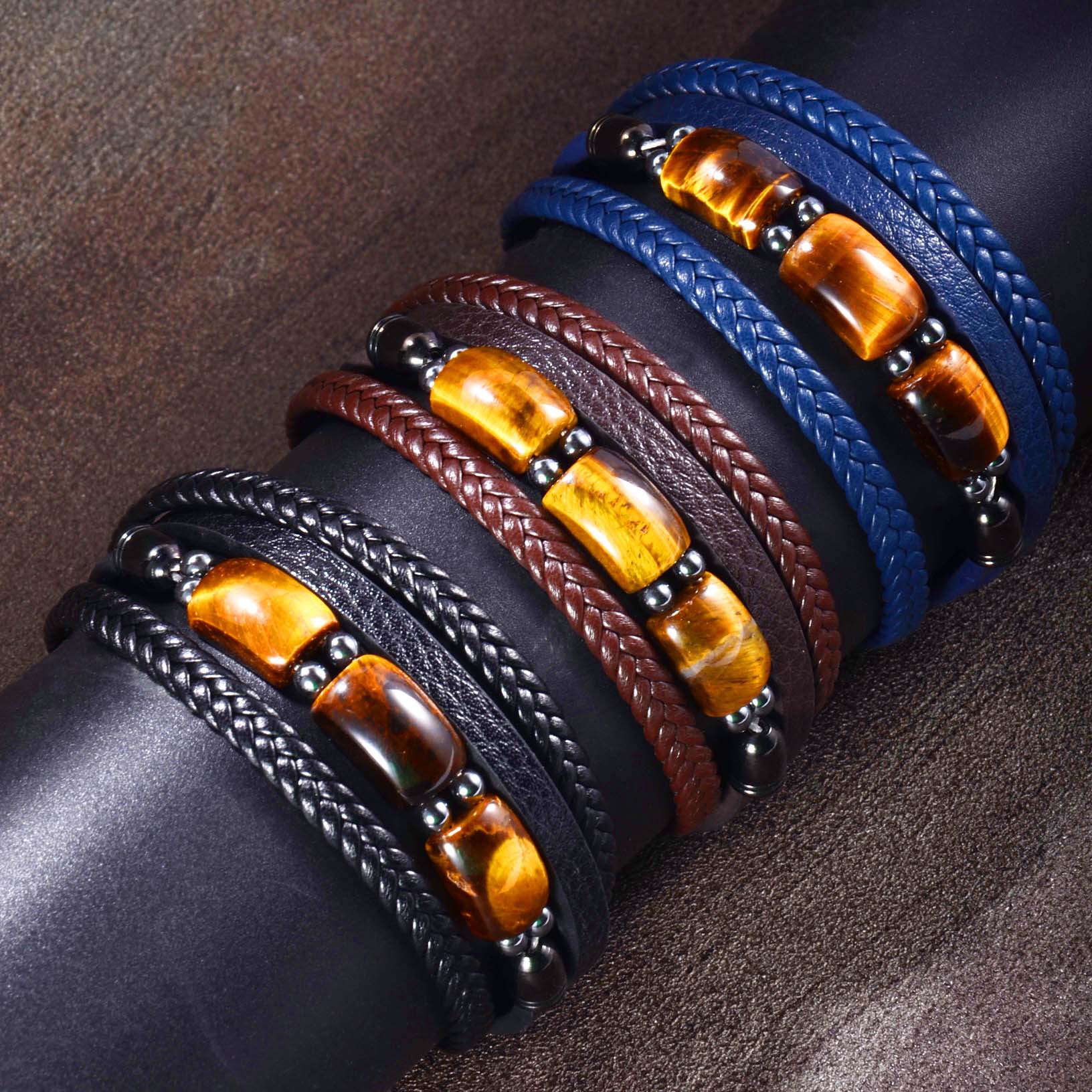 欧美跨境热卖虎眼石手链男多层编织皮绳时尚个性潮流百搭皮革手镯