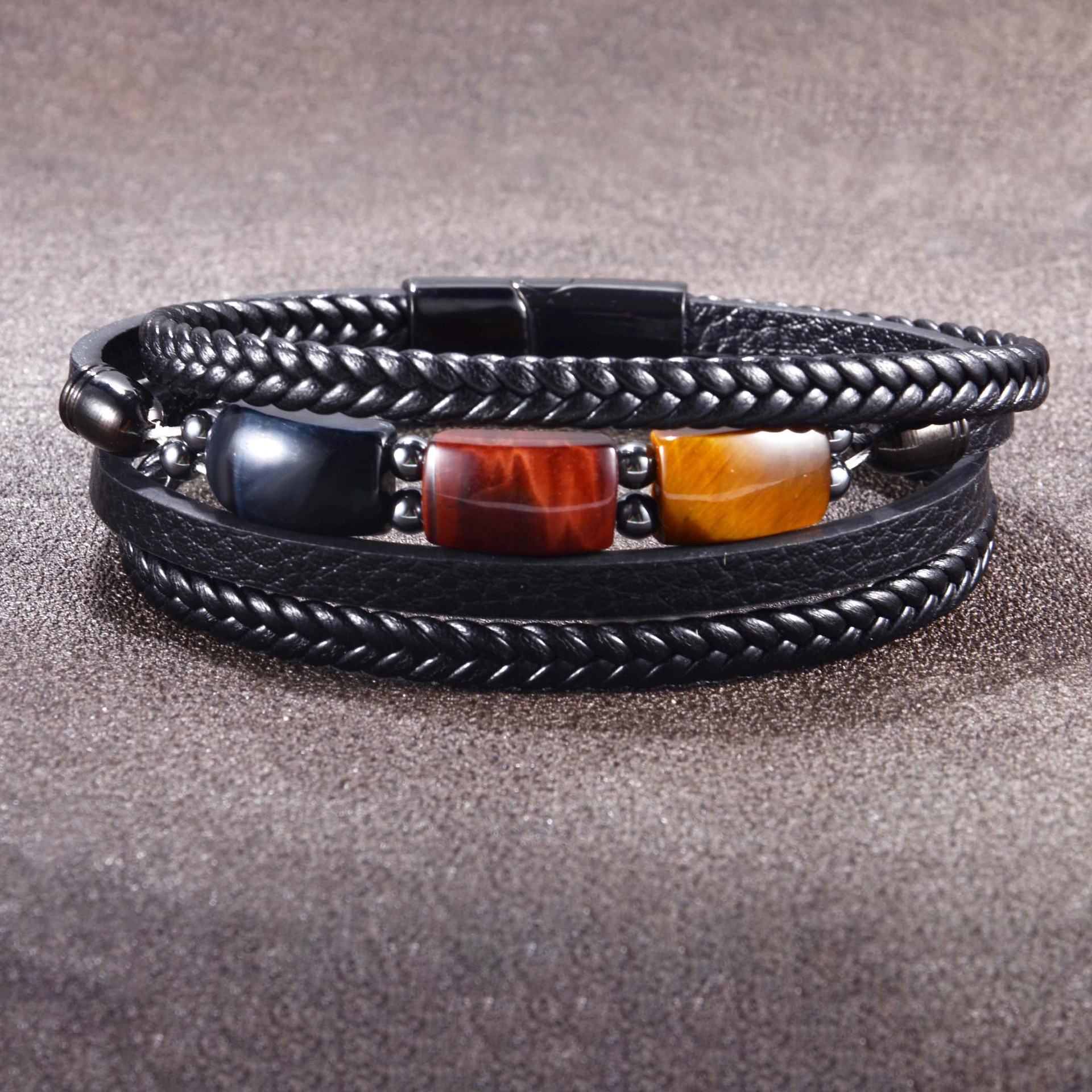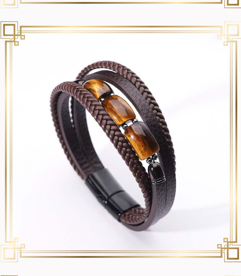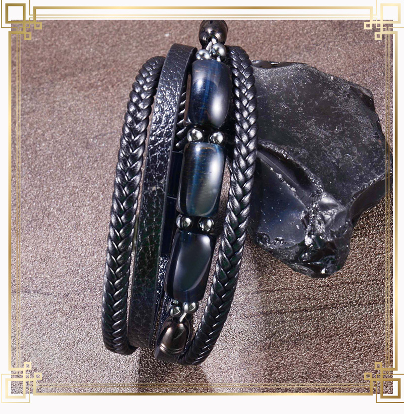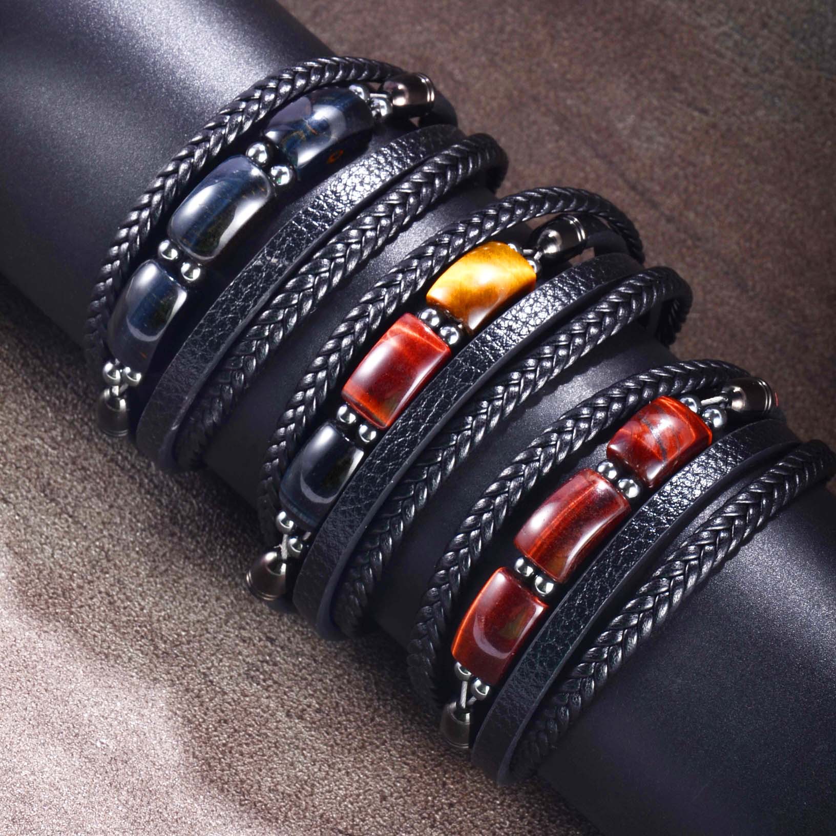 欧美跨境热卖虎眼石手链男多层编织皮绳时尚个性潮流百搭皮革手镯