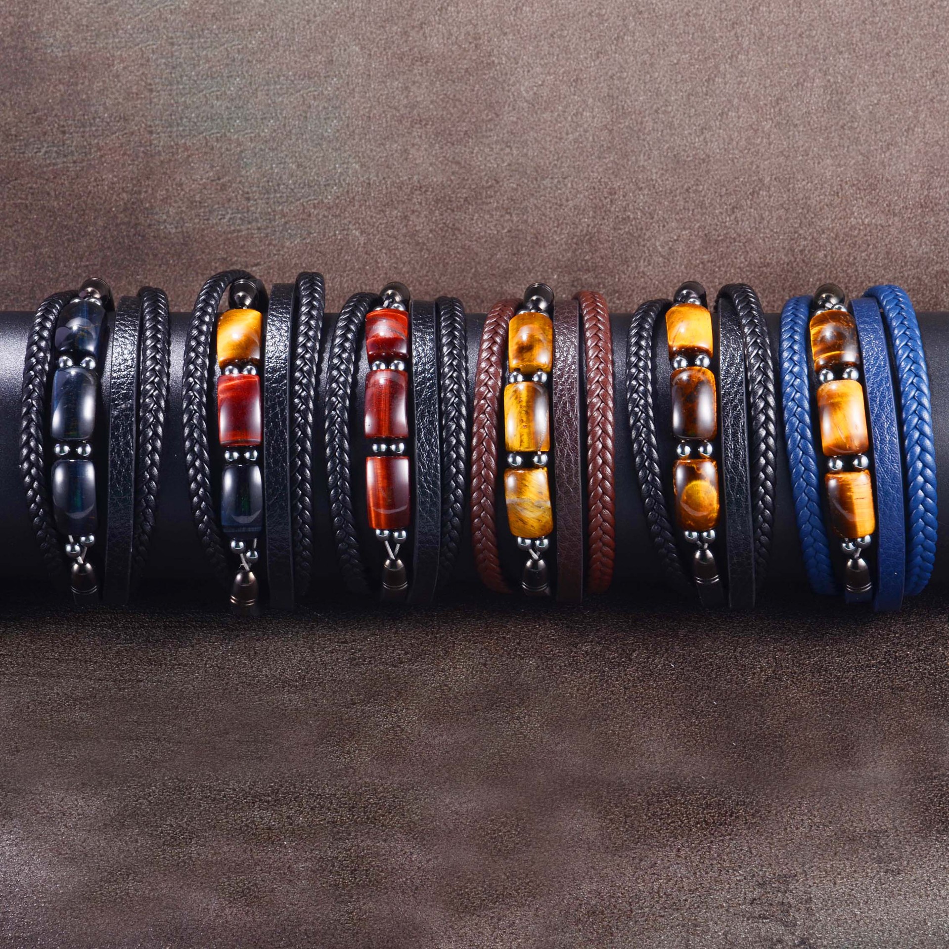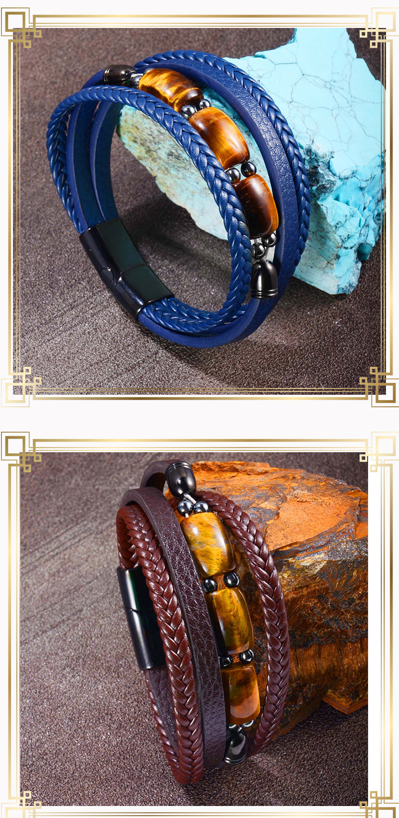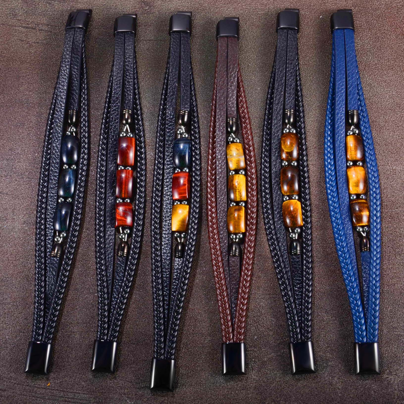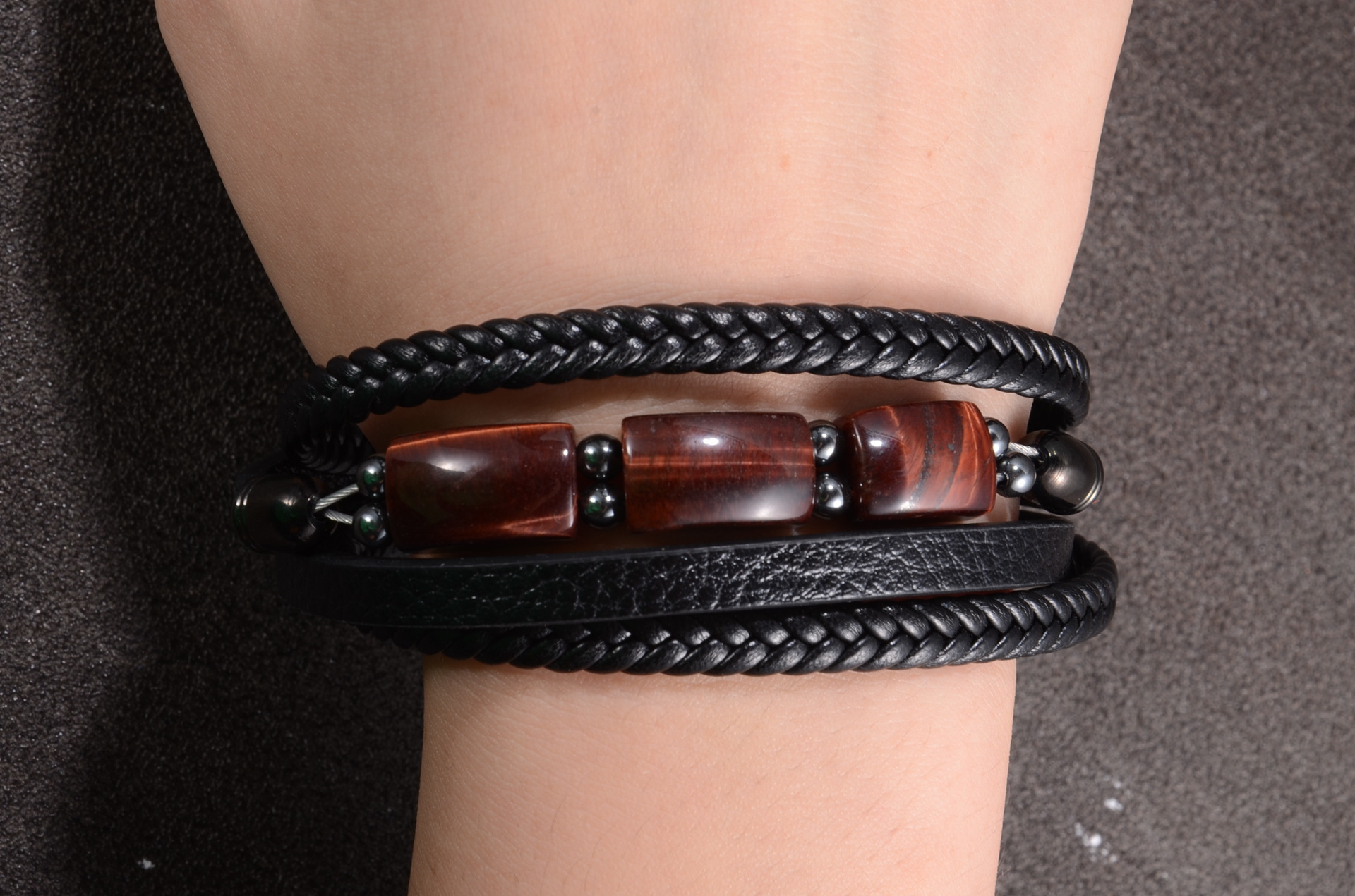 欧美跨境热卖虎眼石手链男多层编织皮绳时尚个性潮流百搭皮革手镯