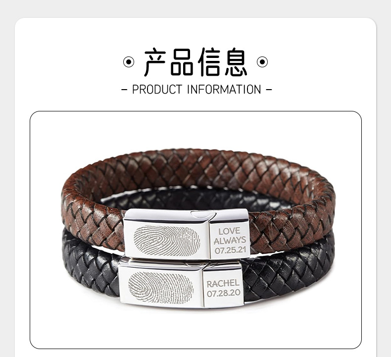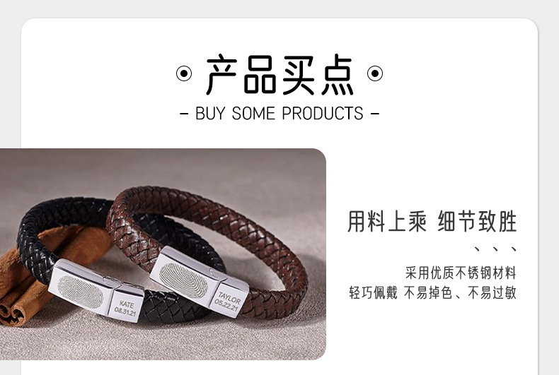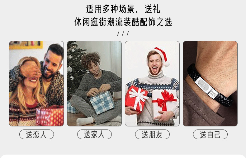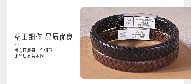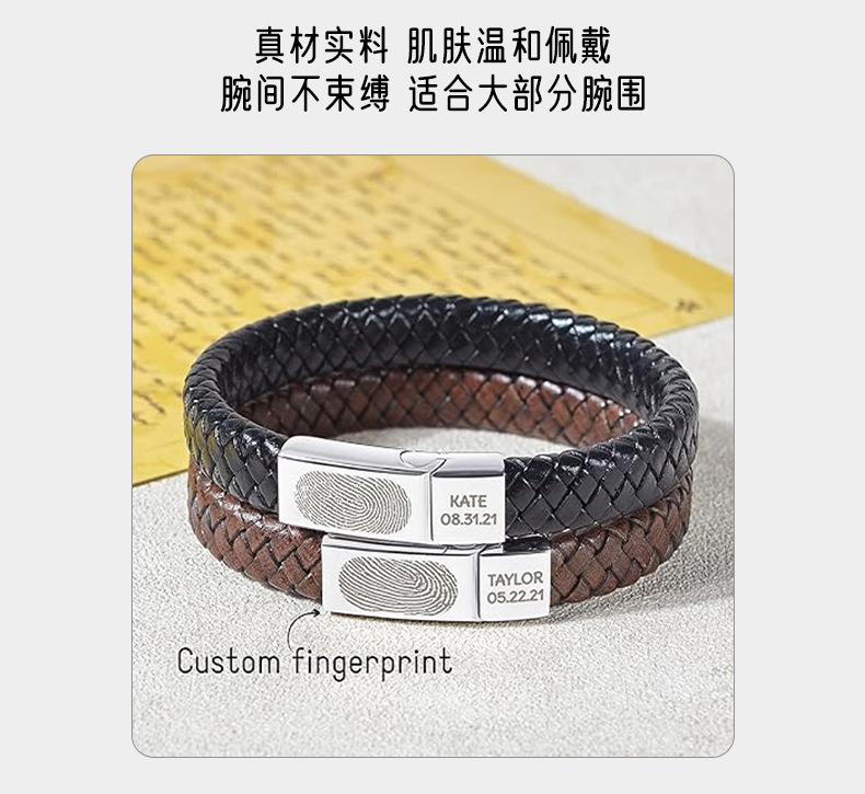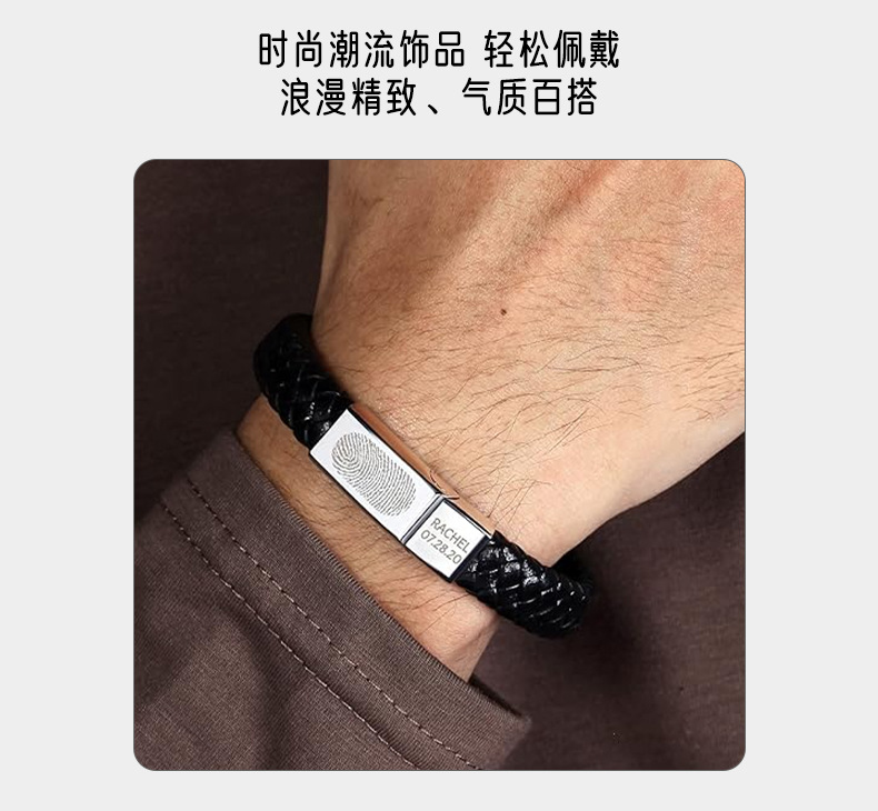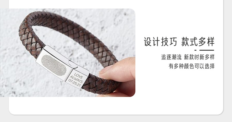 跨境爆款简约手链男士潮 DIY复古手工编织皮革手环刻字不锈钢手镯