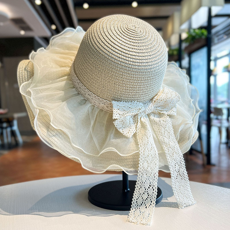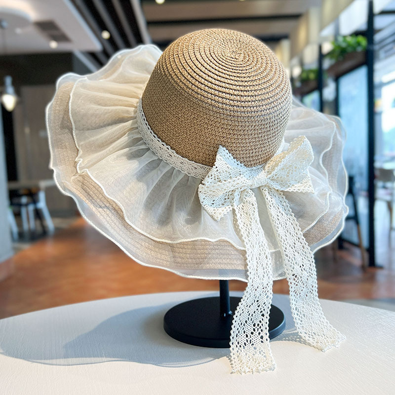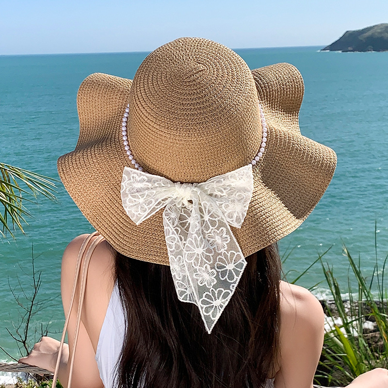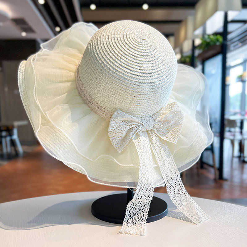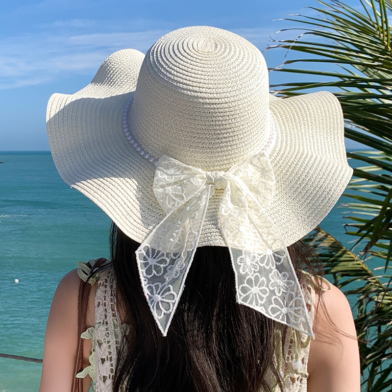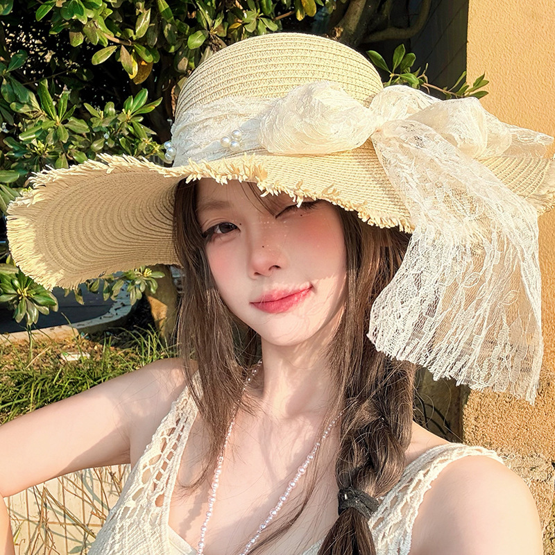 蕾丝蝴蝶结遮阳草帽女夏季大帽檐防紫外线防晒帽海边度假沙滩帽