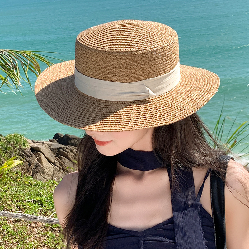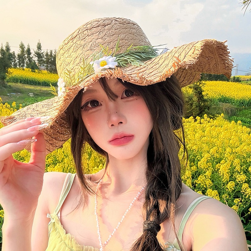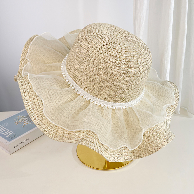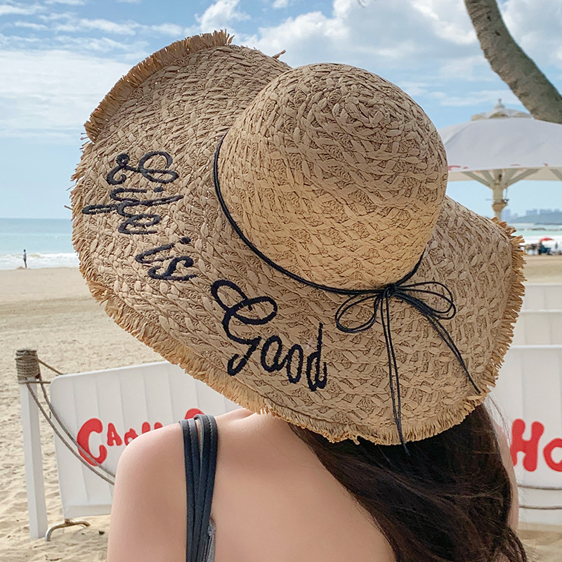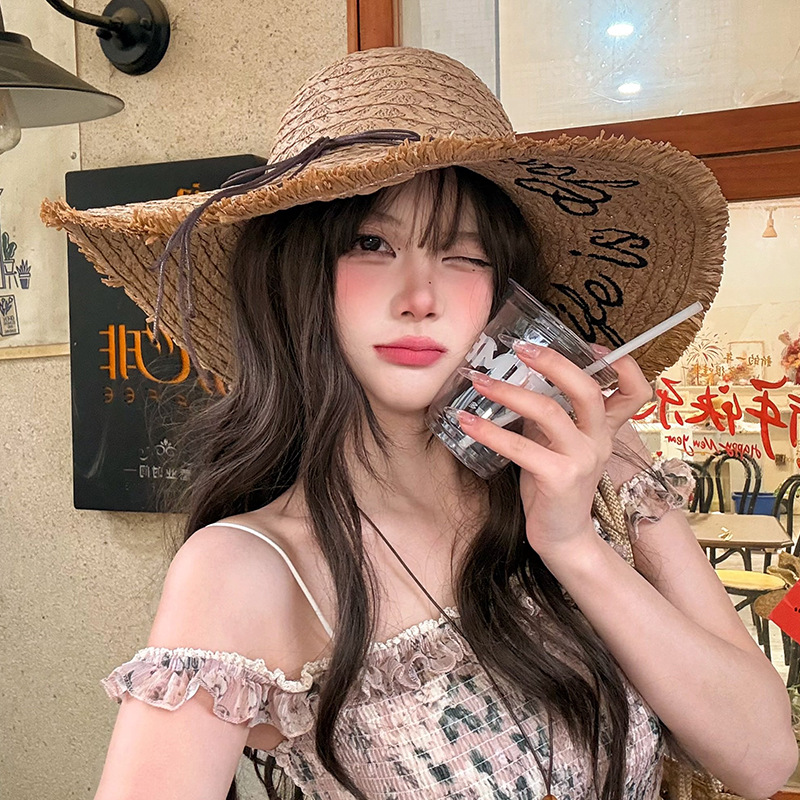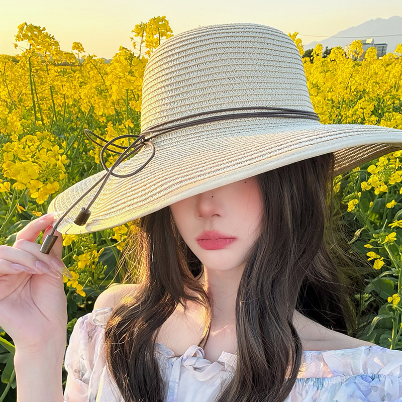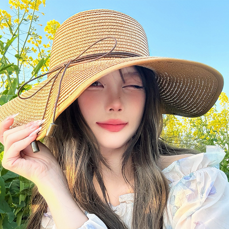 蕾丝蝴蝶结遮阳草帽女夏季大帽檐防紫外线防晒帽海边度假沙滩帽