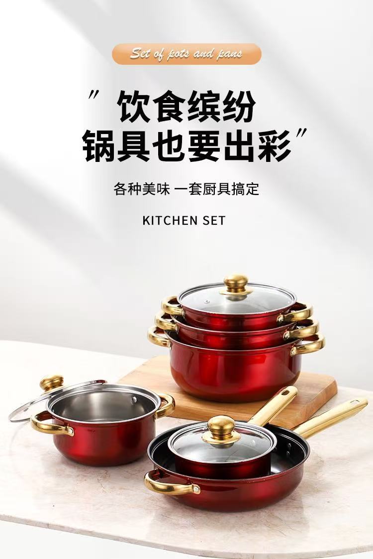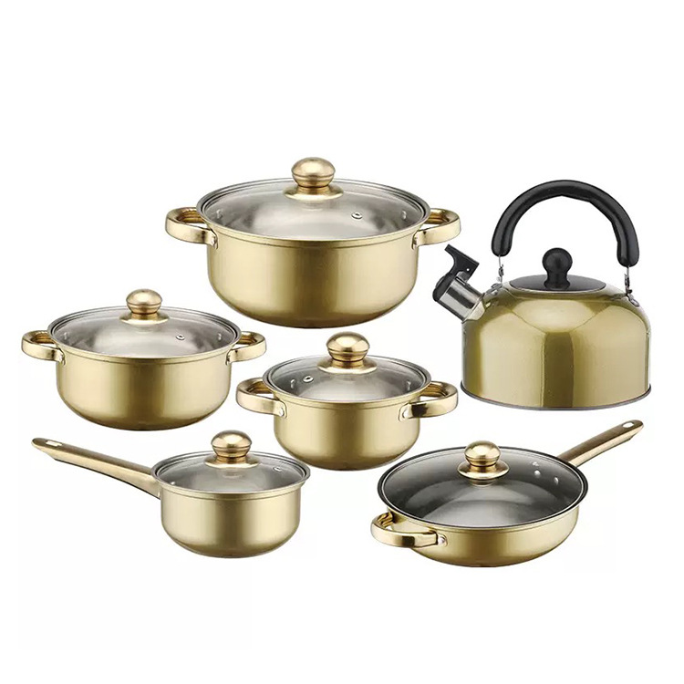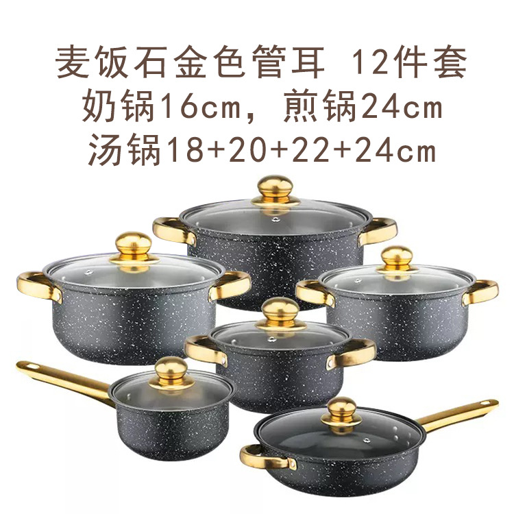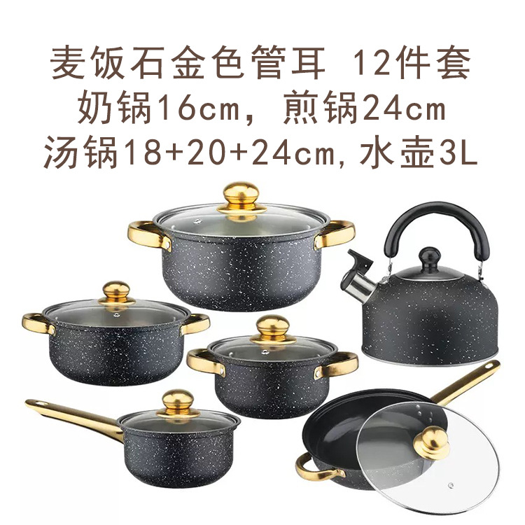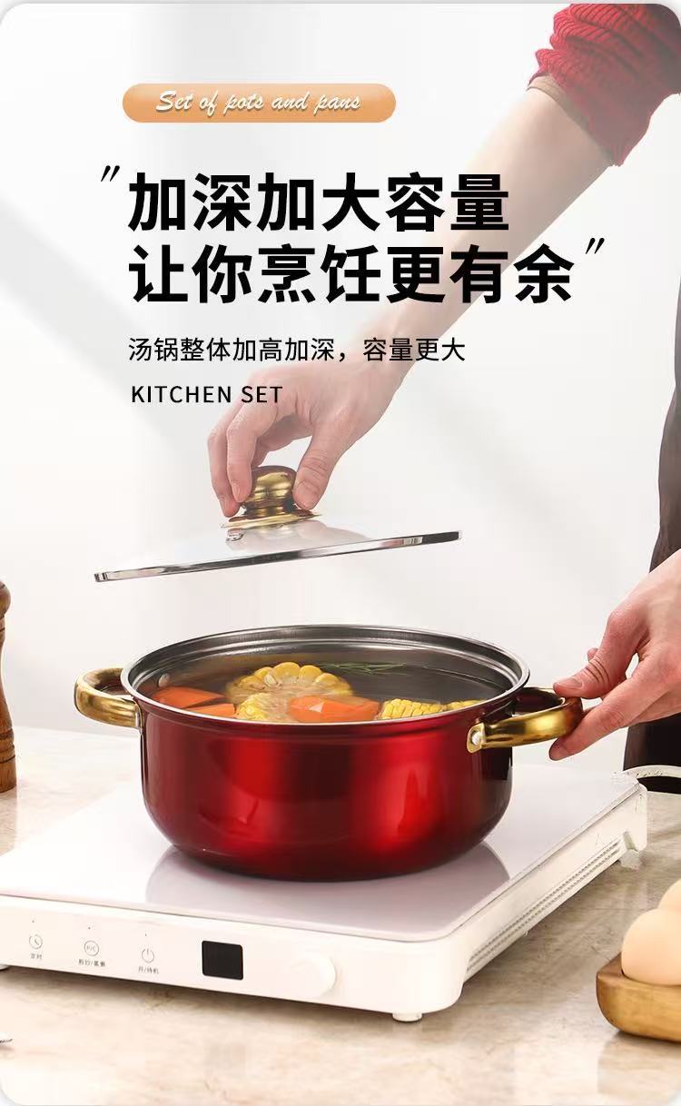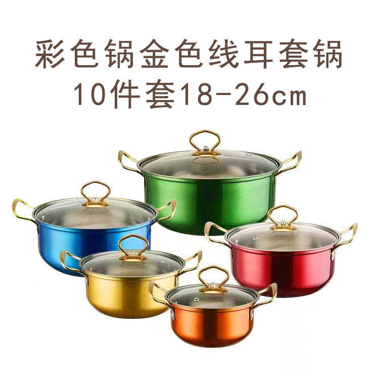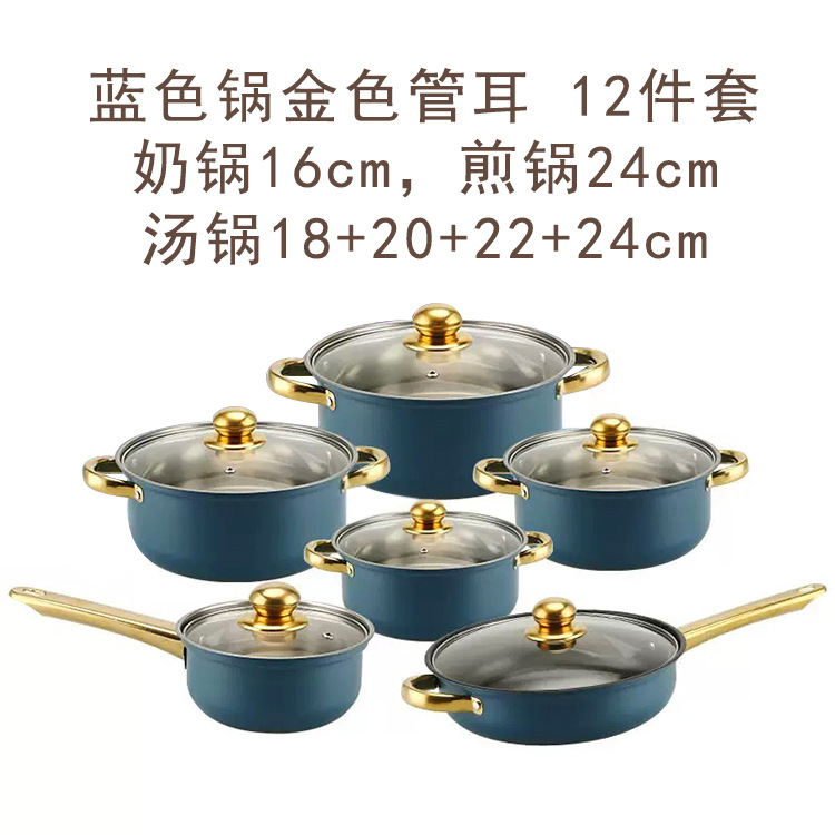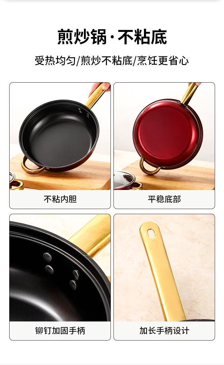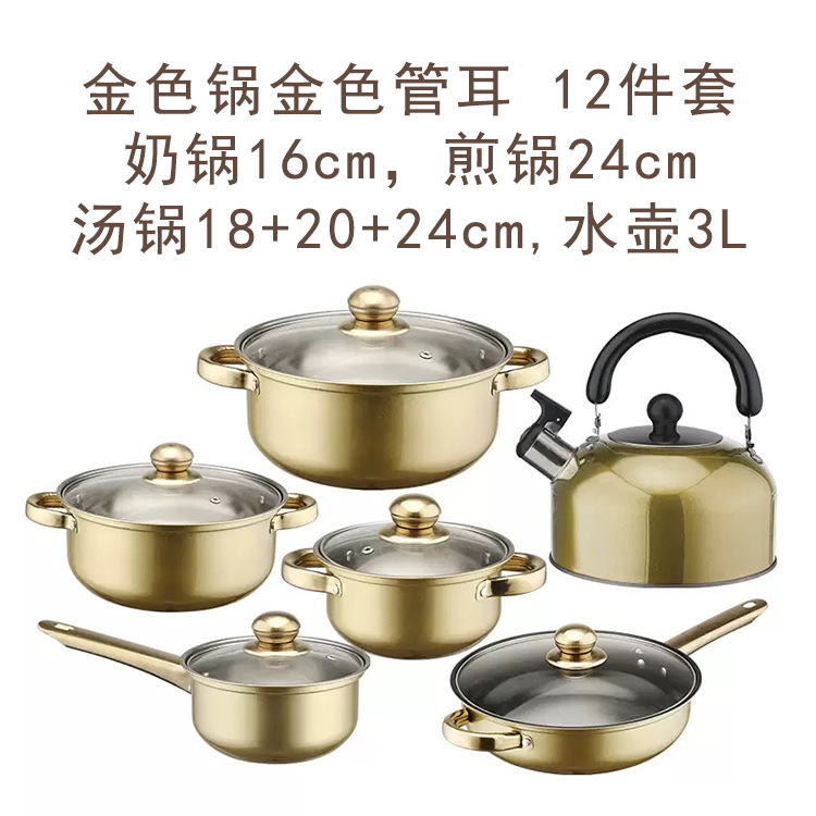 跨境彩色不锈钢套锅不粘锅套装汤锅奶锅煎锅12件套锅具金色手柄