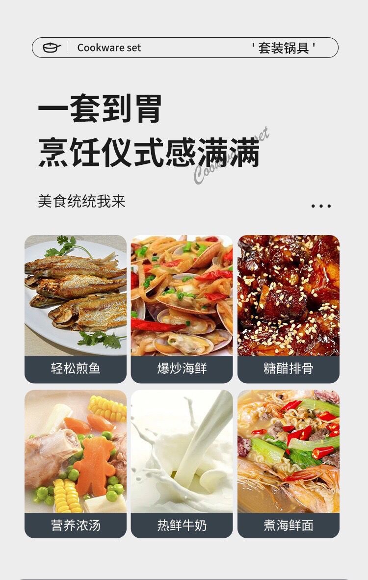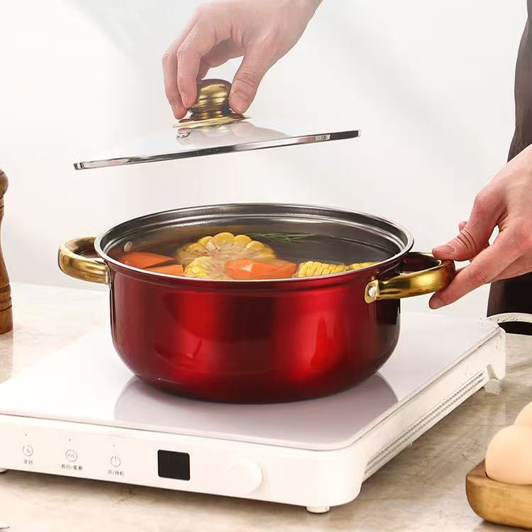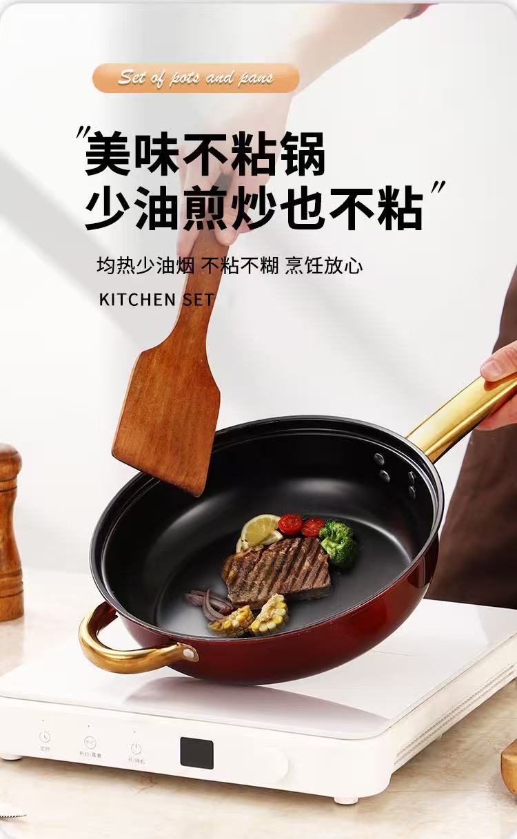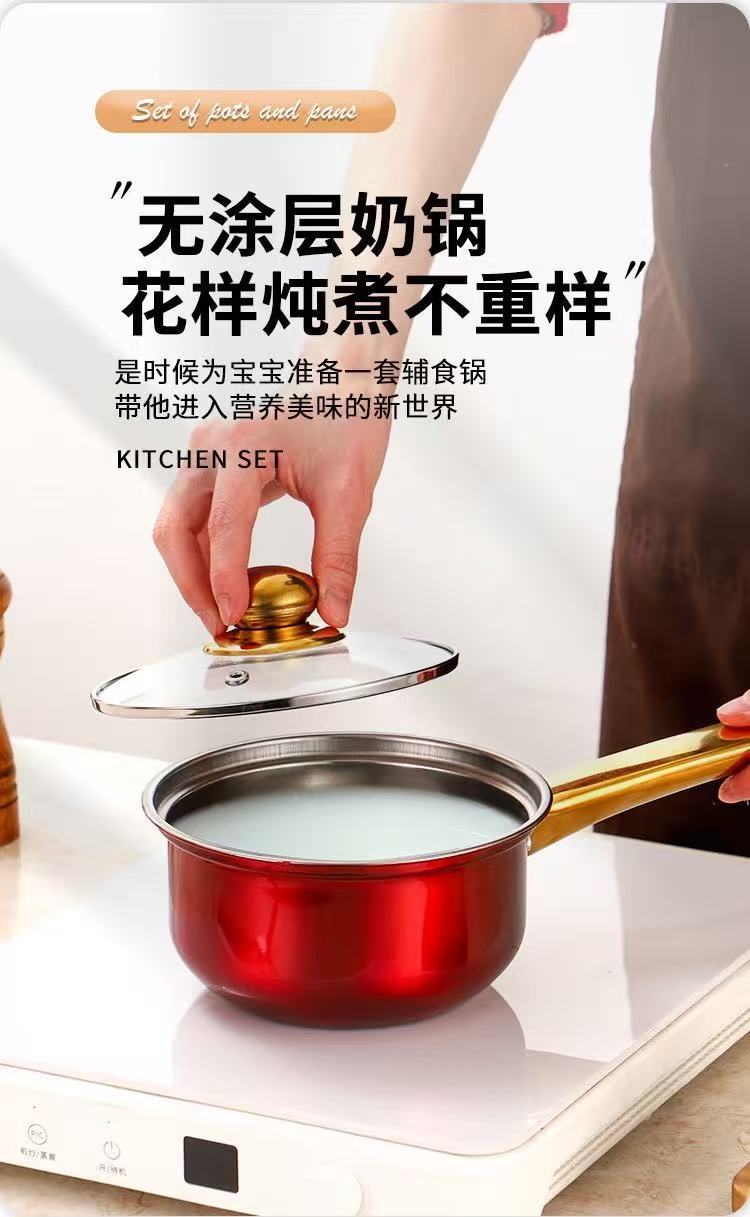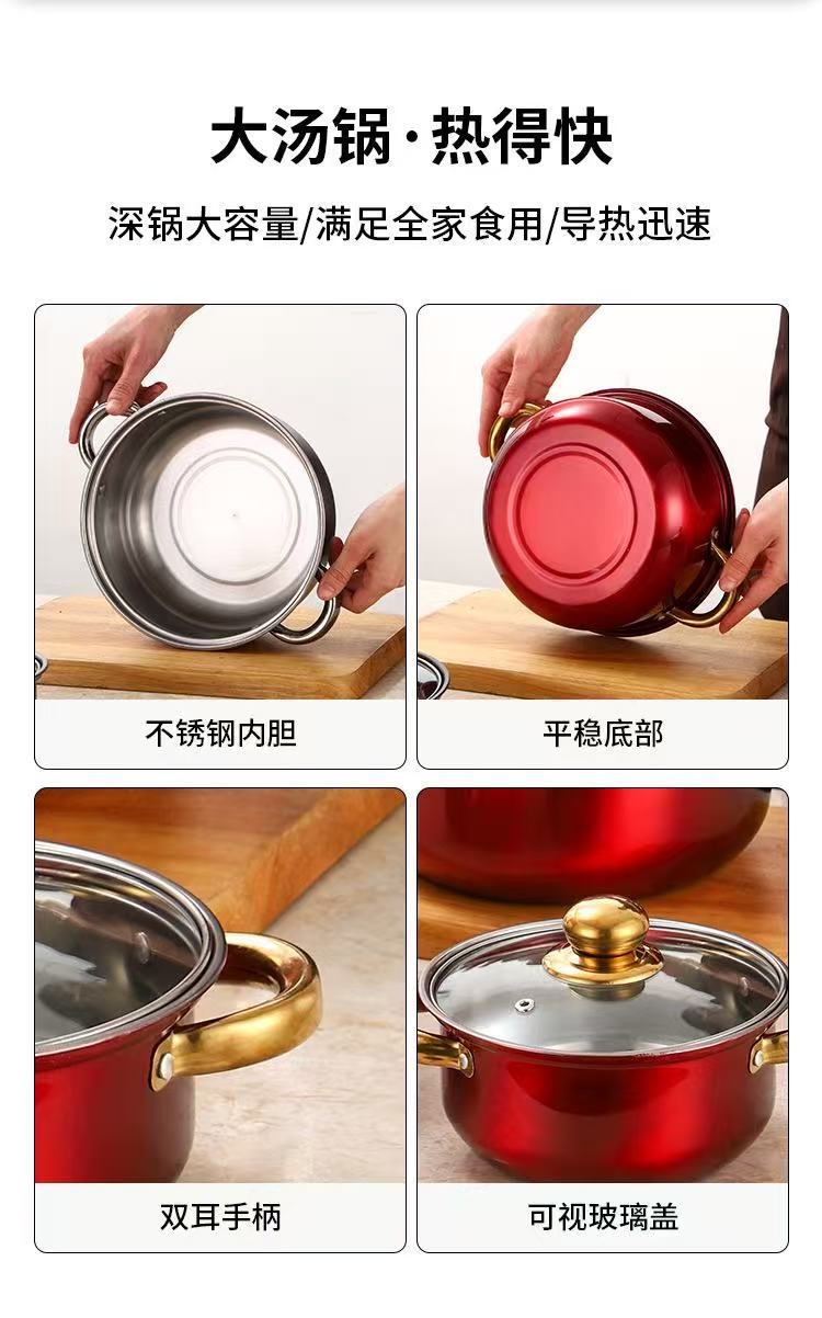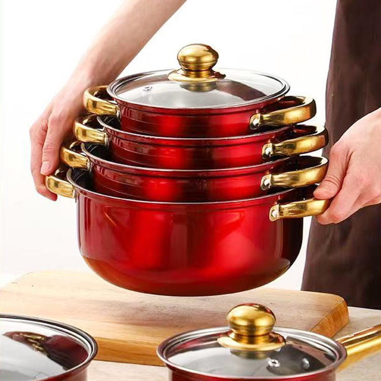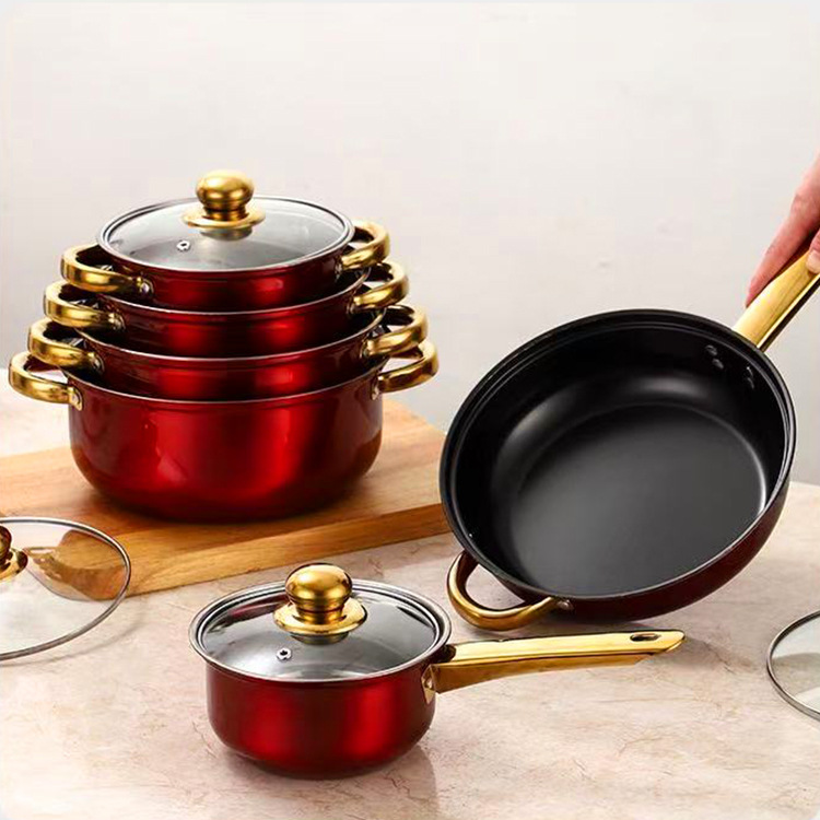 跨境彩色不锈钢套锅不粘锅套装汤锅奶锅煎锅12件套锅具金色手柄