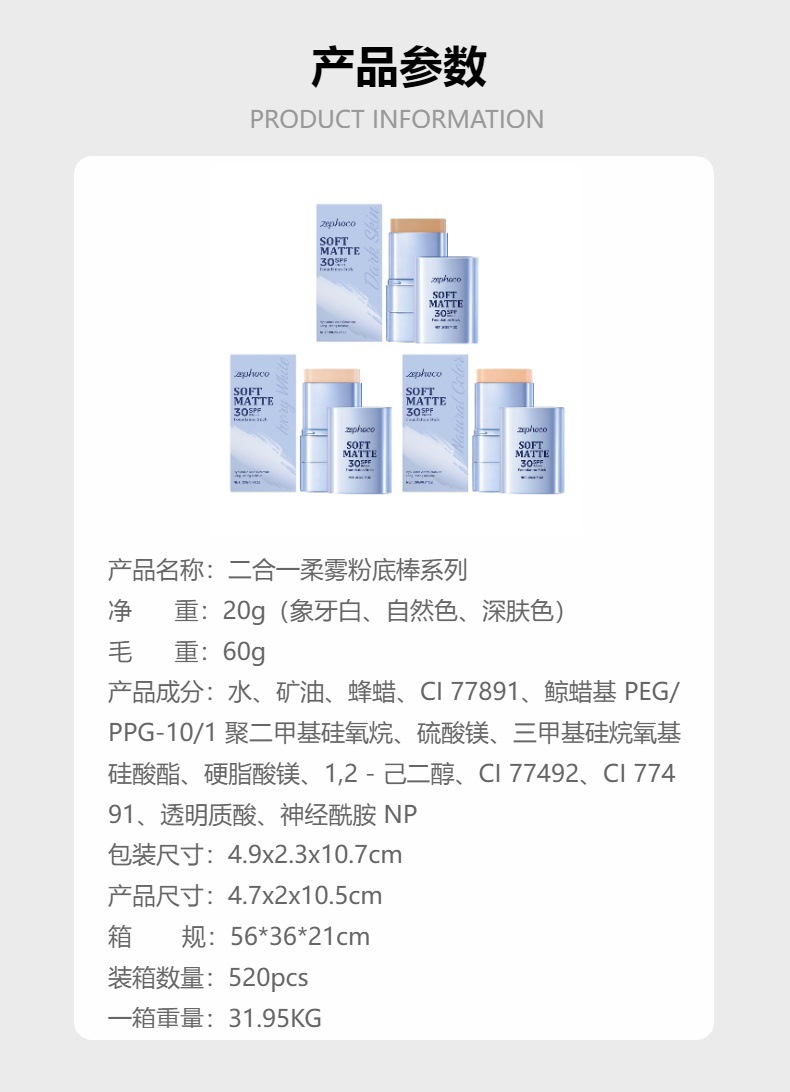 zephoco二合一柔雾粉底棒系列 轻盈质地丝滑贴肤细腻自然服帖底妆