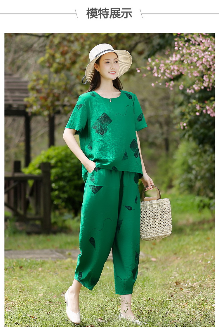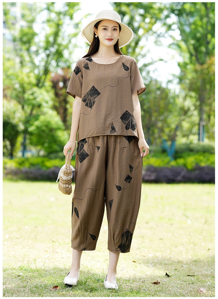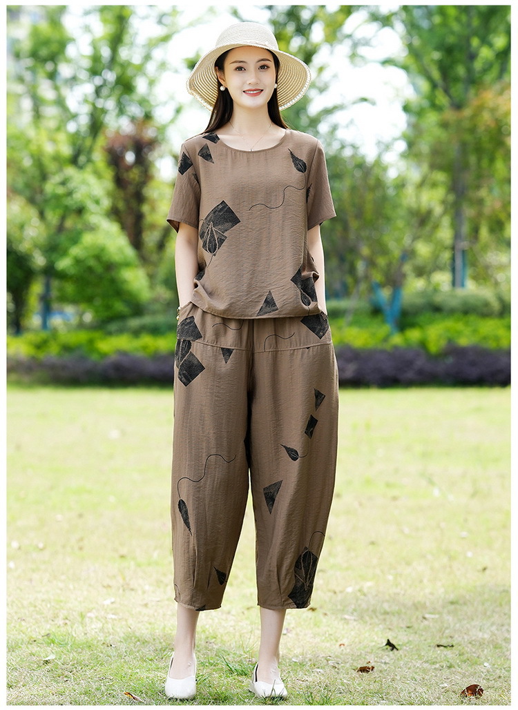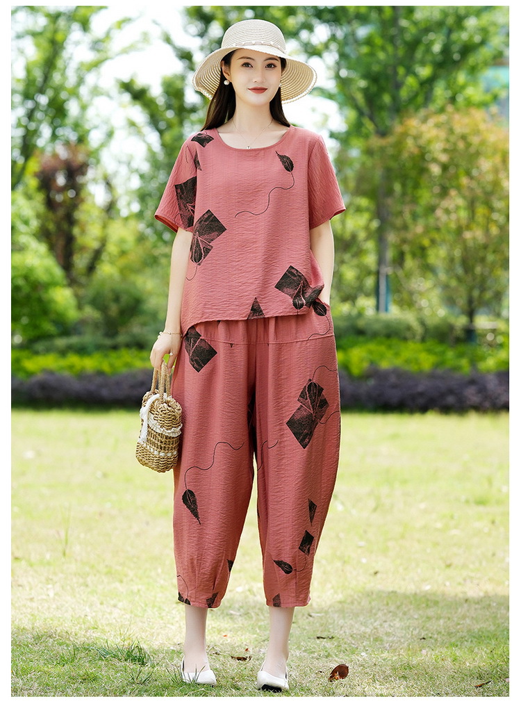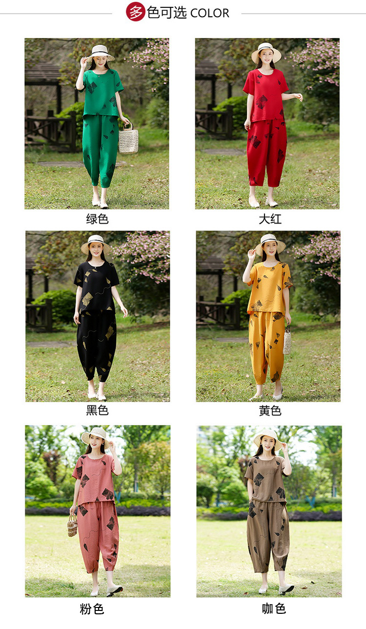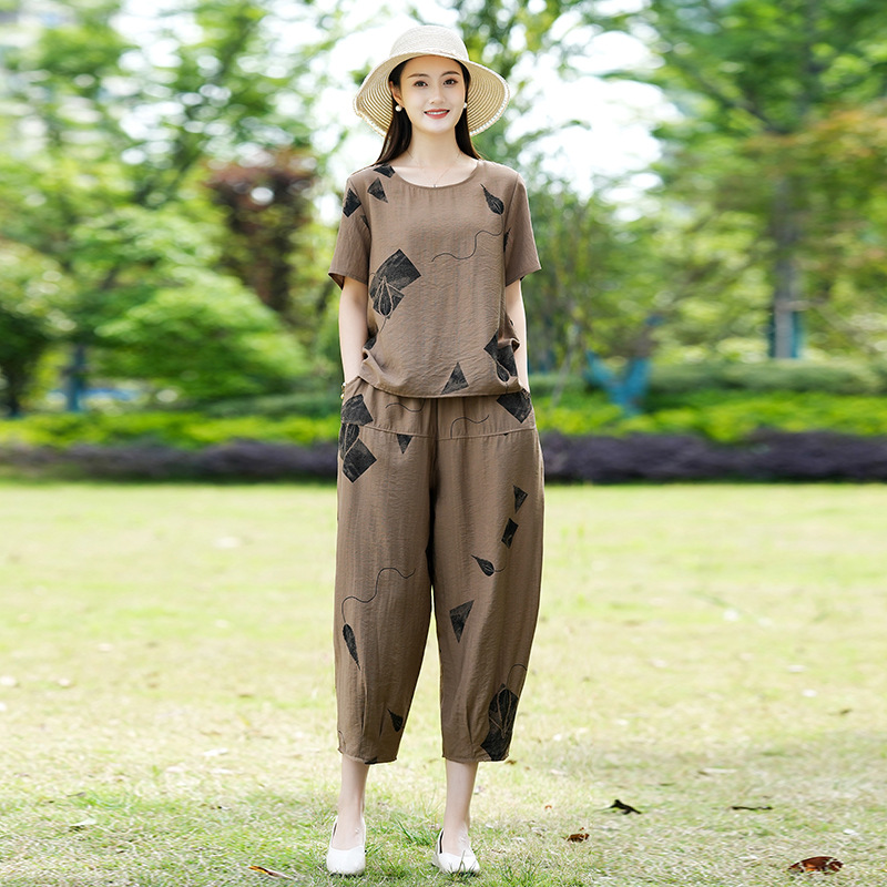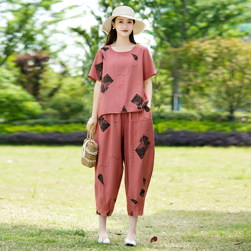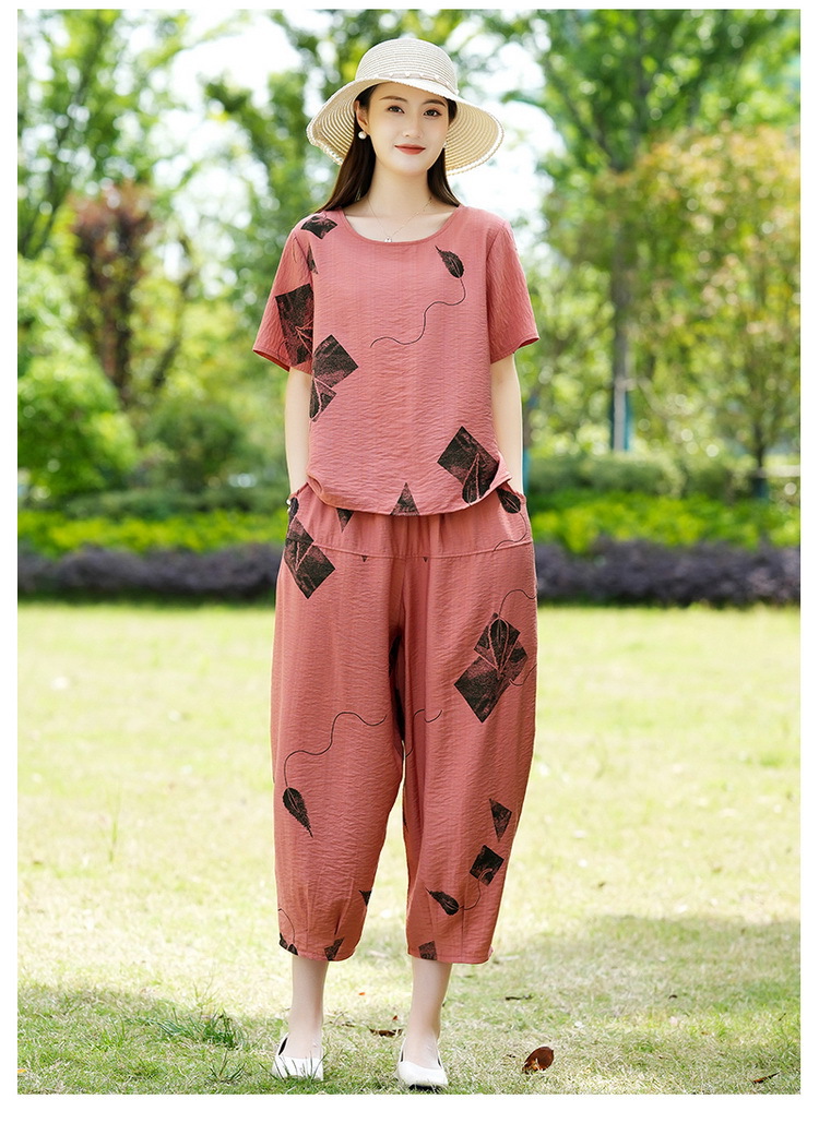 2025新款洋气妈妈夏装套装中老年女装短袖t恤中年棉麻上衣两件套