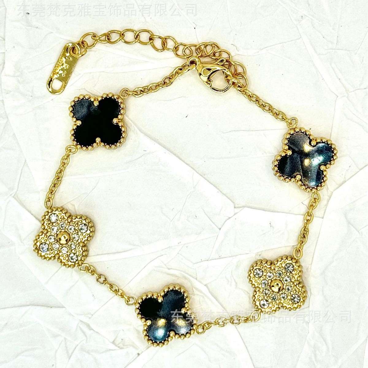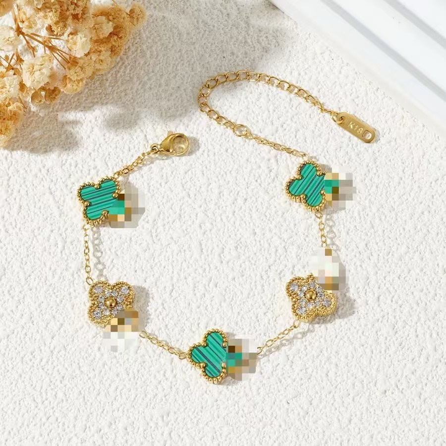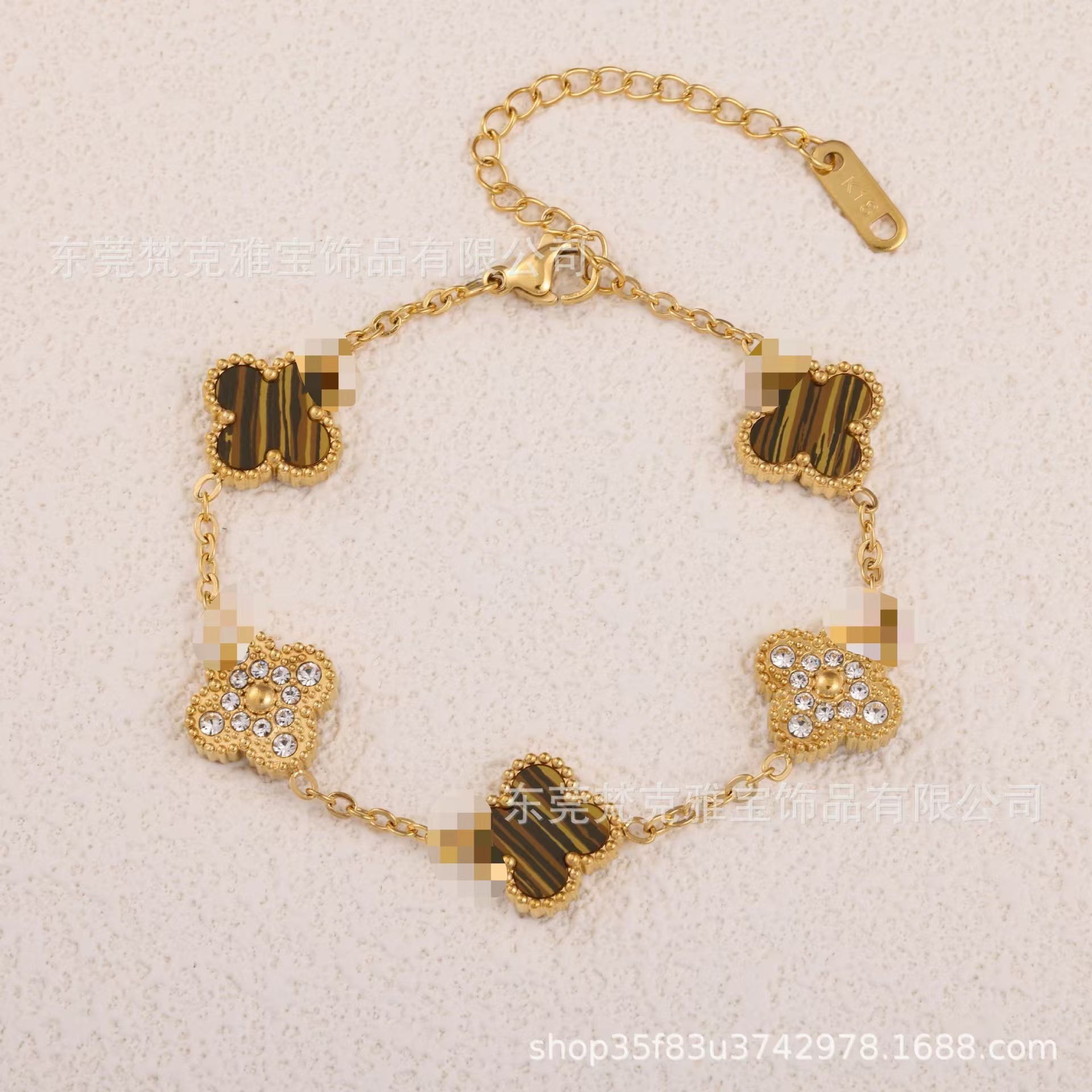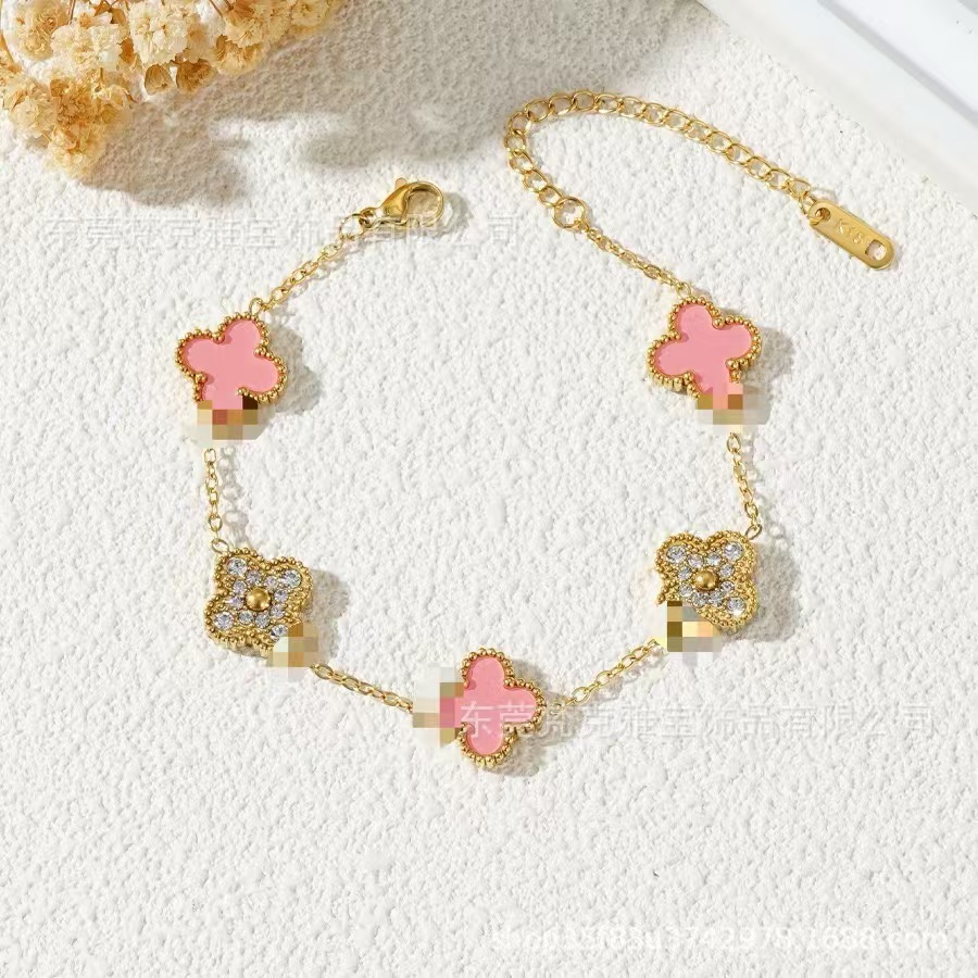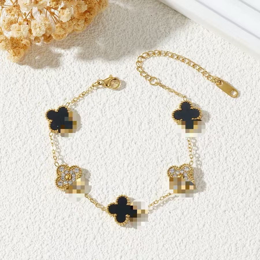 厂家直销四叶草镶钻五花手链女真空电镀18K金五花满钻手链不掉色