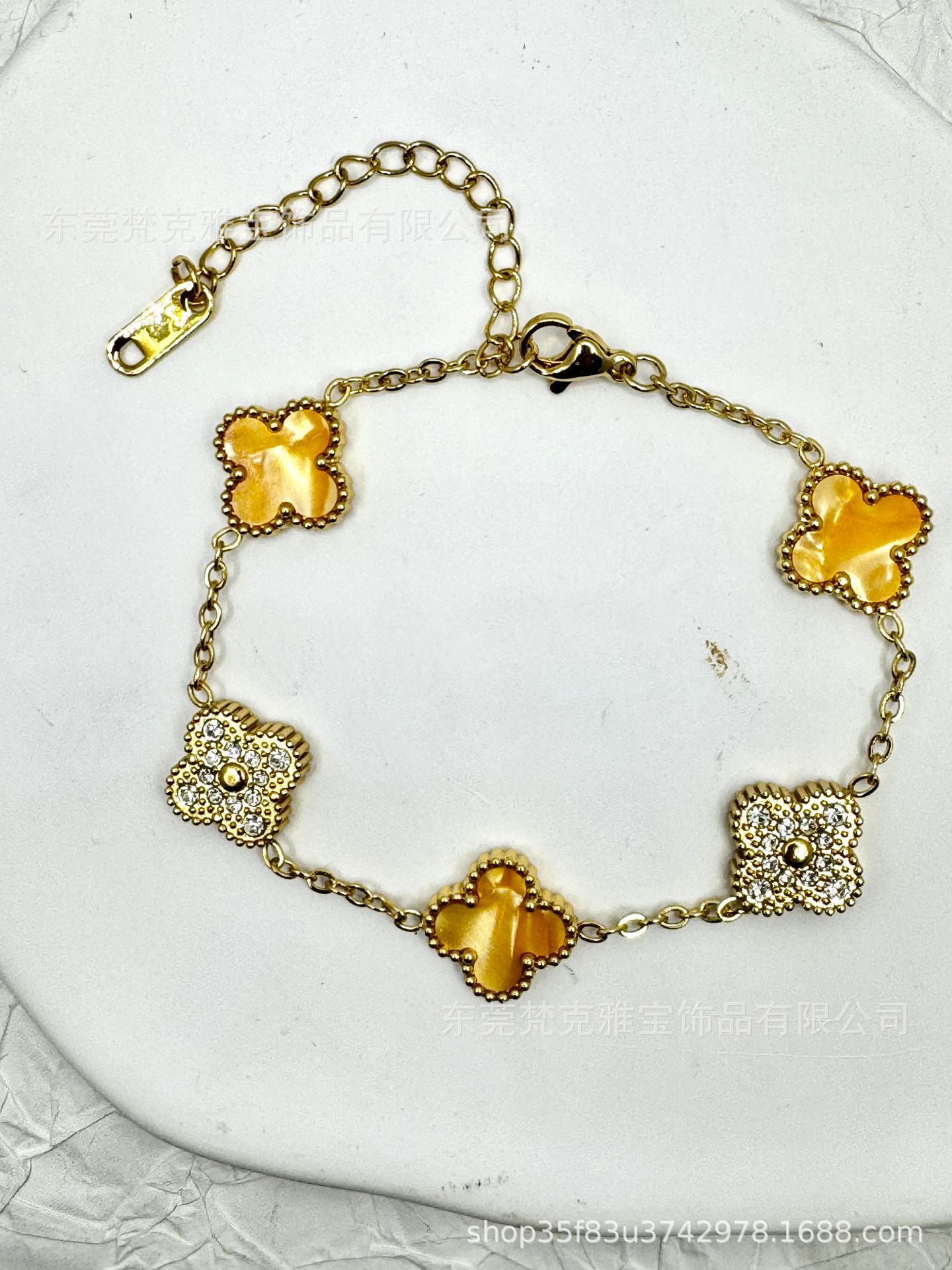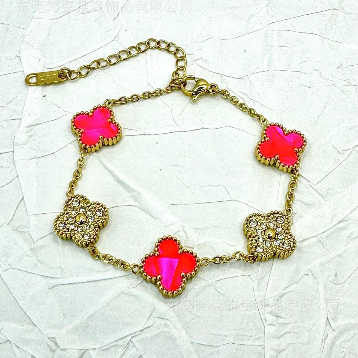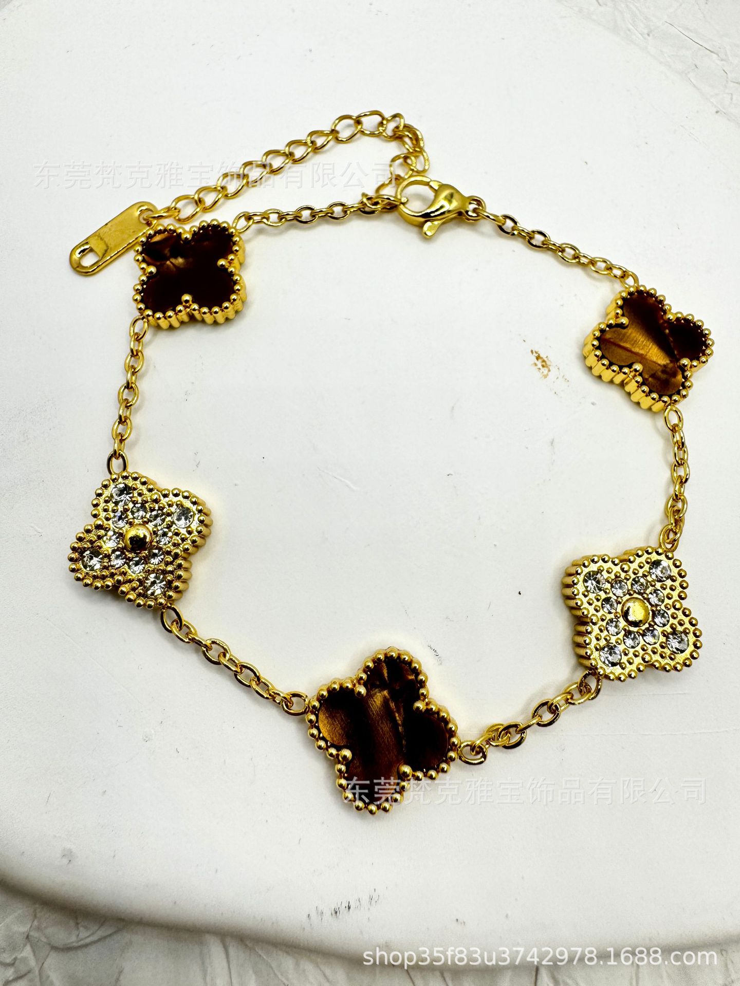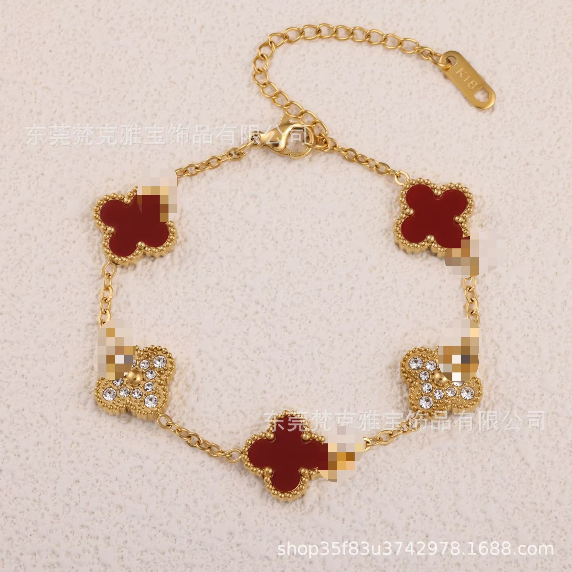 厂家直销四叶草镶钻五花手链女真空电镀18K金五花满钻手链不掉色