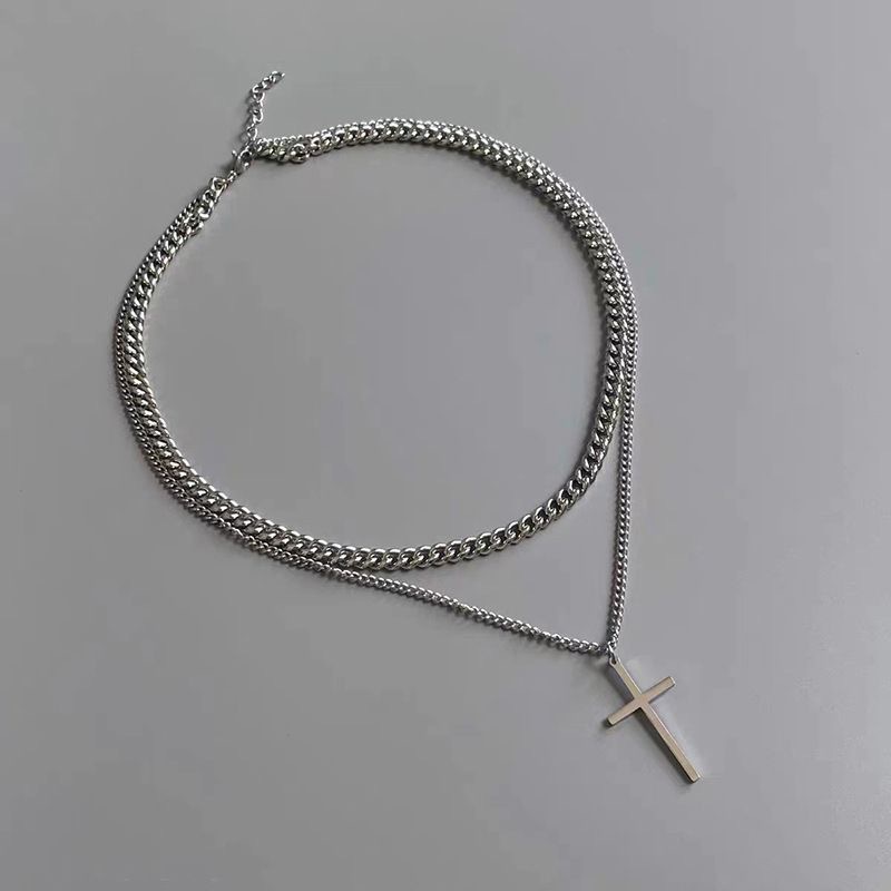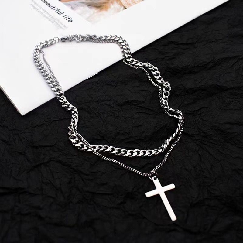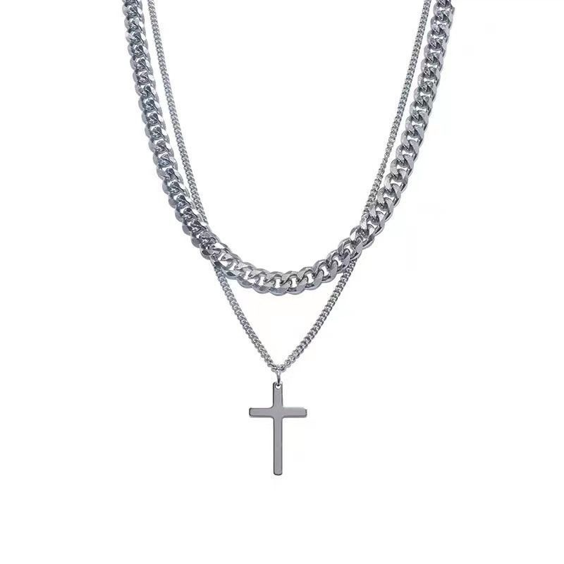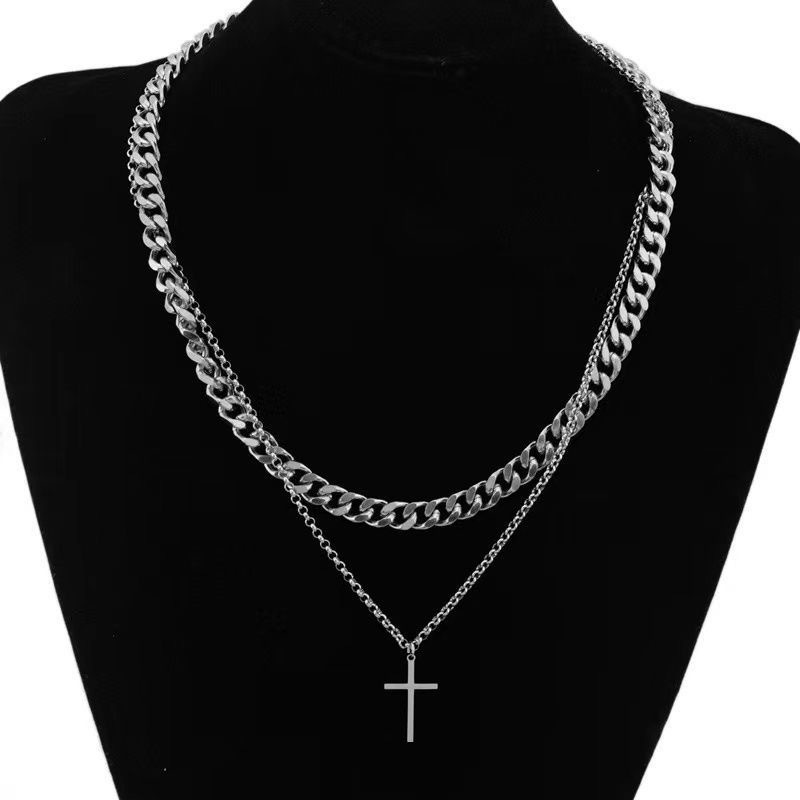 双层叠戴十字架项链男潮嘻哈高街古巴链钛钢不掉色小众设计感吊坠