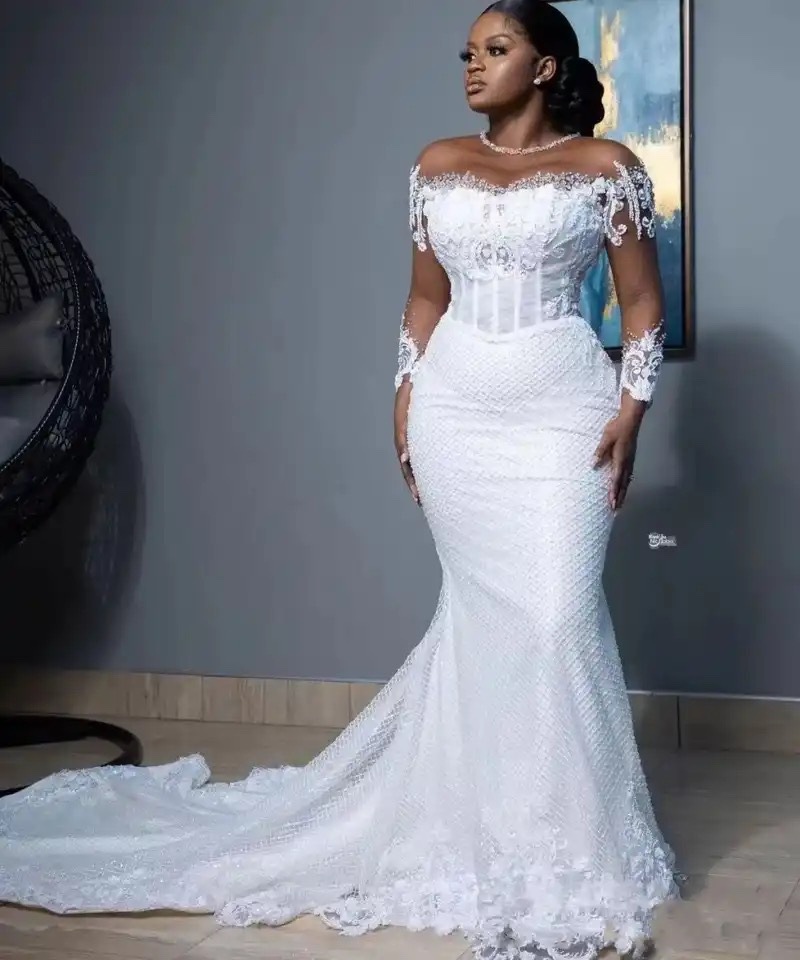 鱼尾婚纱2026新款气质白色收腰一字肩拖尾非洲新娘婚纱出门迎宾裙
