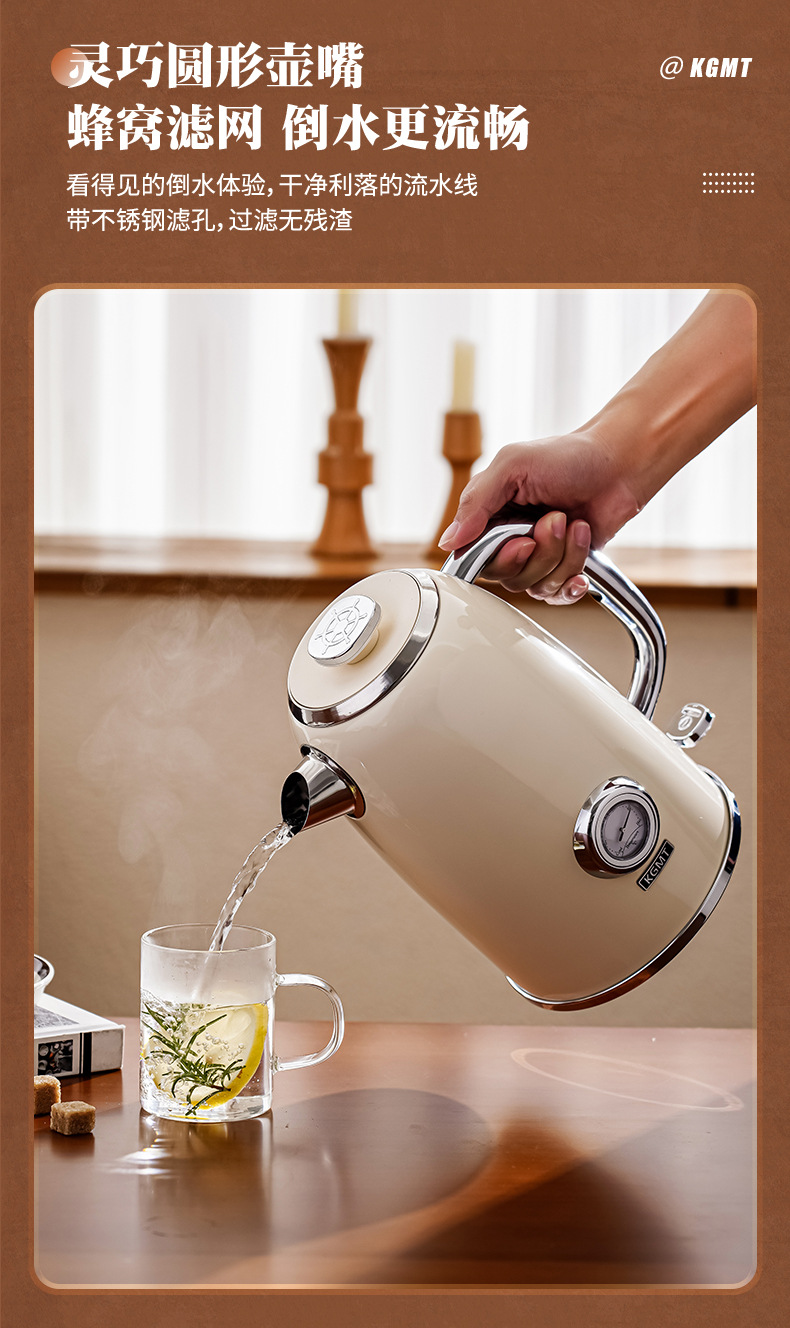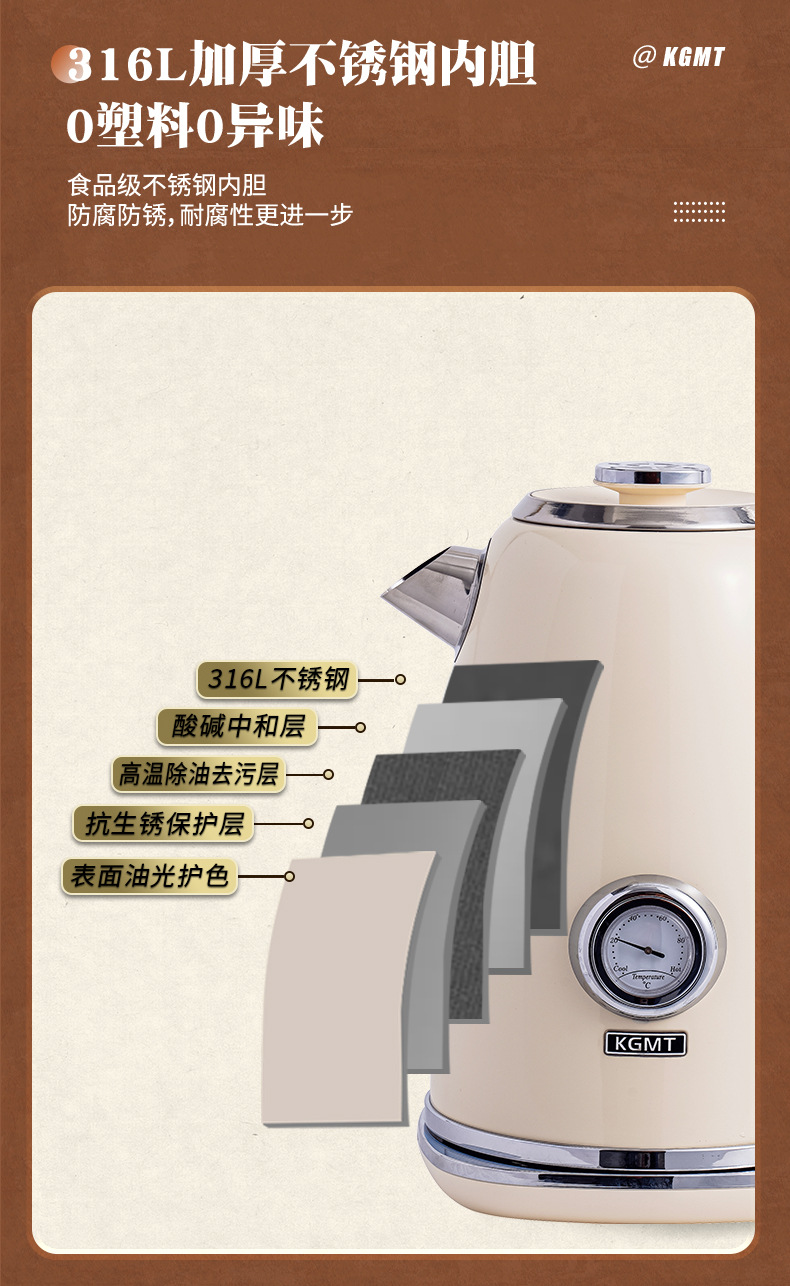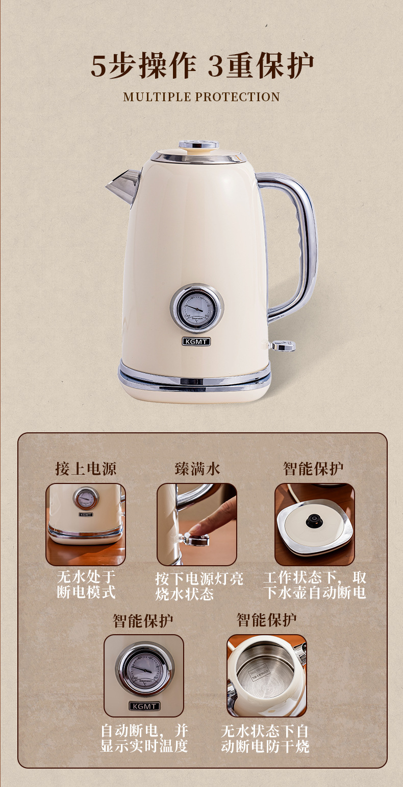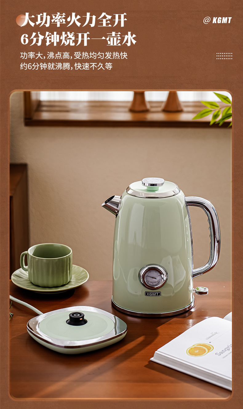 英国KGMT电热水壶复古家用316不锈钢内胆1.8升烧水壶开水壶电水壶