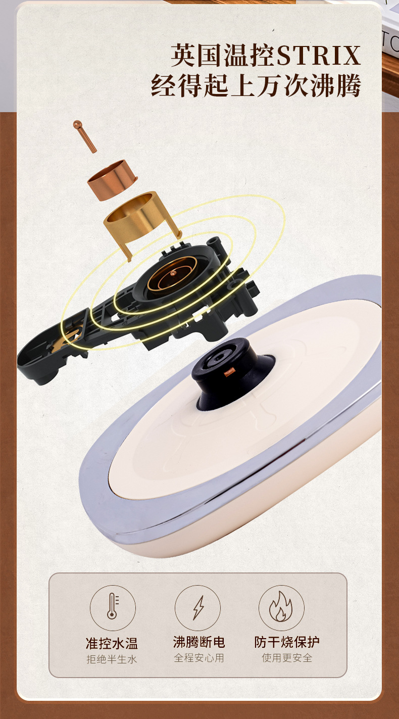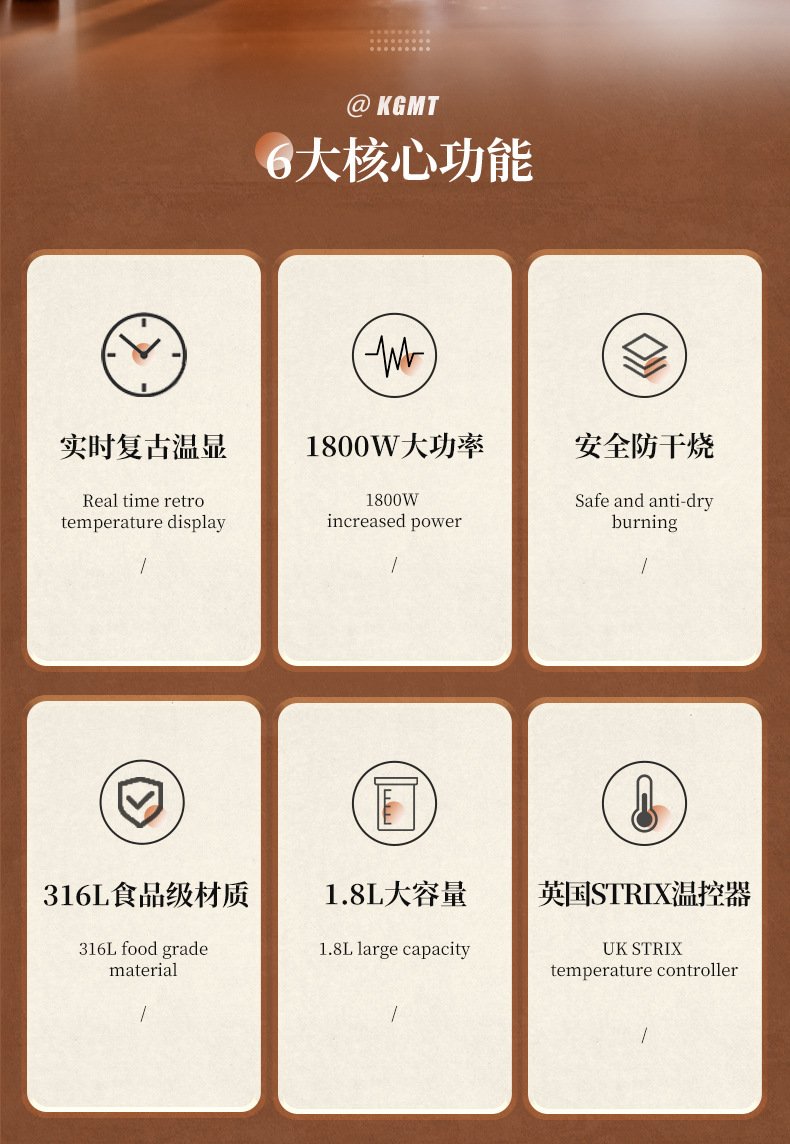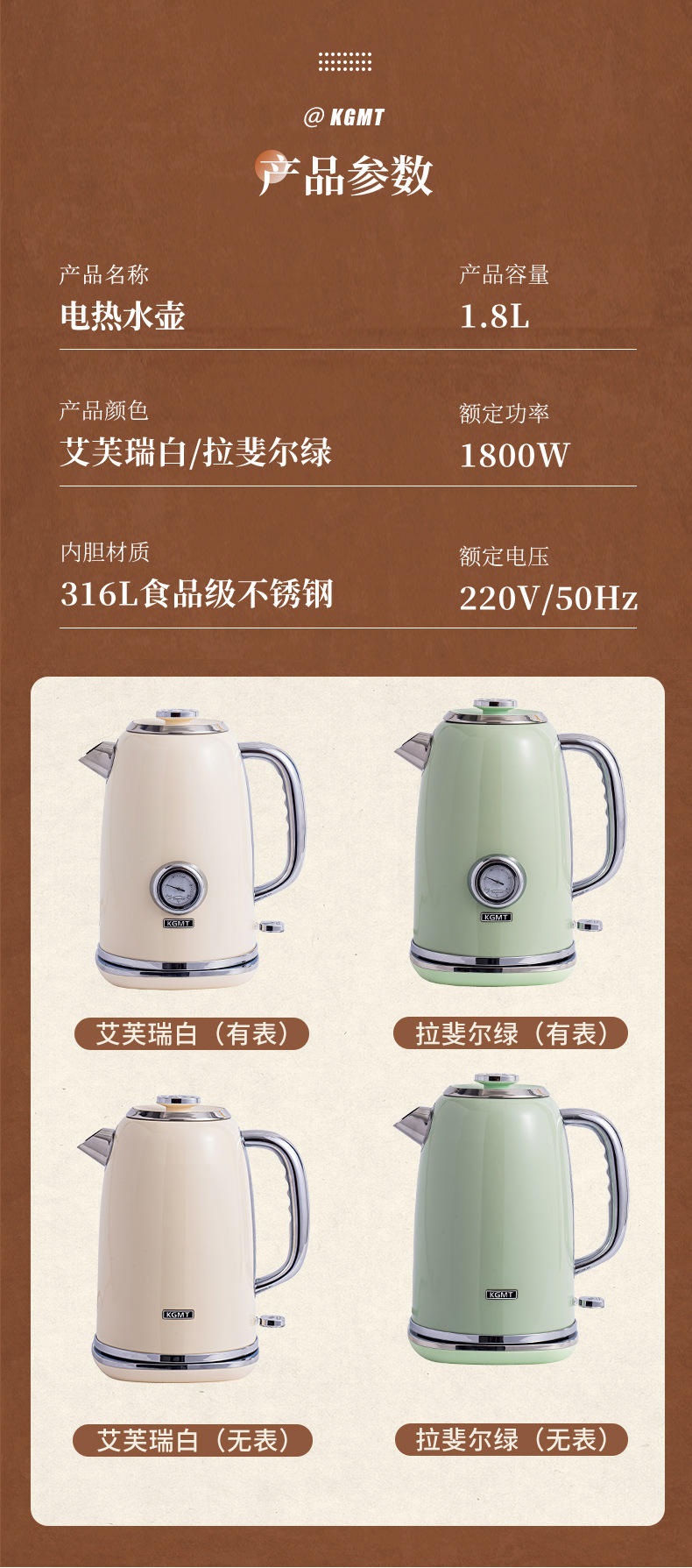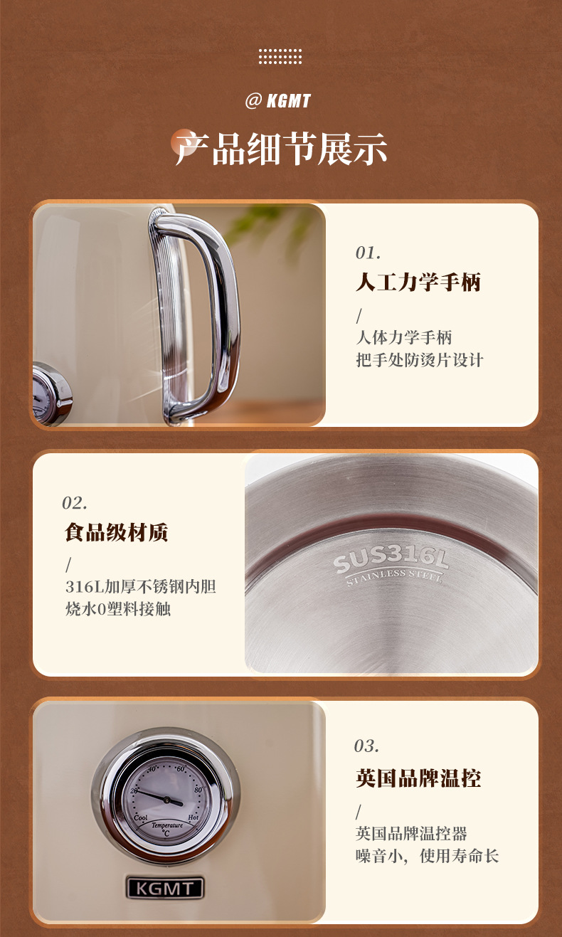 英国KGMT电热水壶复古家用316不锈钢内胆1.8升烧水壶开水壶电水壶