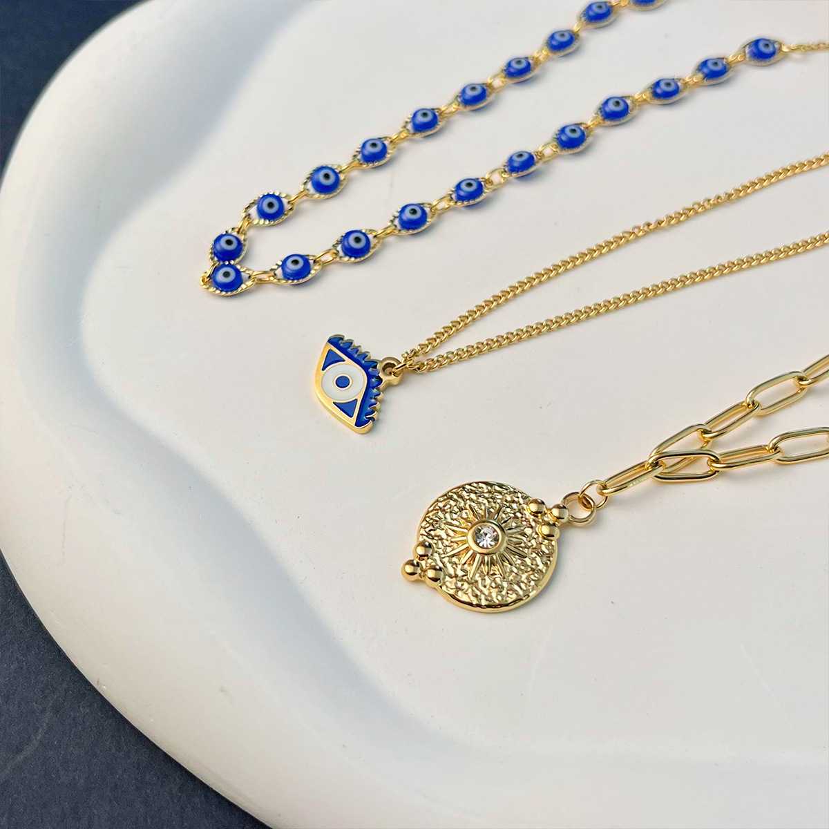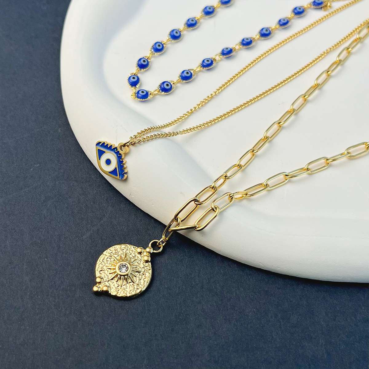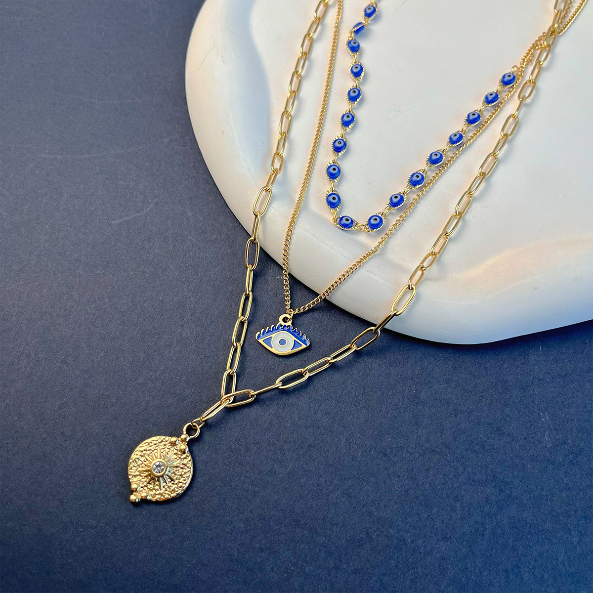 跨境外贸爆款个性三层叠戴锁骨链爱心粘钻恶魔之眼耳环项链复古