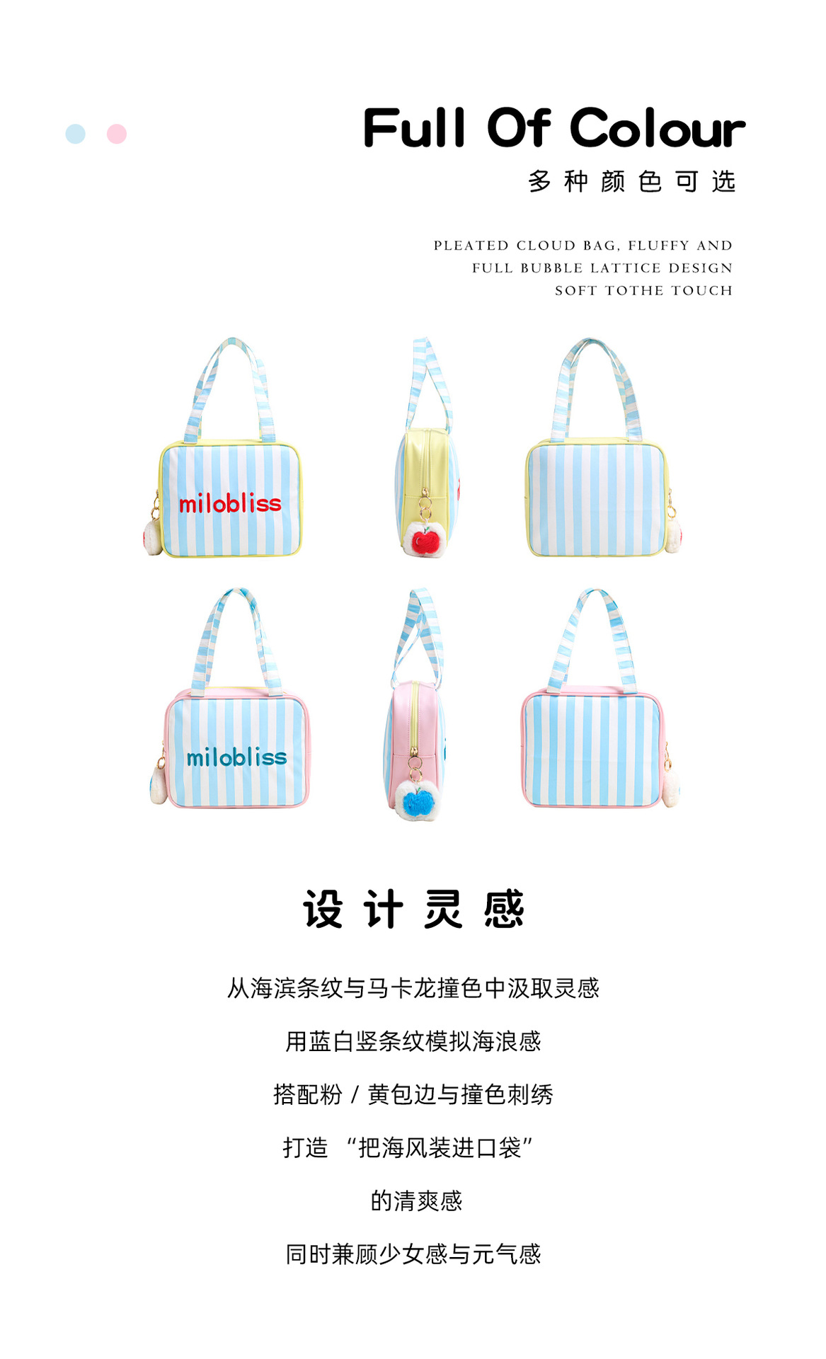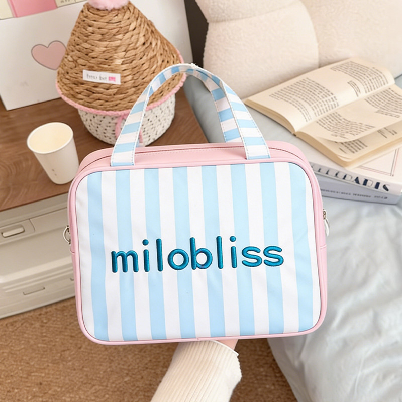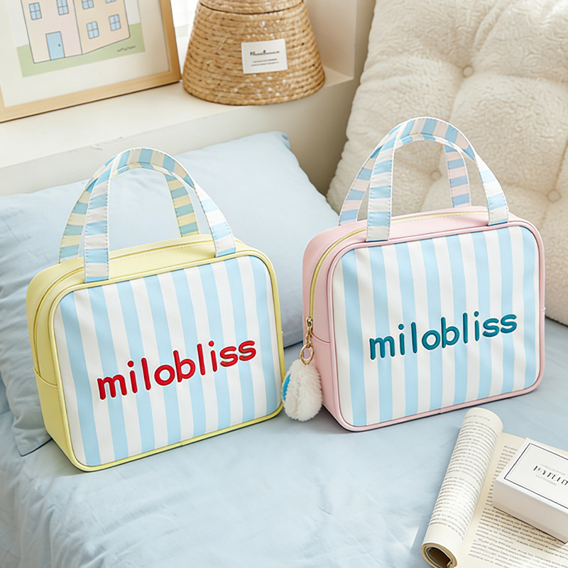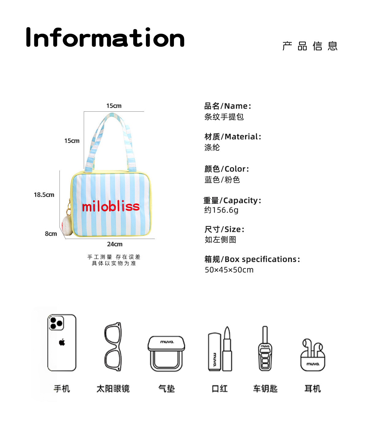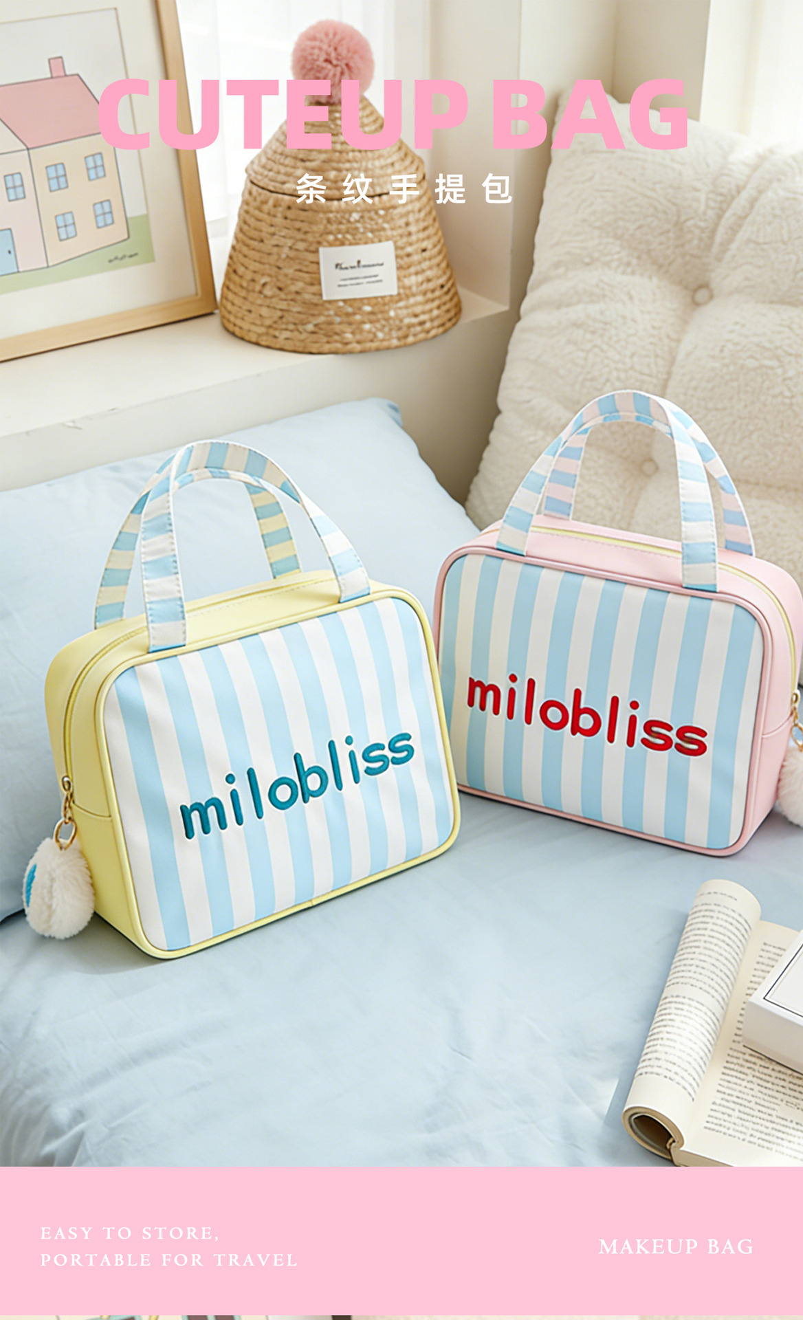 原创简约拼色蓝白条纹双手提收纳包日常户外便携式大容量化妆包