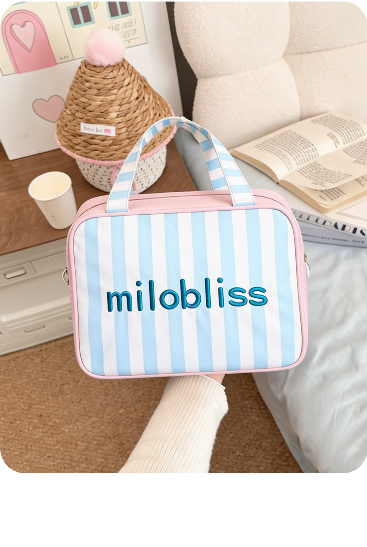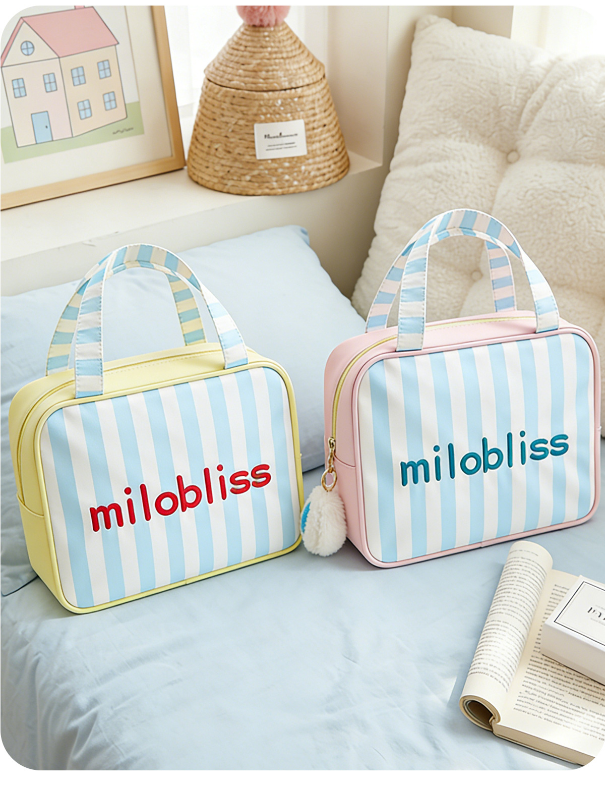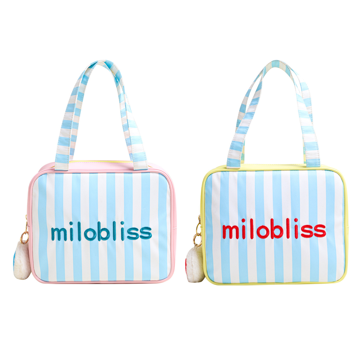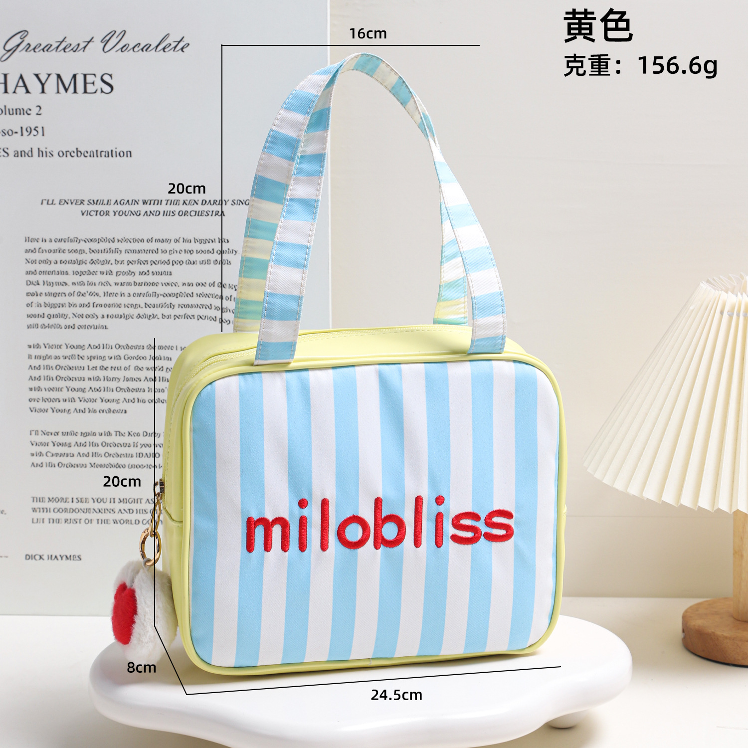 原创简约拼色蓝白条纹双手提收纳包日常户外便携式大容量化妆包