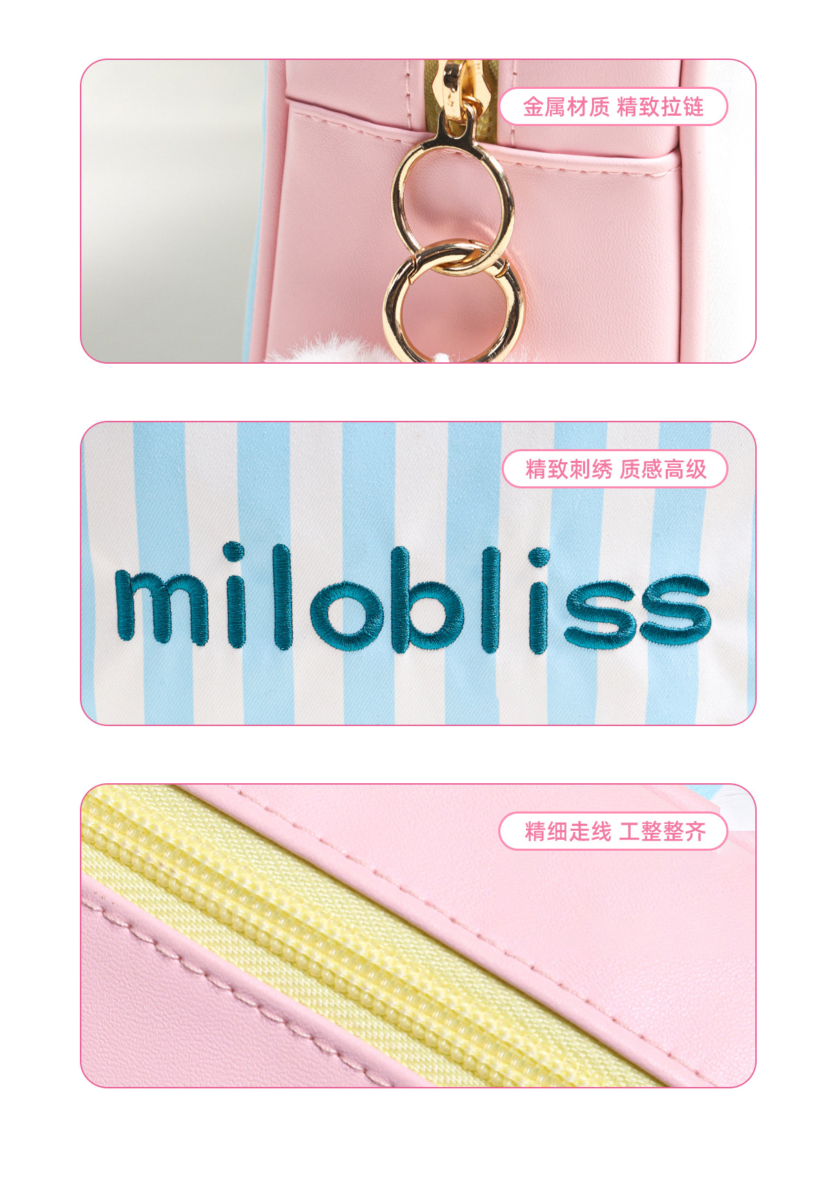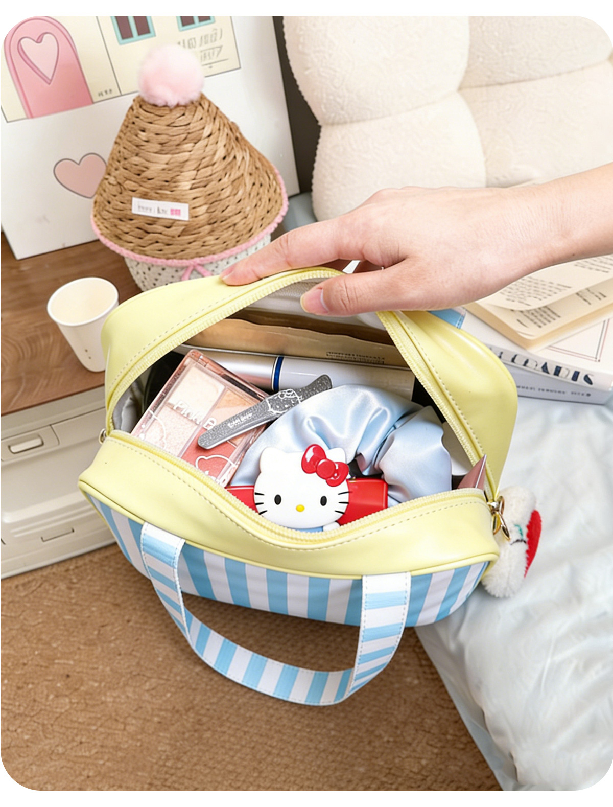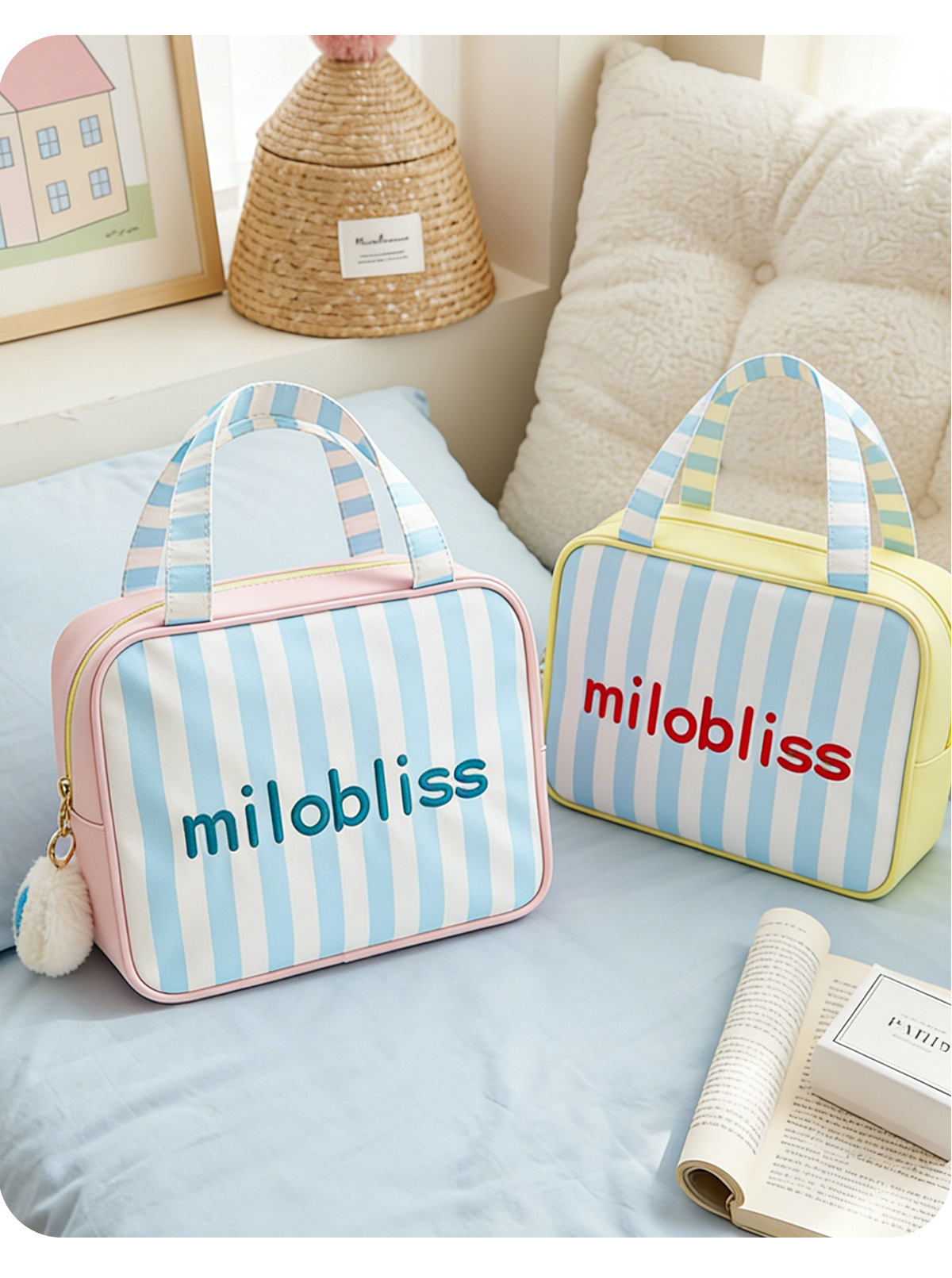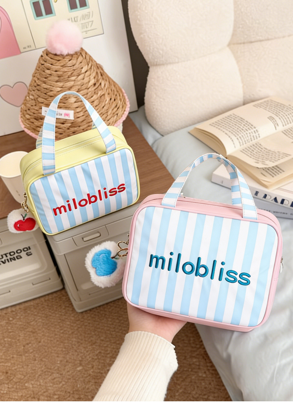 原创简约拼色蓝白条纹双手提收纳包日常户外便携式大容量化妆包