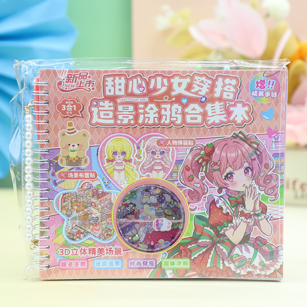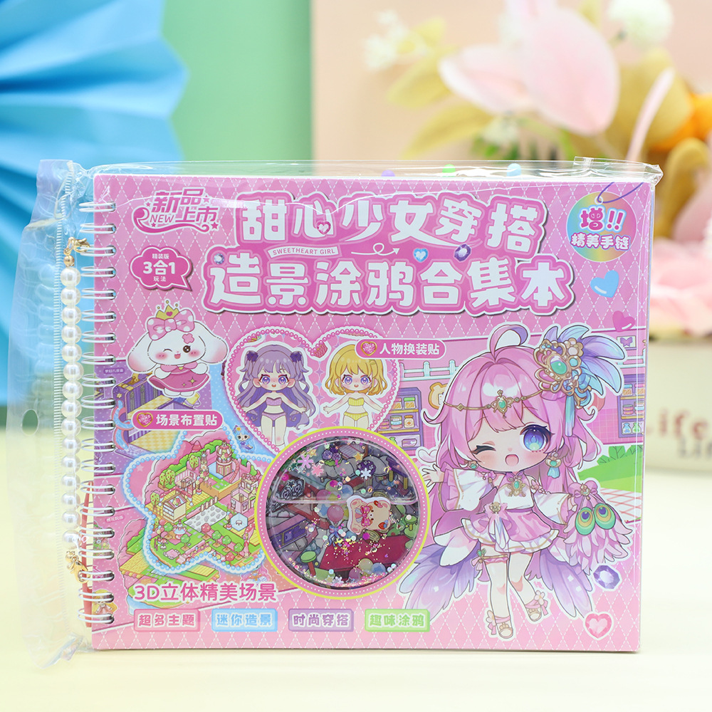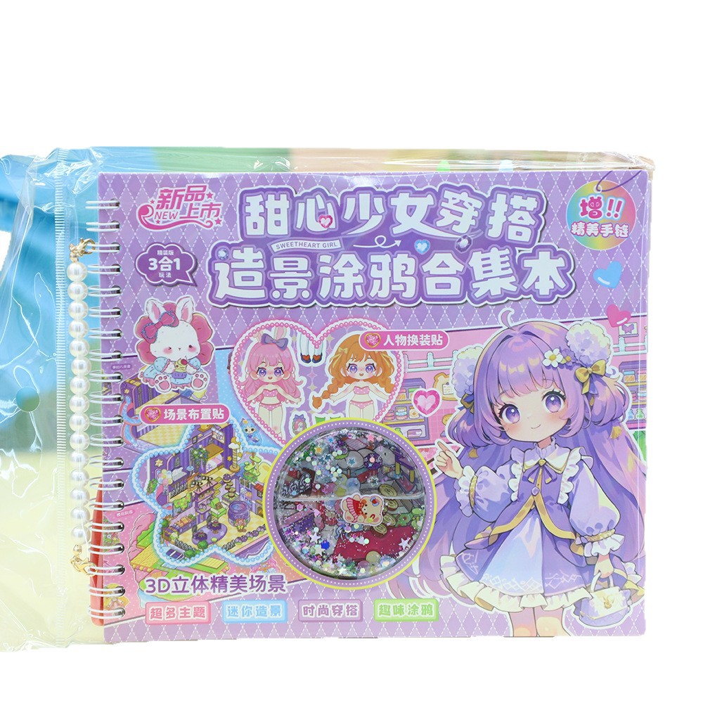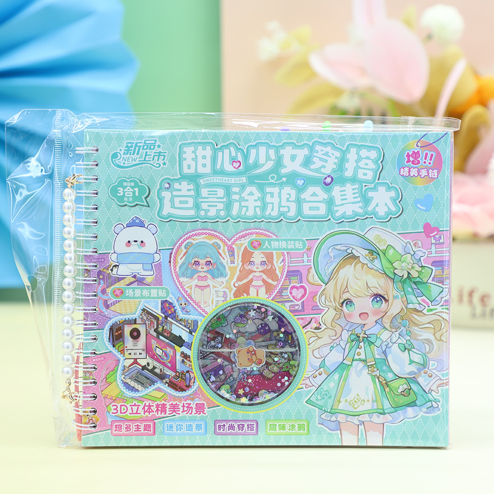 甜心少女3合1造景涂鸦合集本 手账创意贴纸 儿童DIY手工本 批发