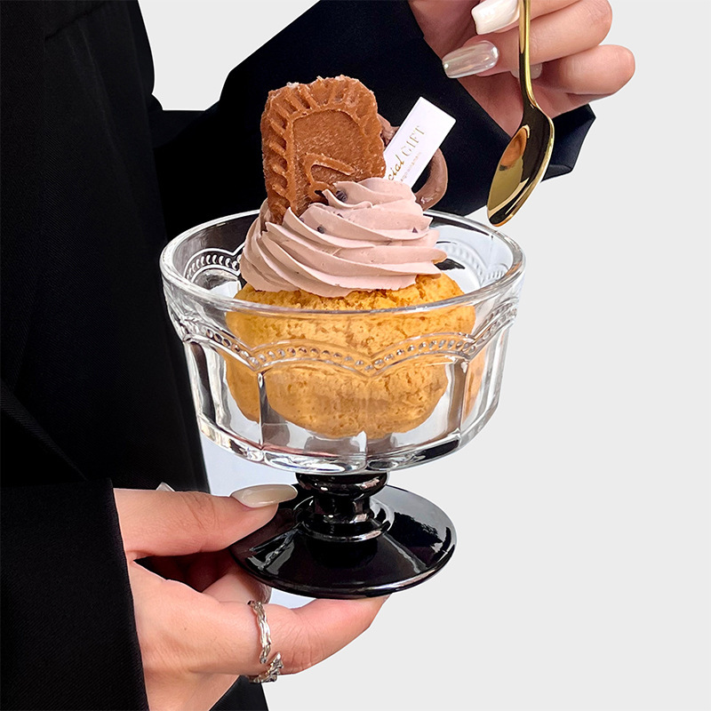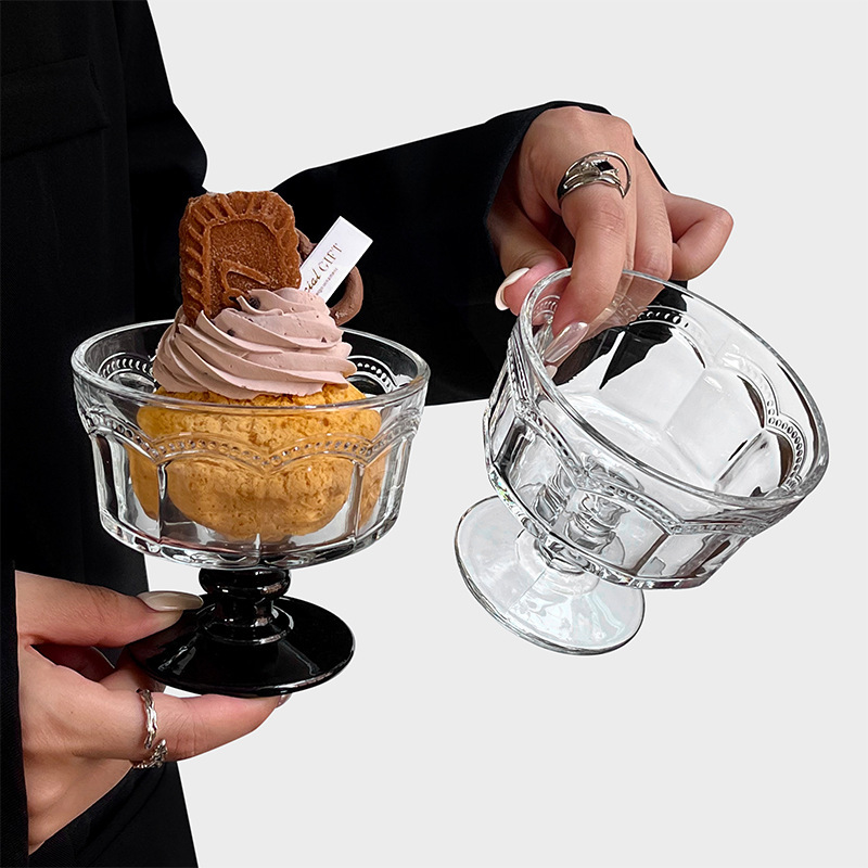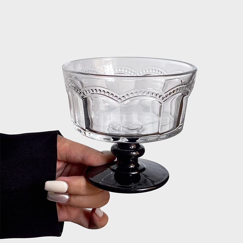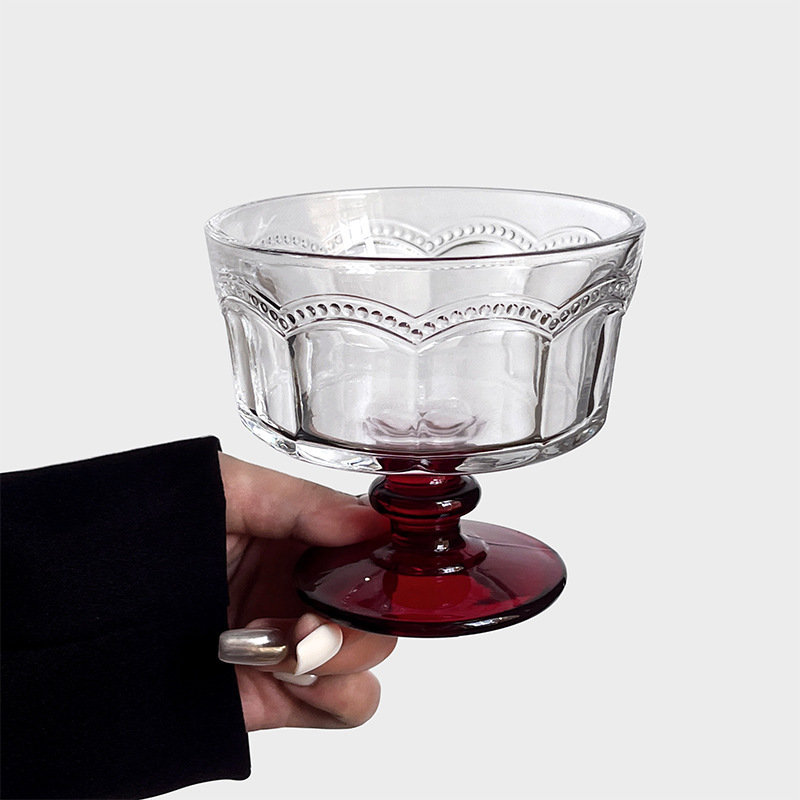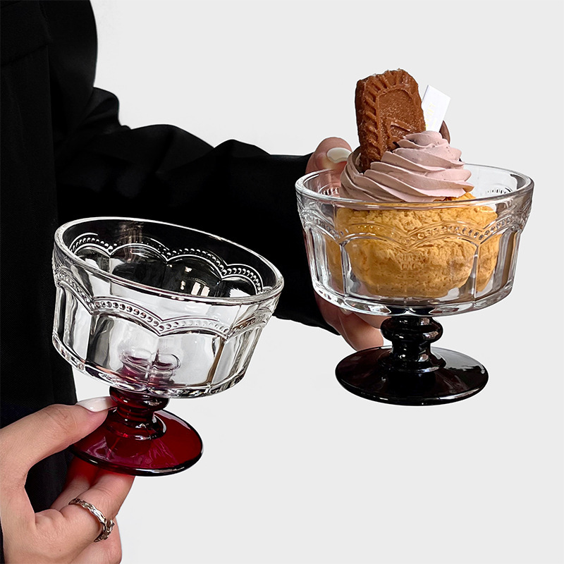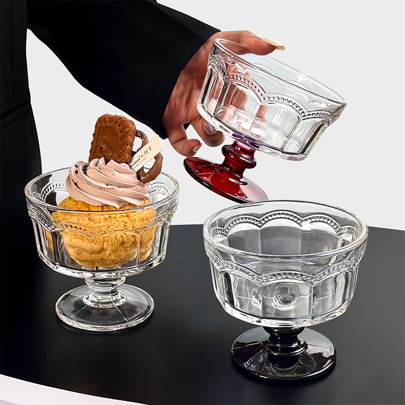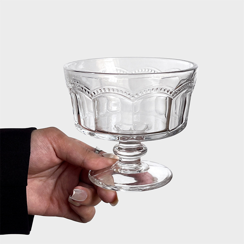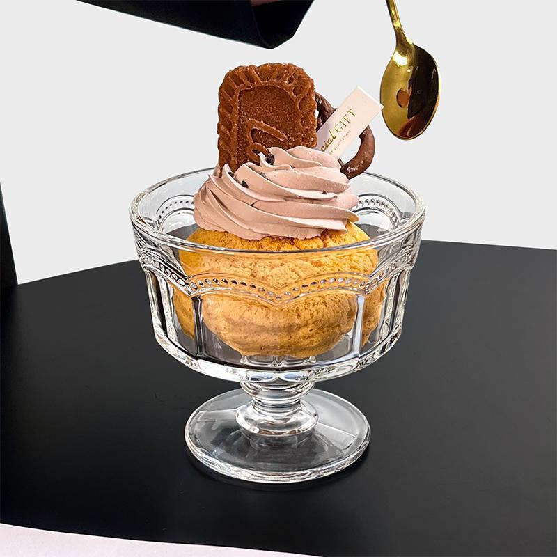 复古浮雕高脚玻璃雪糕杯甜品酸奶冰淇淋早餐杯小众设计高颜值杯子