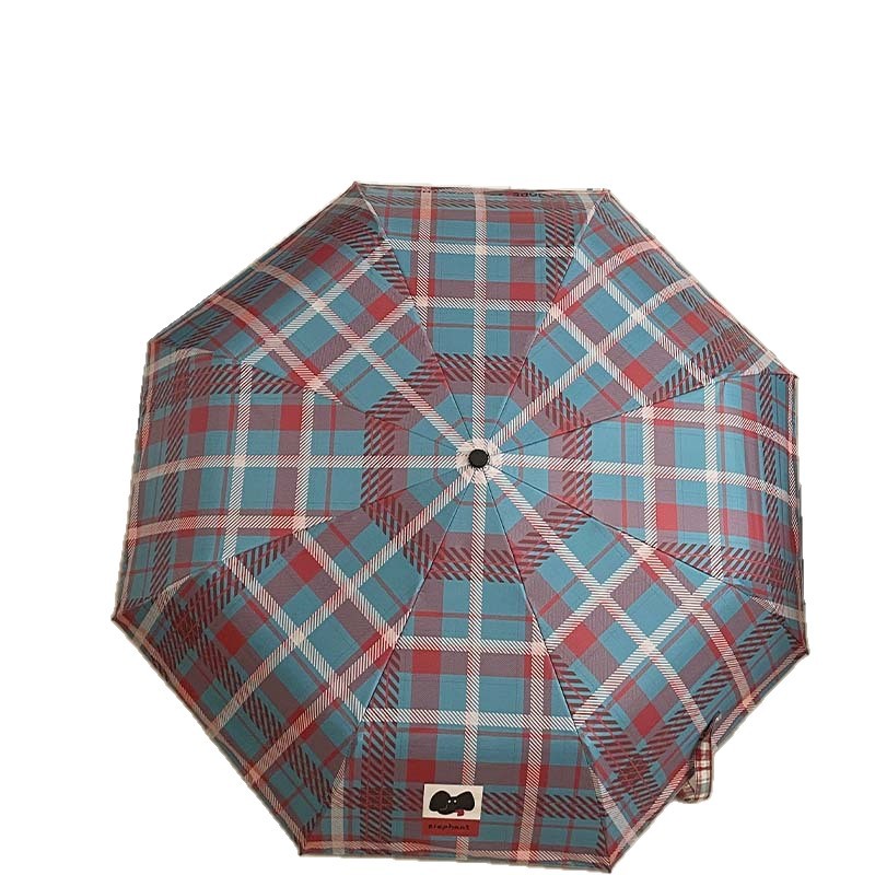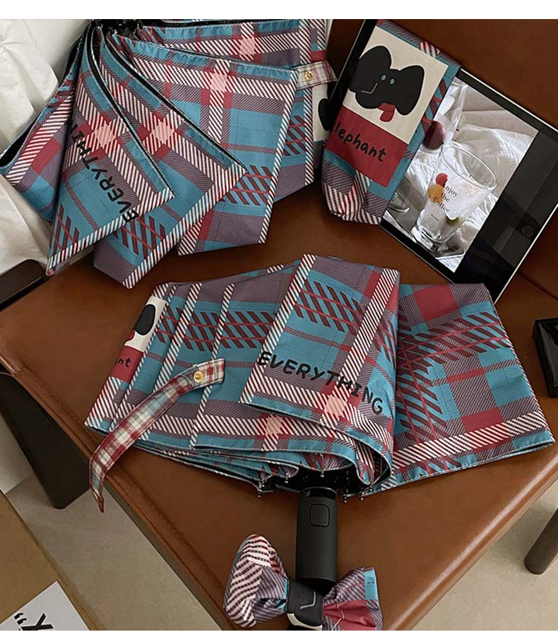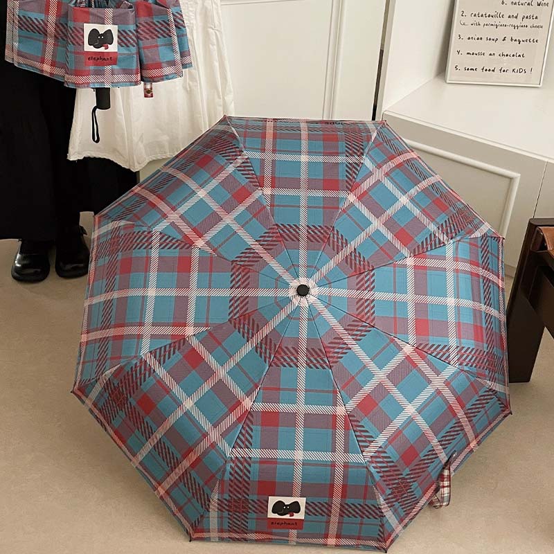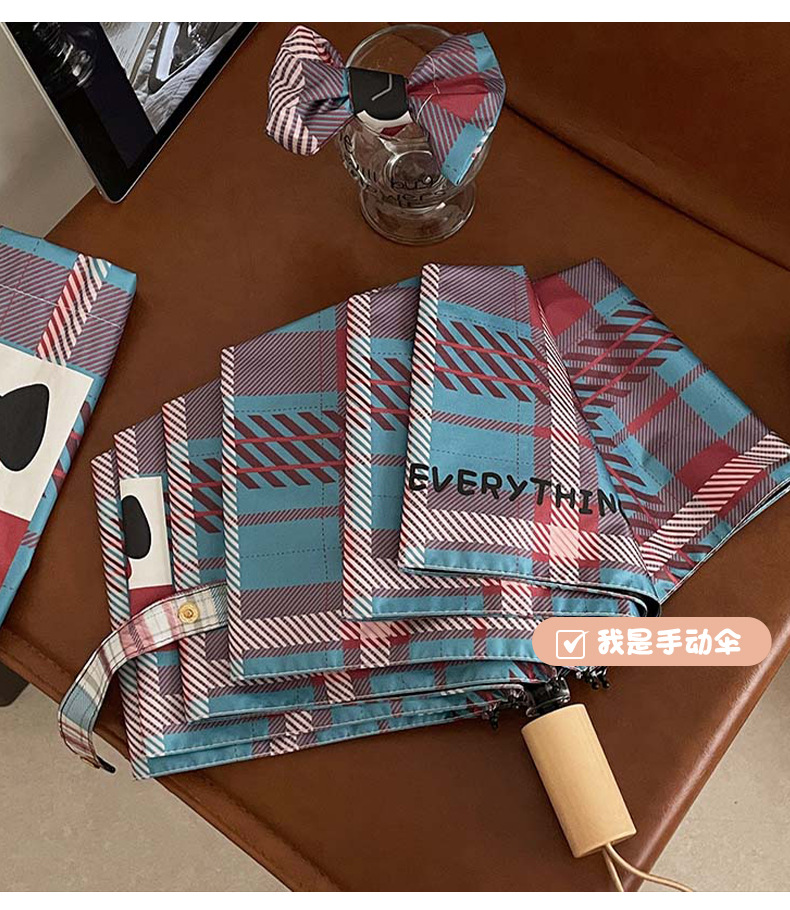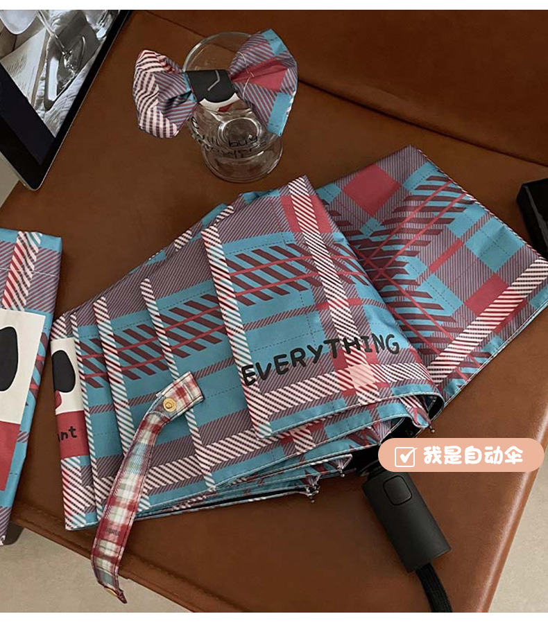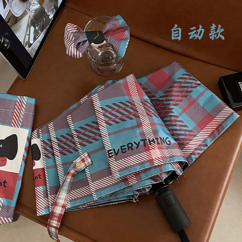 复古蓝粉格子折叠伞全自动卡通学生晴雨伞遮阳伞防晒黑胶太阳伞