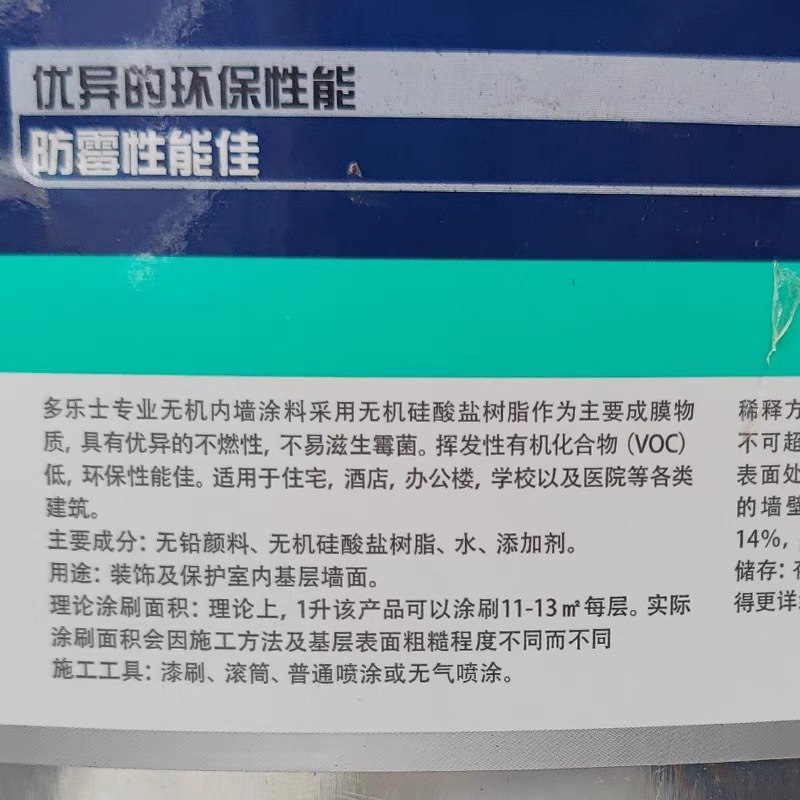 多乐士专业无机矿物质涂料防火阻燃耐燃防潮防霉环保内墙乳胶漆