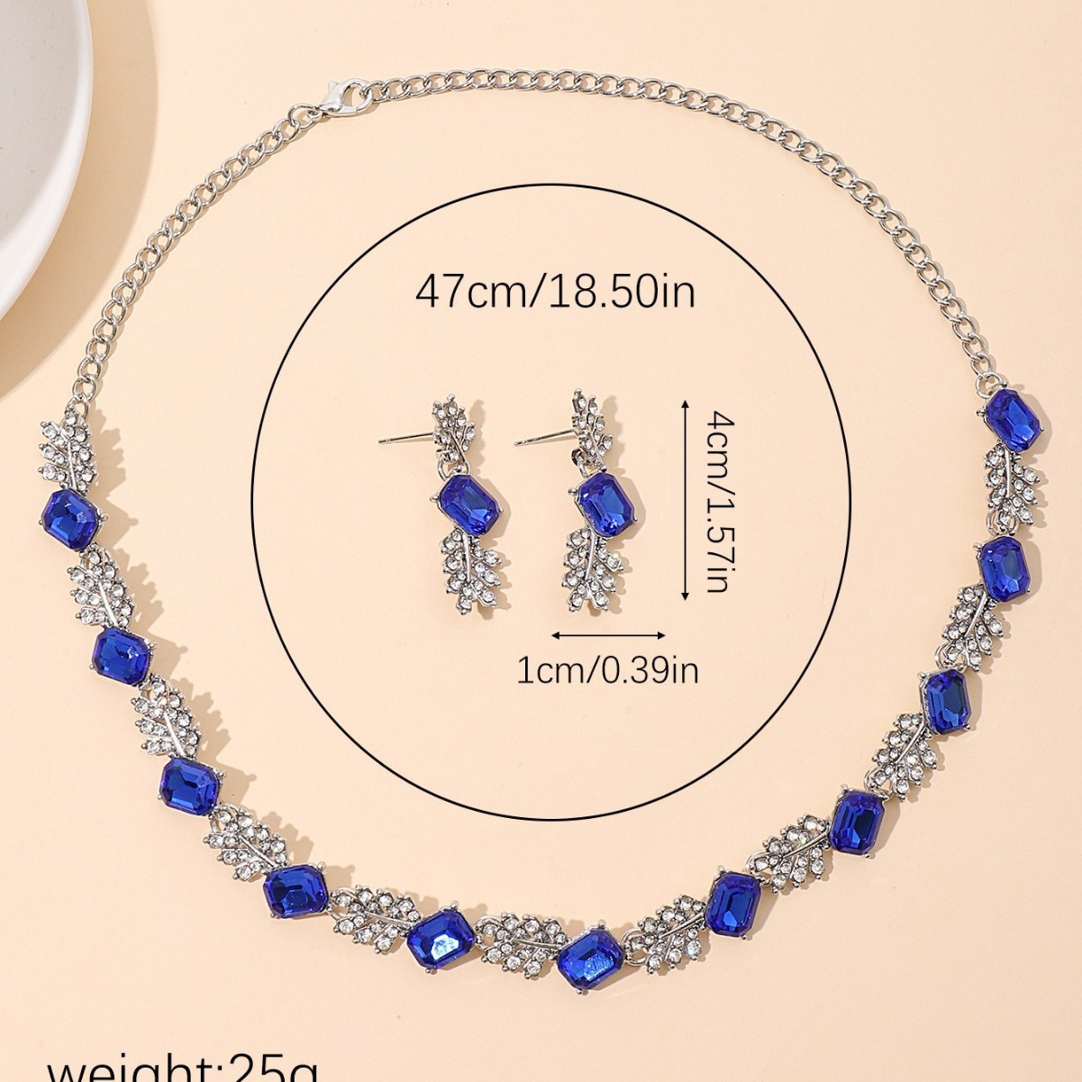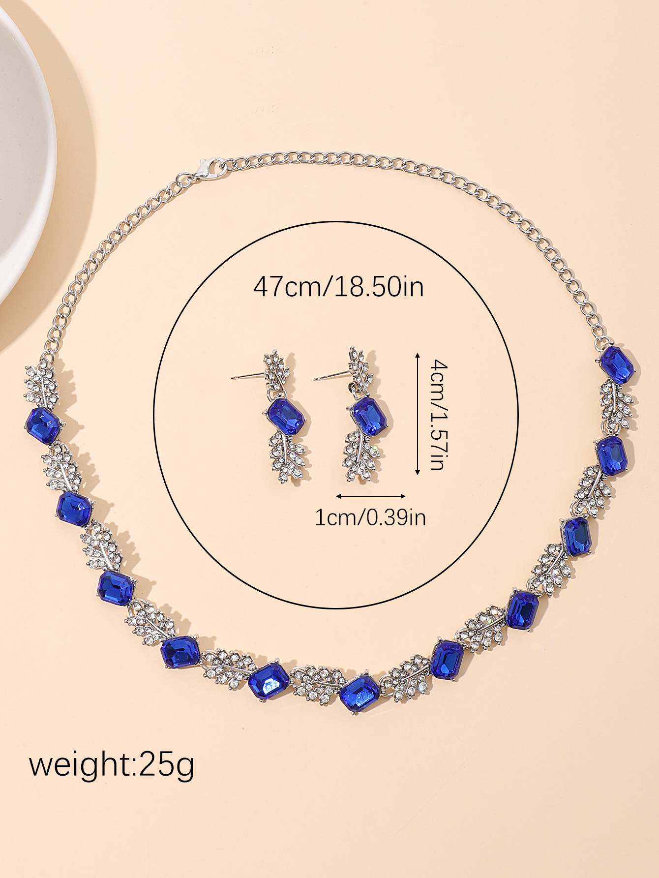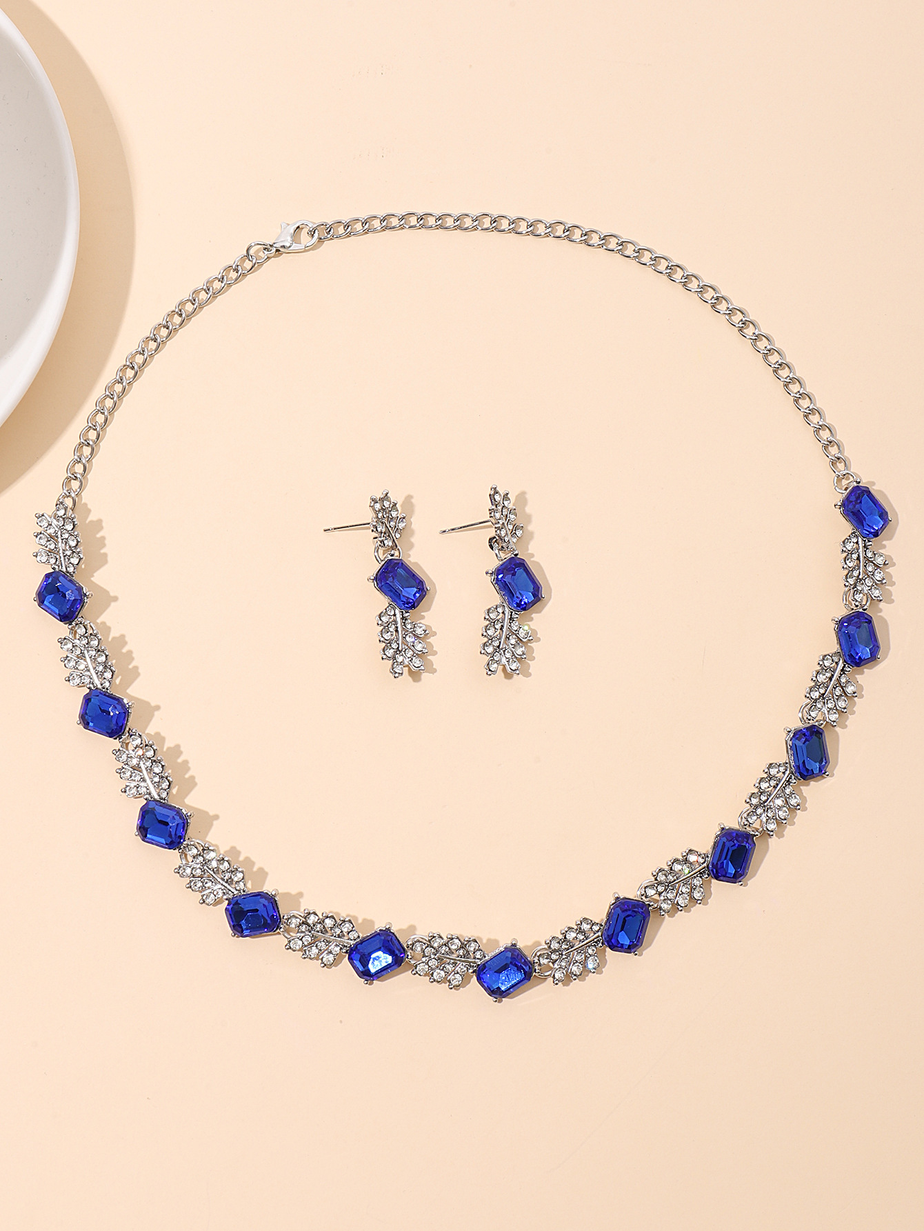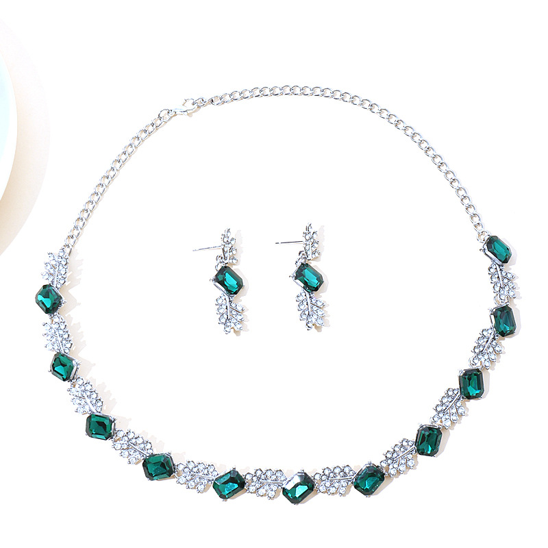 欧美时尚宝蓝色水晶项链耳环套装跨境爆款时尚树叶型满钻套链