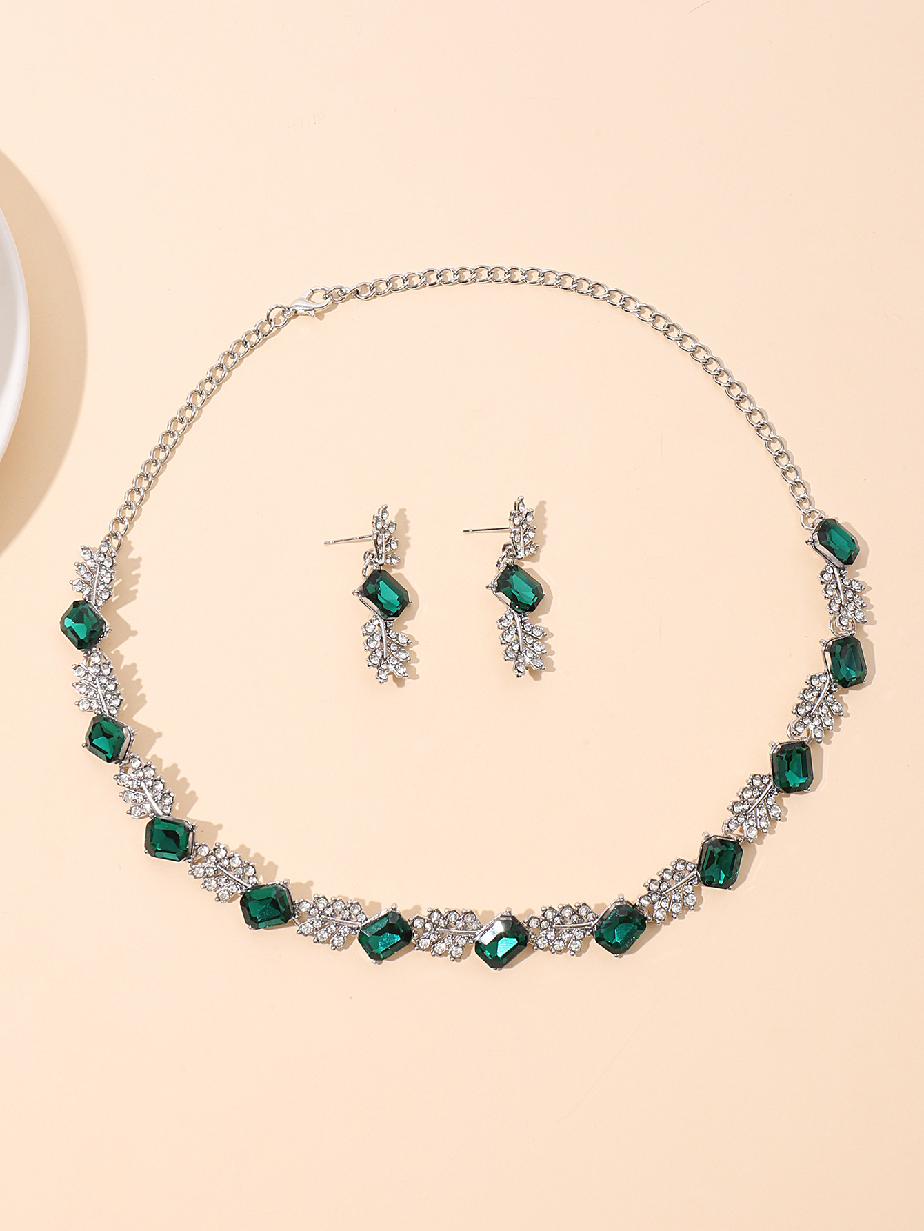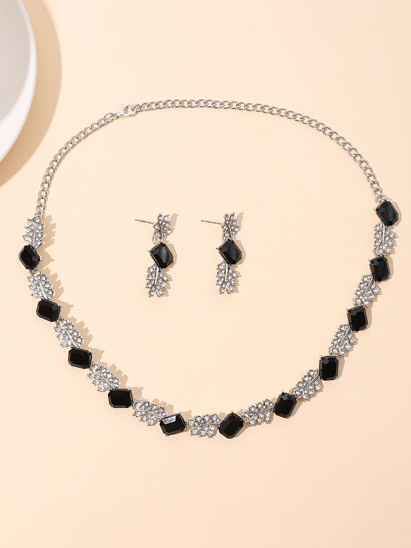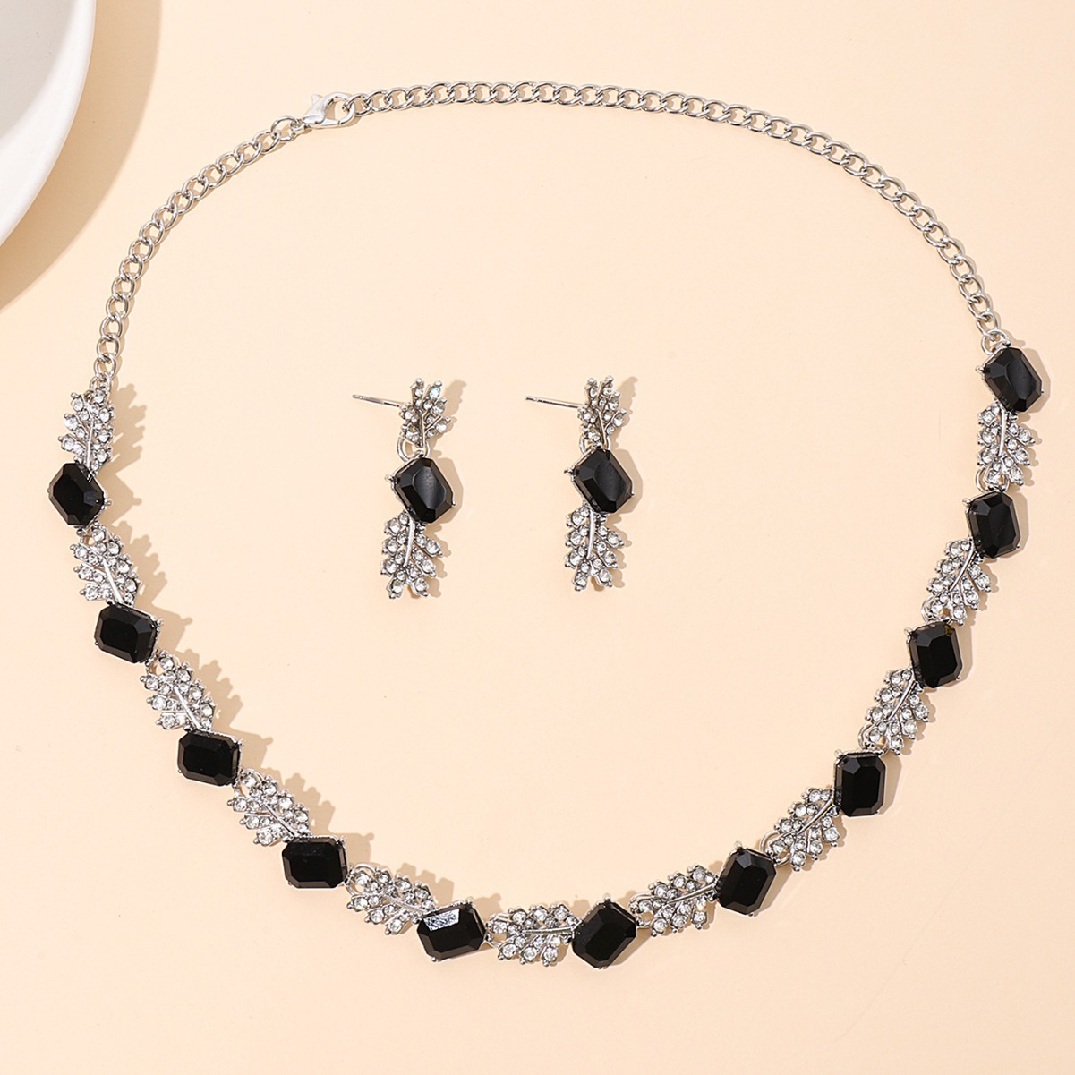 欧美时尚宝蓝色水晶项链耳环套装跨境爆款时尚树叶型满钻套链
