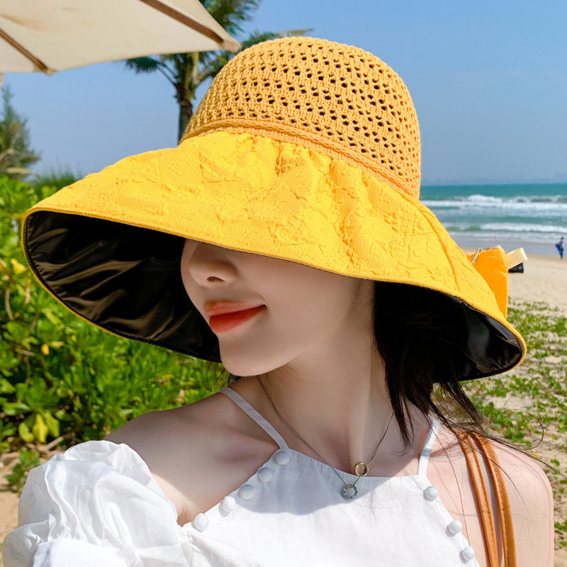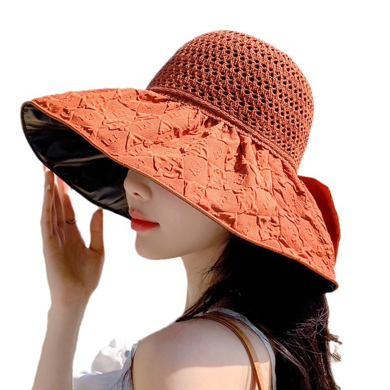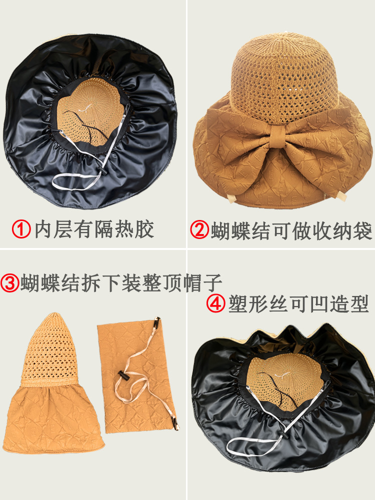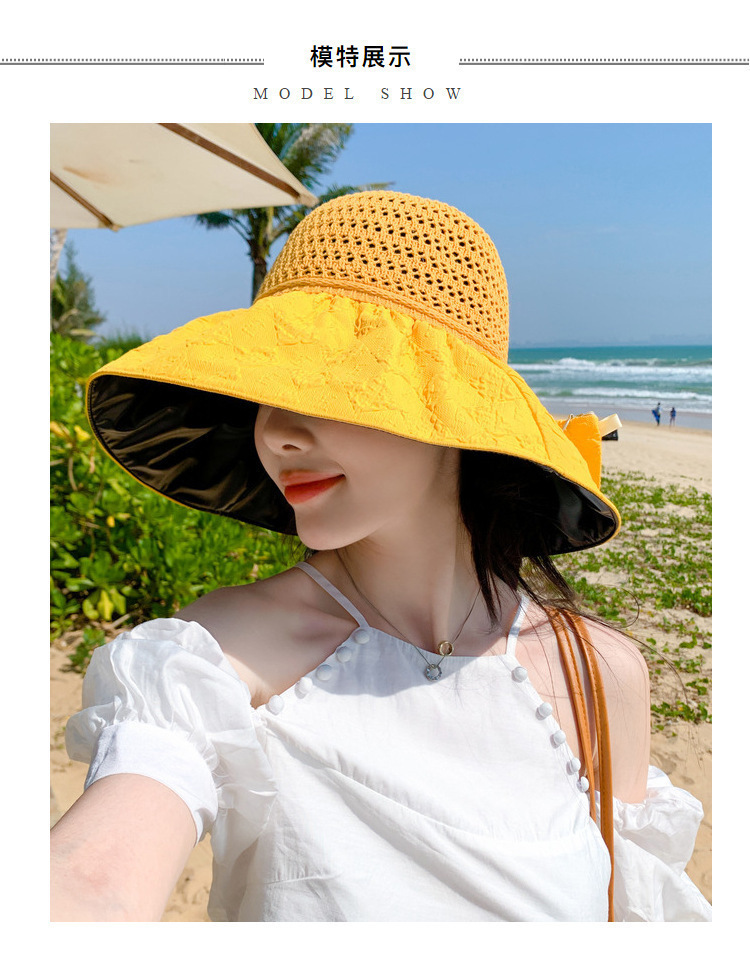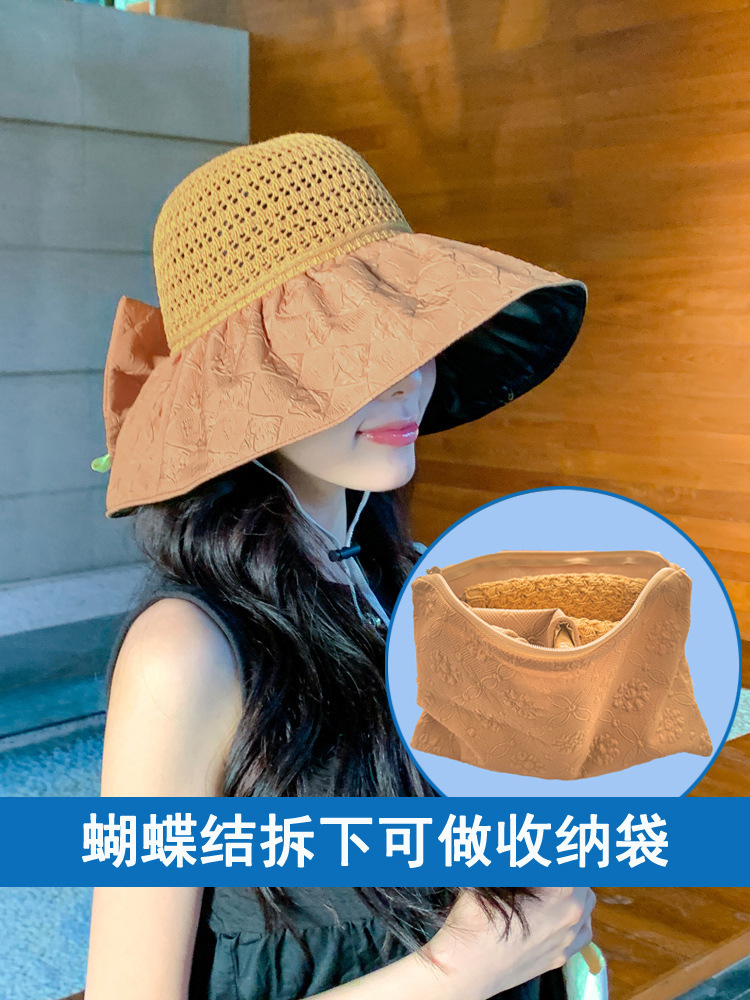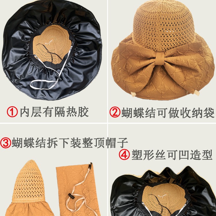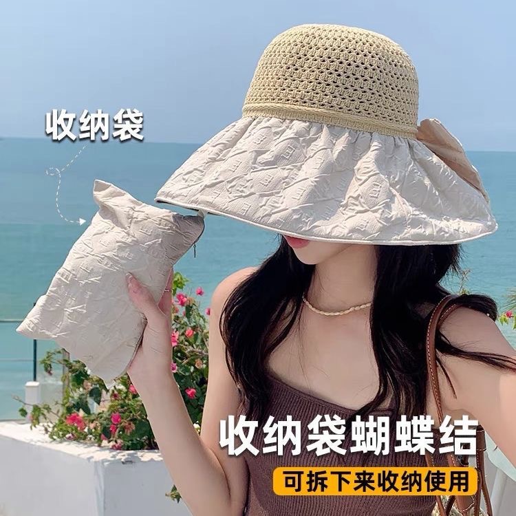 新款黑胶蝴蝶结遮阳帽女镂空草帽防紫外线大檐遮脸防晒凉帽渔夫帽