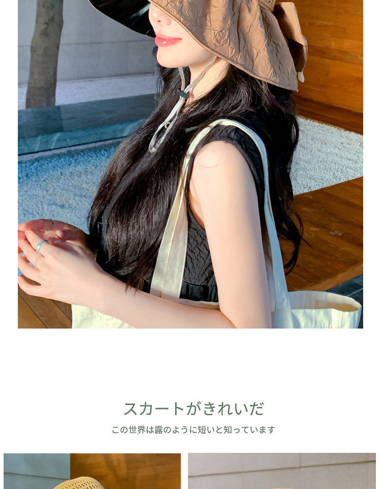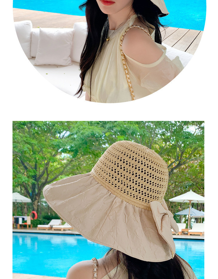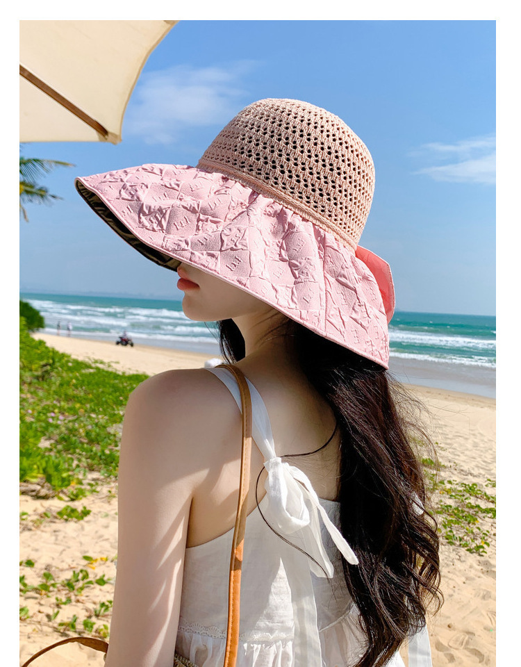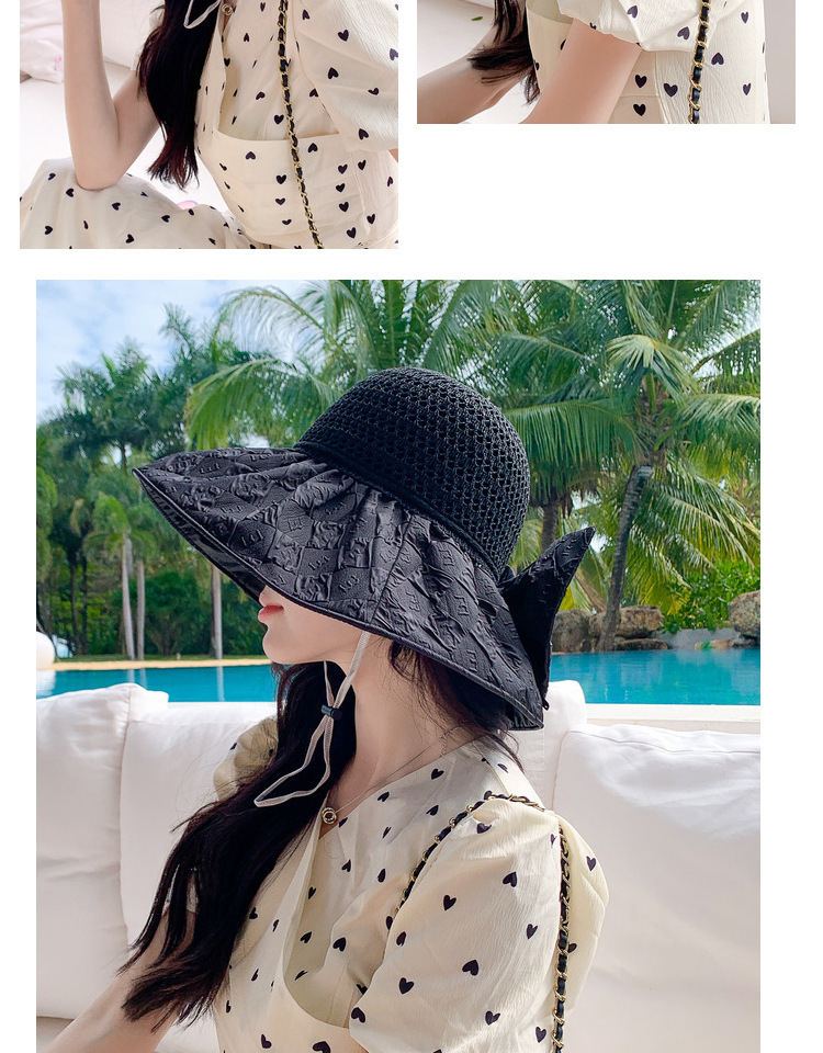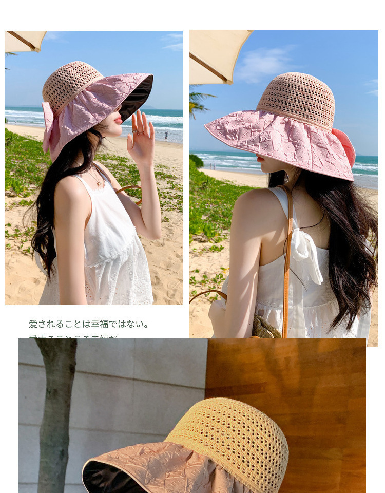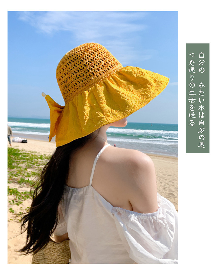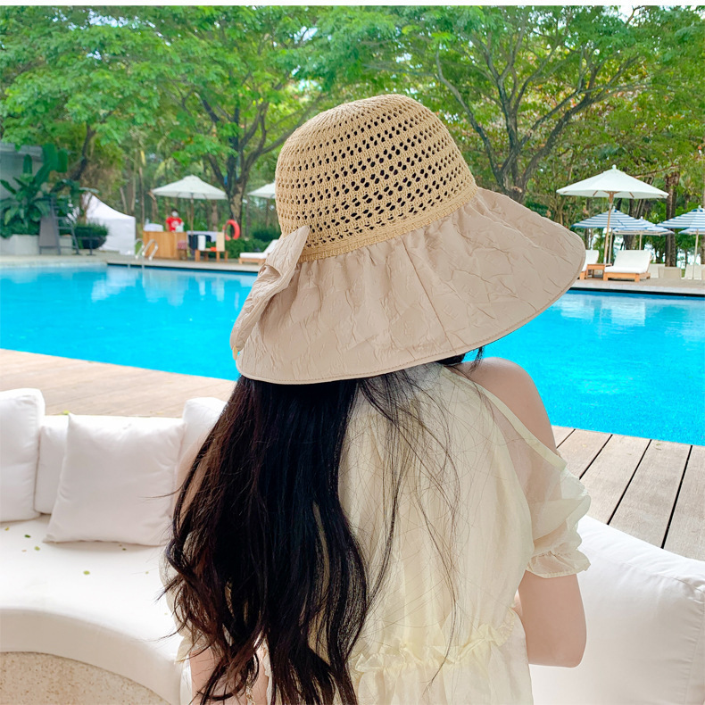 新款黑胶蝴蝶结遮阳帽女镂空草帽防紫外线大檐遮脸防晒凉帽渔夫帽