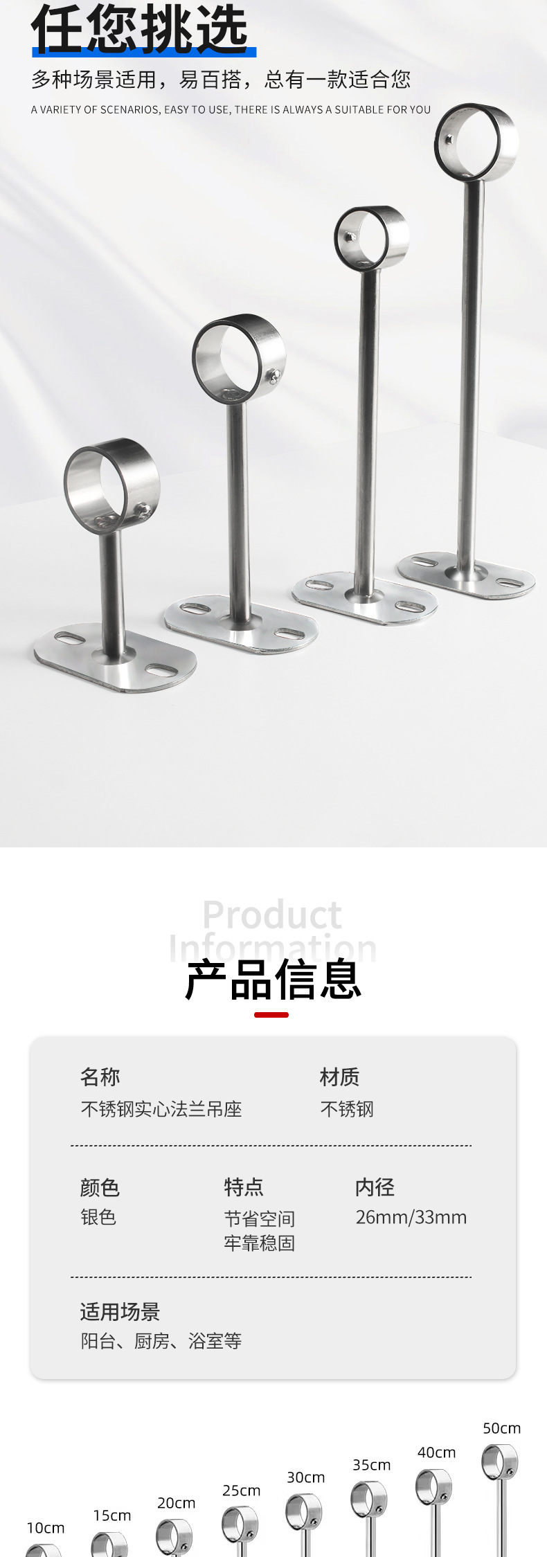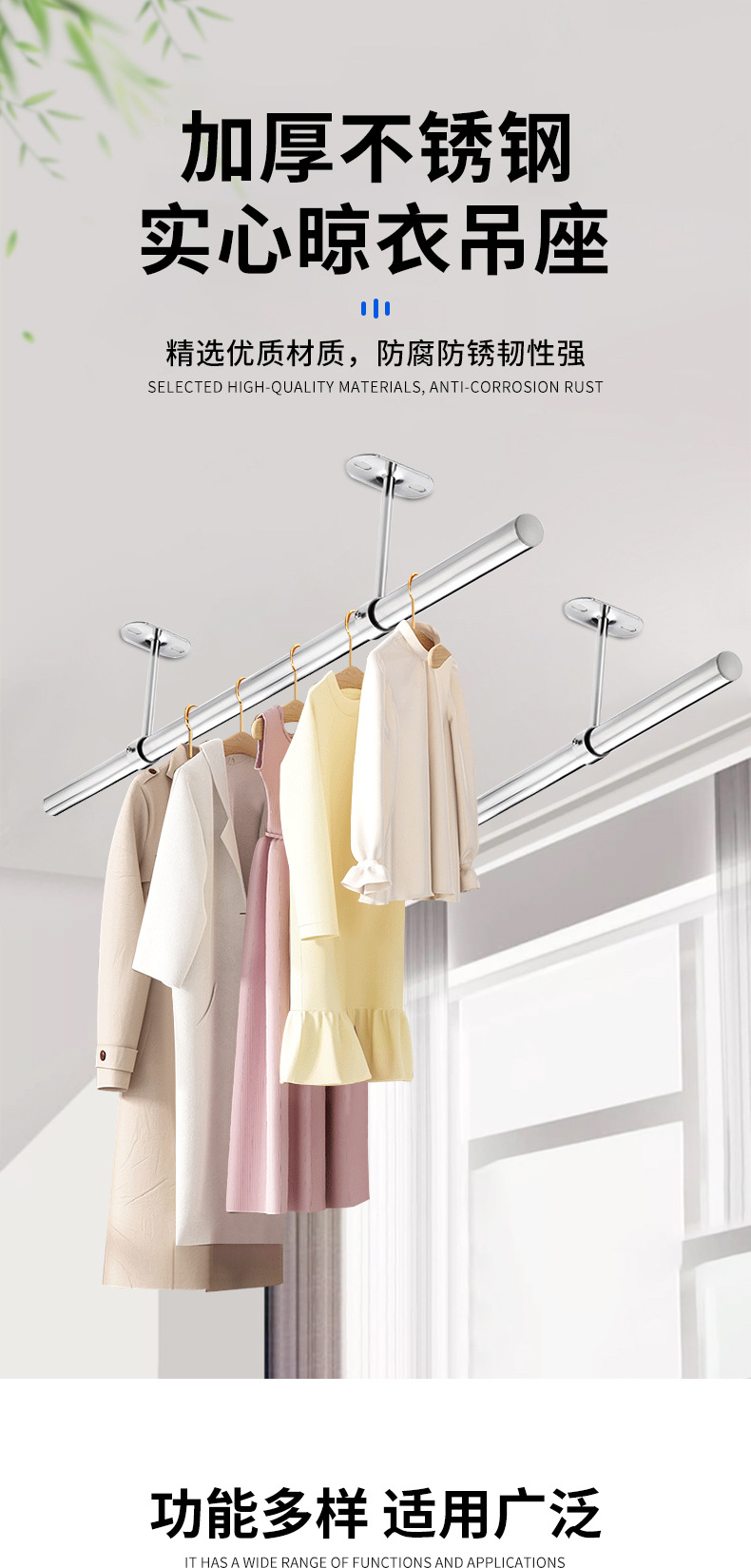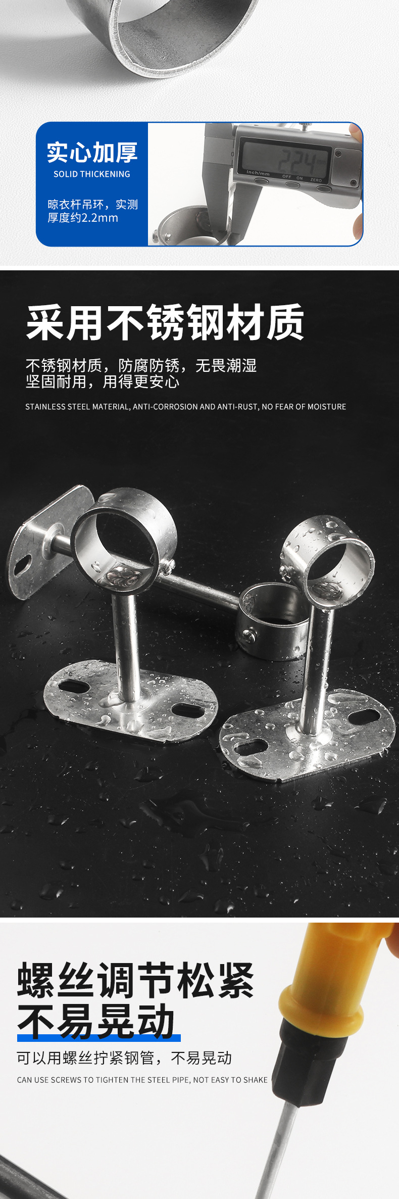 不锈钢吊通挂衣杆管座毛巾座圆头侧装顶装晾衣杆加厚法兰实心吊座