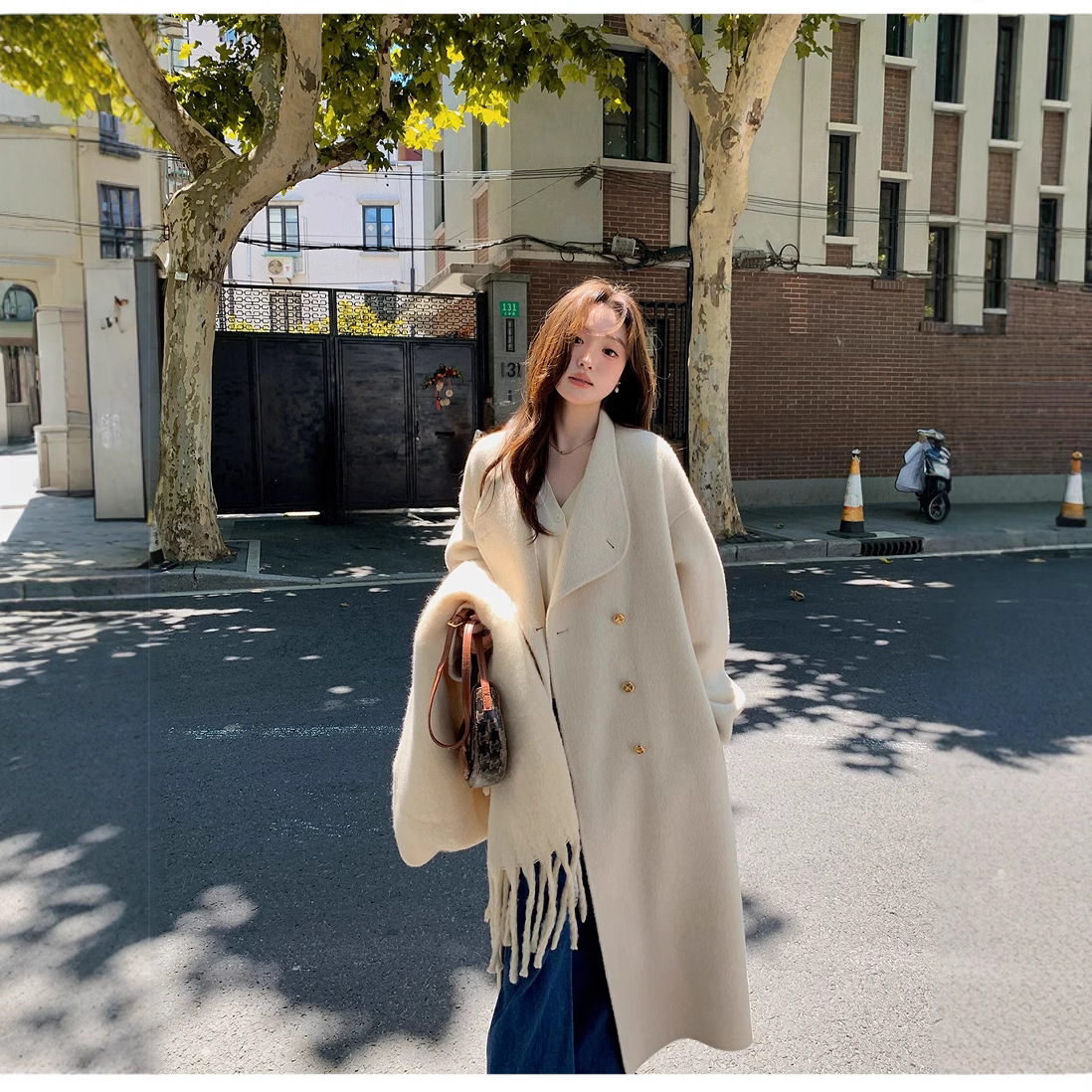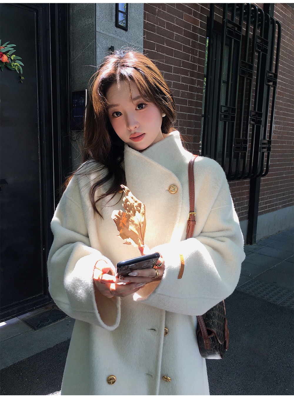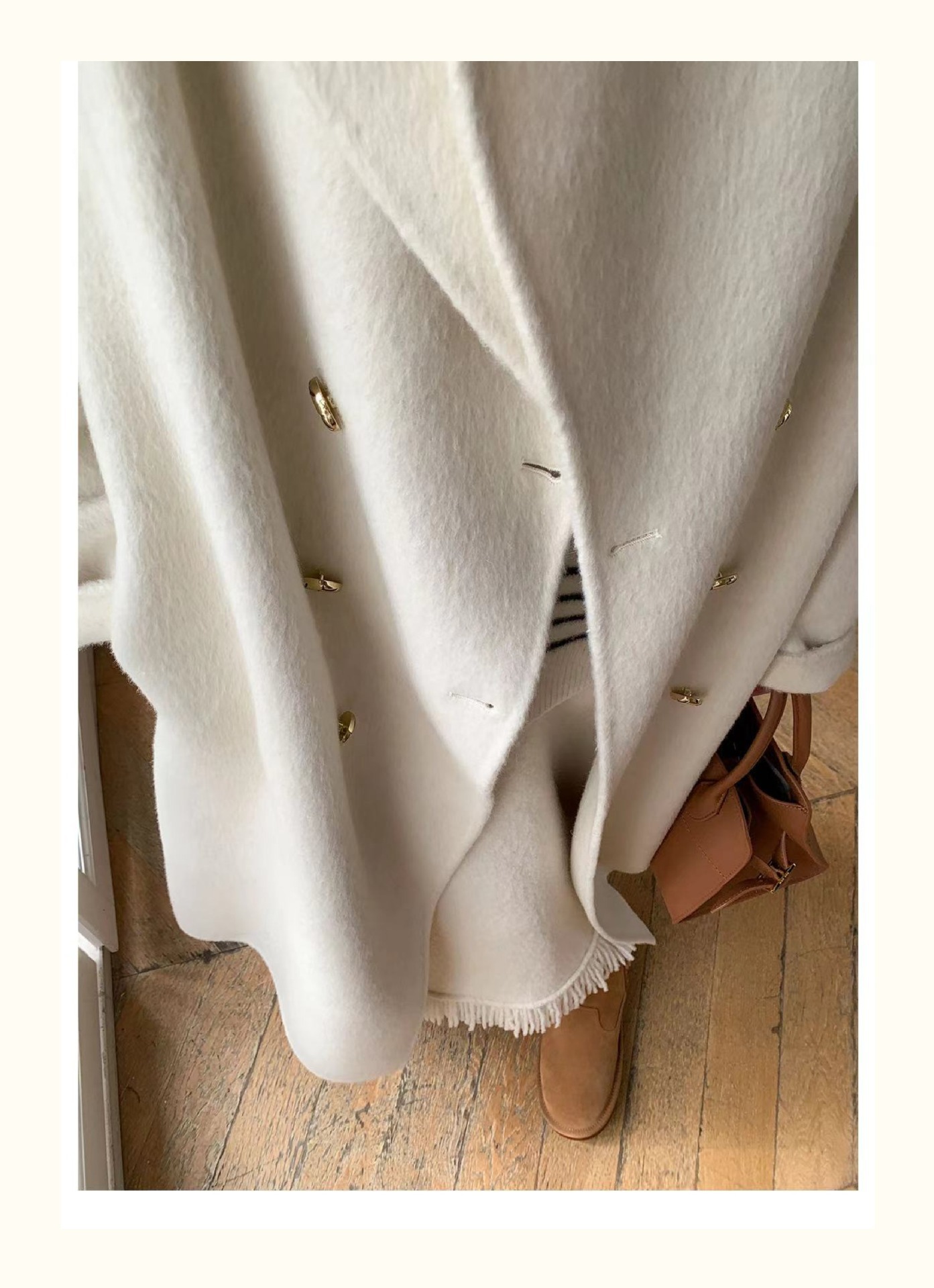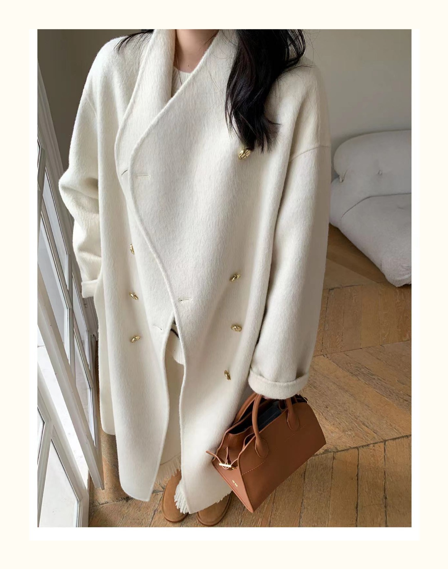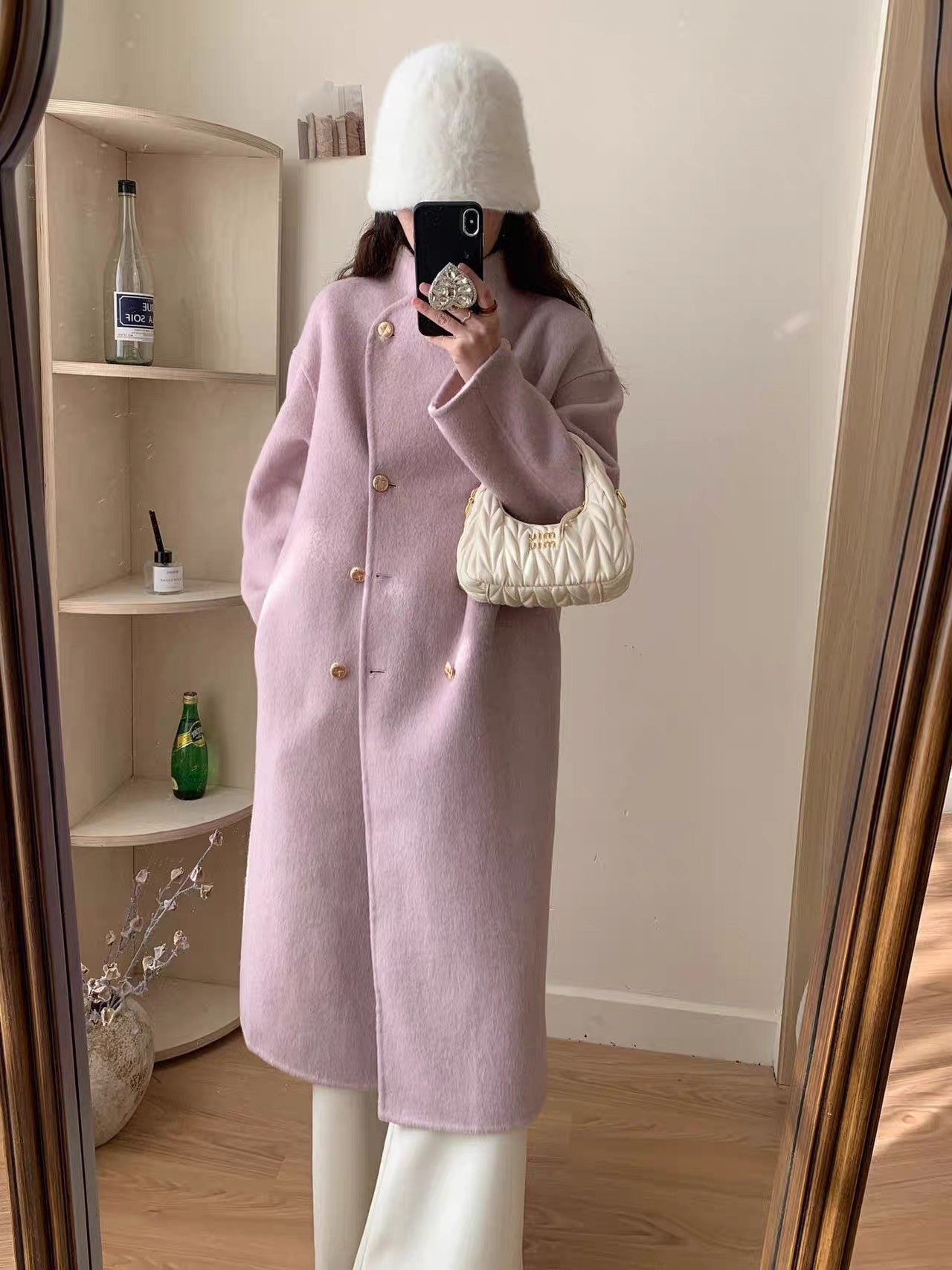 金扣中长款双面羊绒大衣女2024秋冬季高级感韩系立领宽松毛呢外套