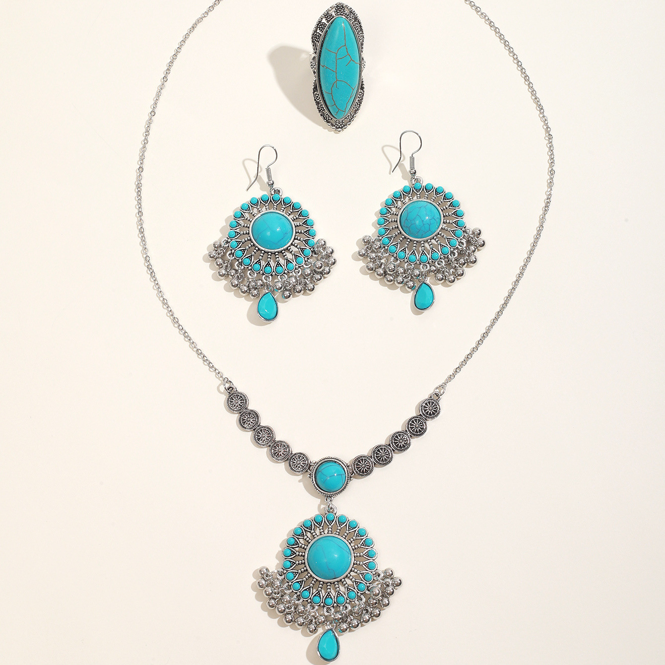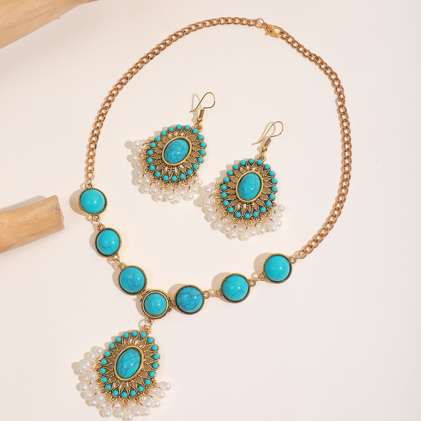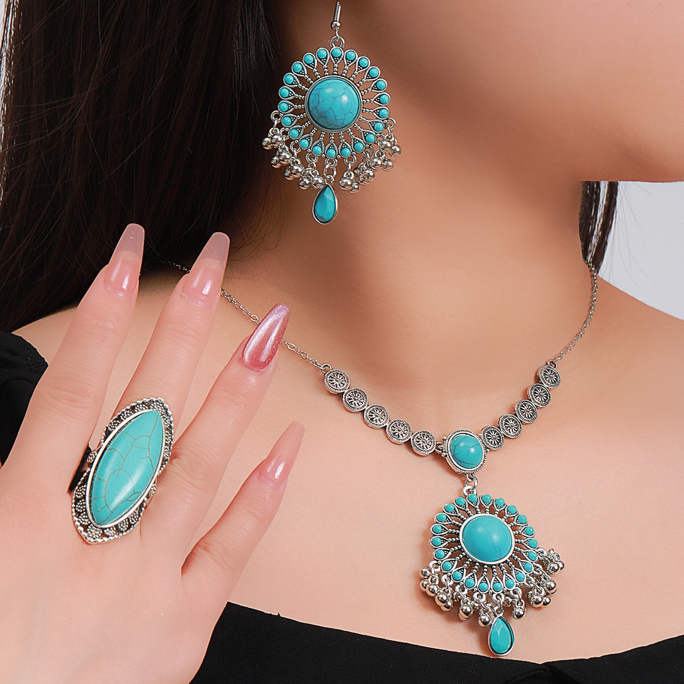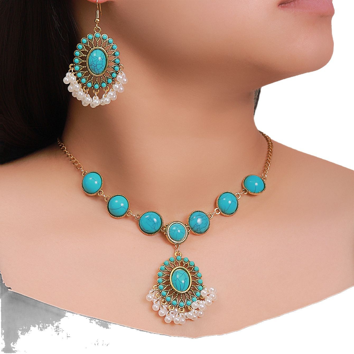 绿松石欧美跨境复古吊坠项链耳环套装批发绿松石欧美跨境复古吊坠
