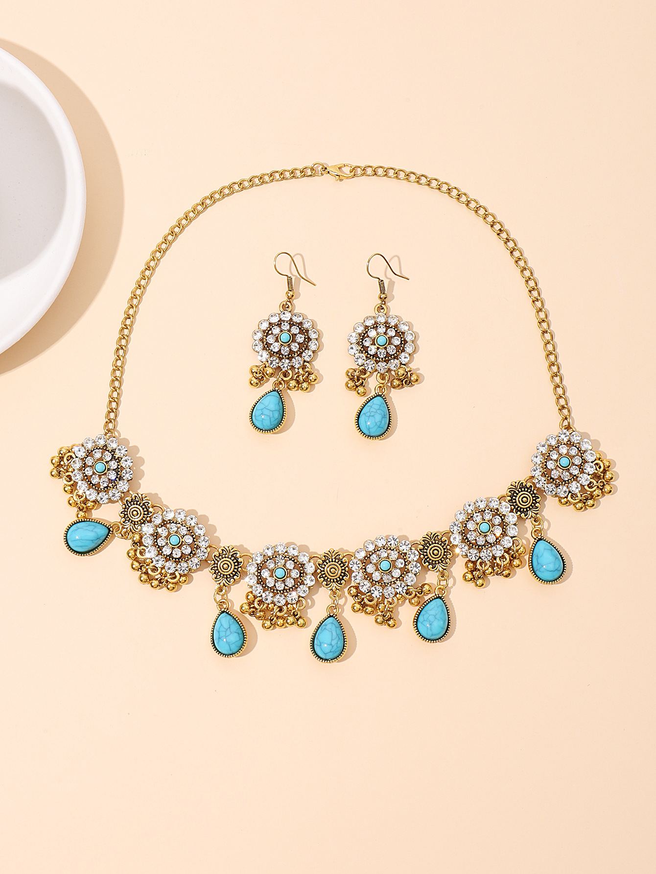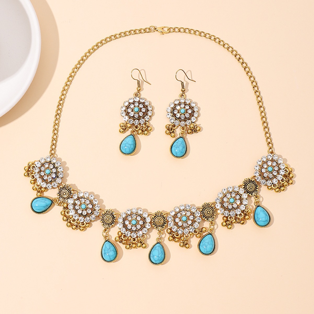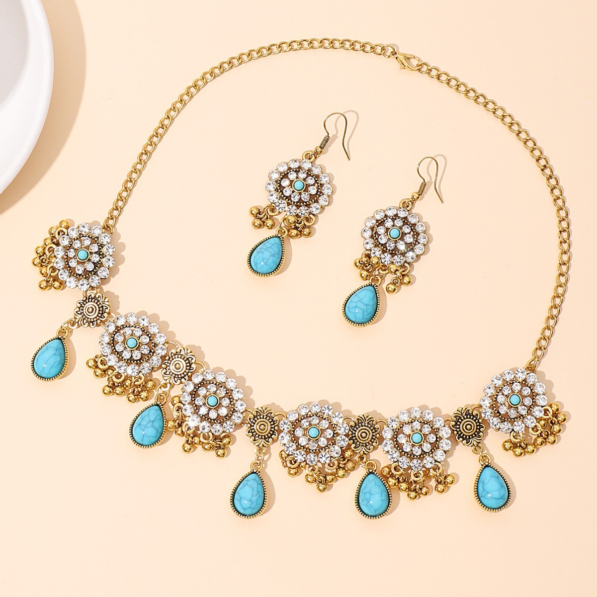 欧美跨境蓝松石复古民族风套装波西米亚松石水滴满钻耳环项链女