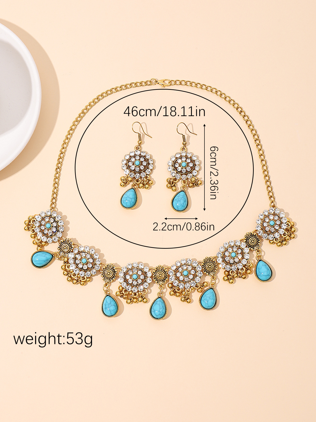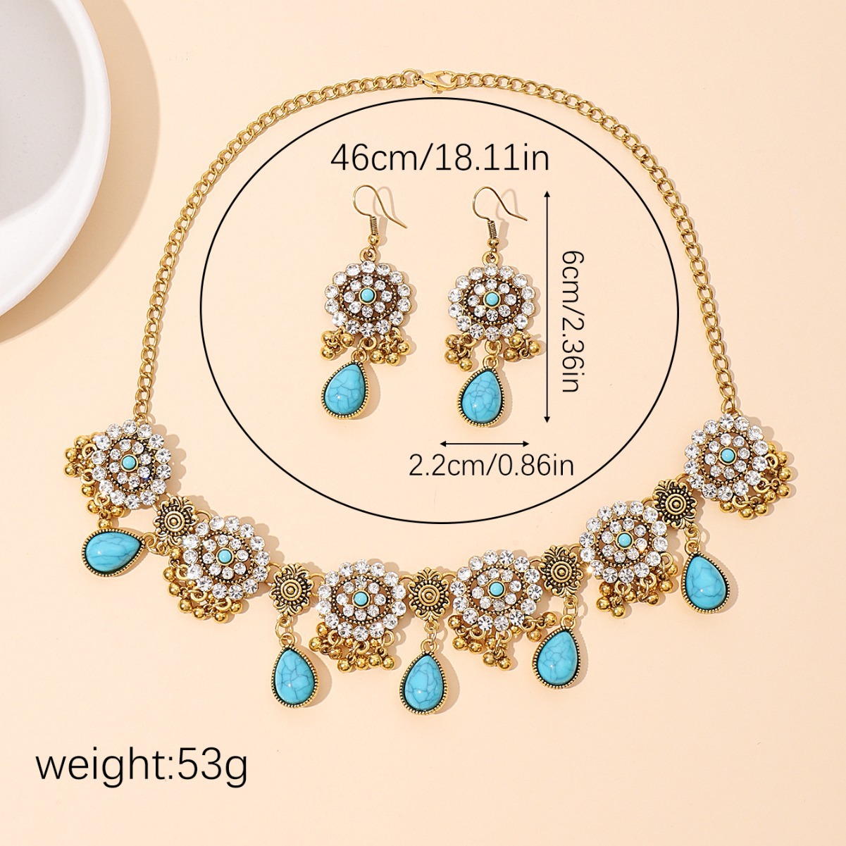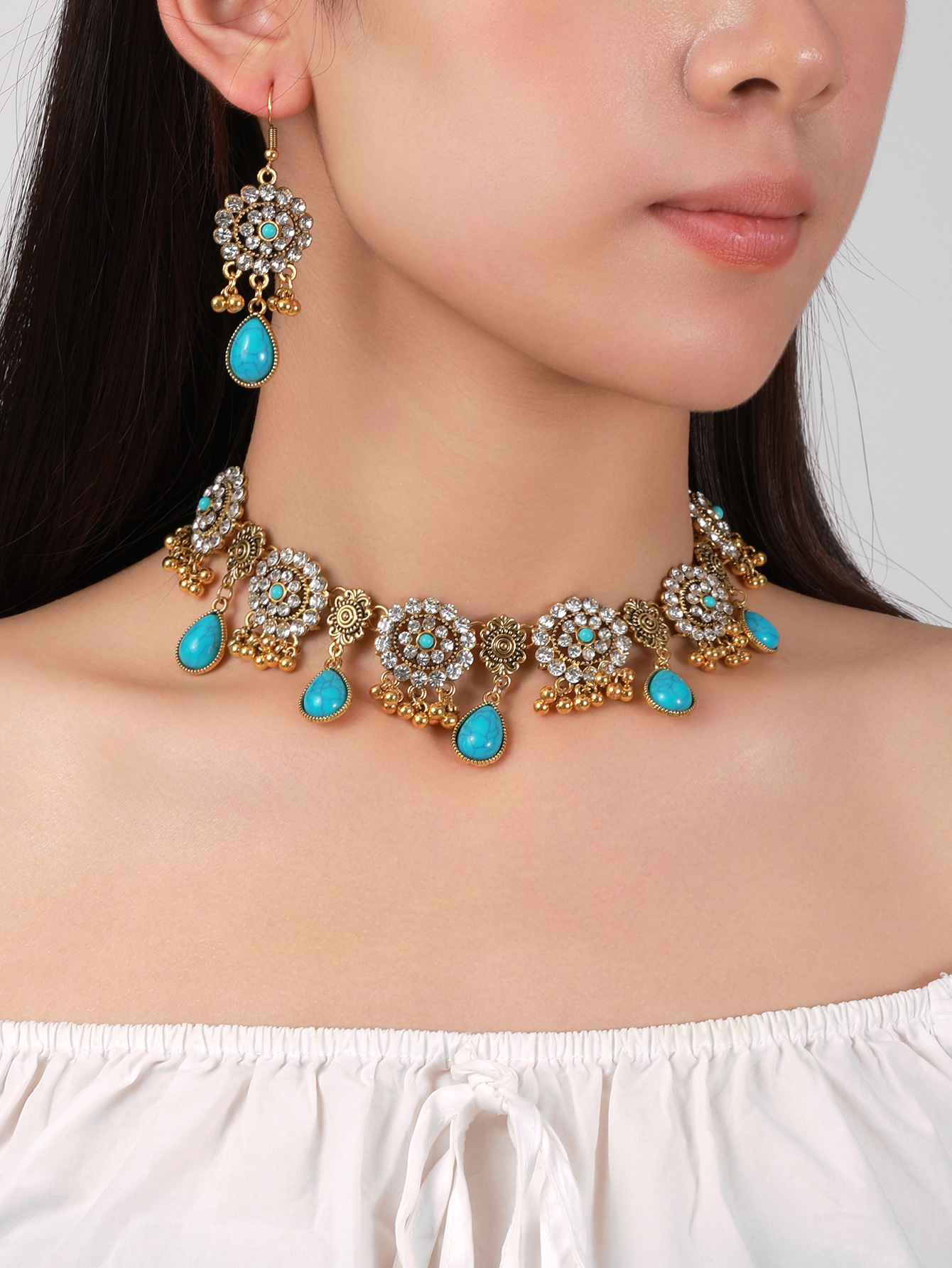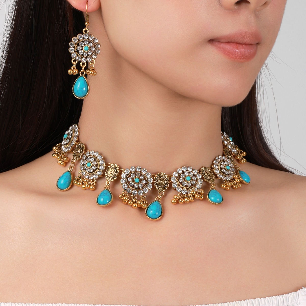 欧美跨境蓝松石复古民族风套装波西米亚松石水滴满钻耳环项链女