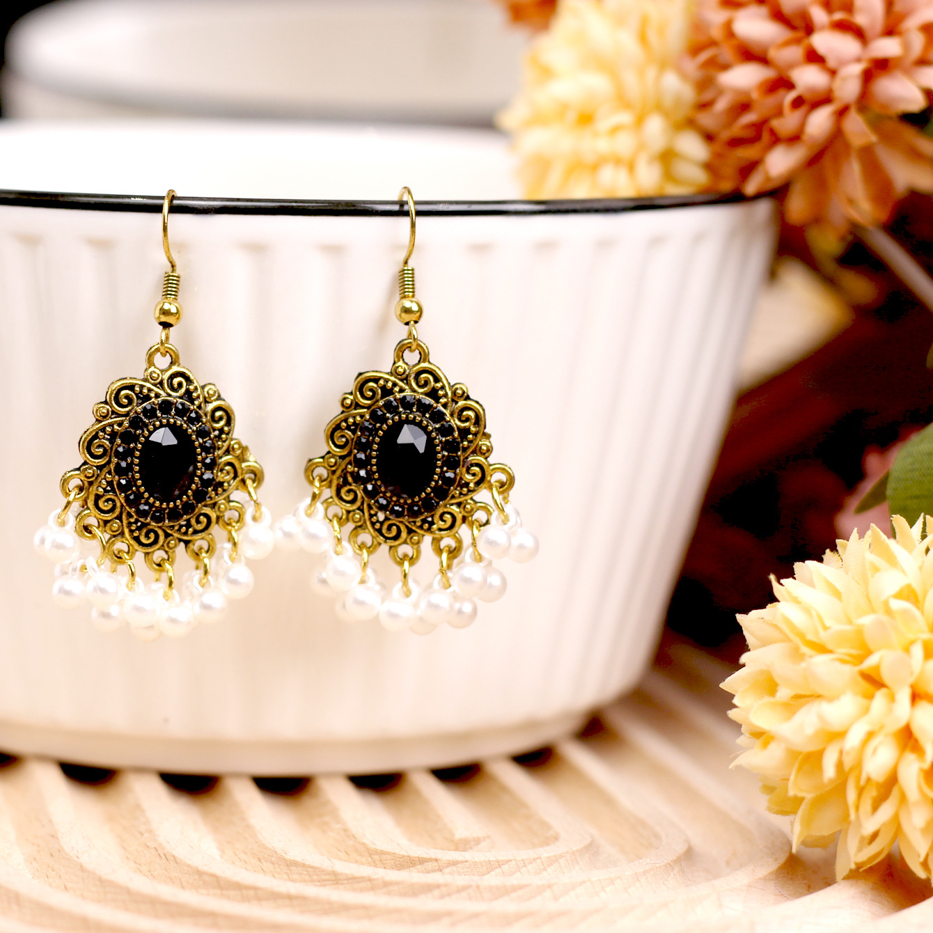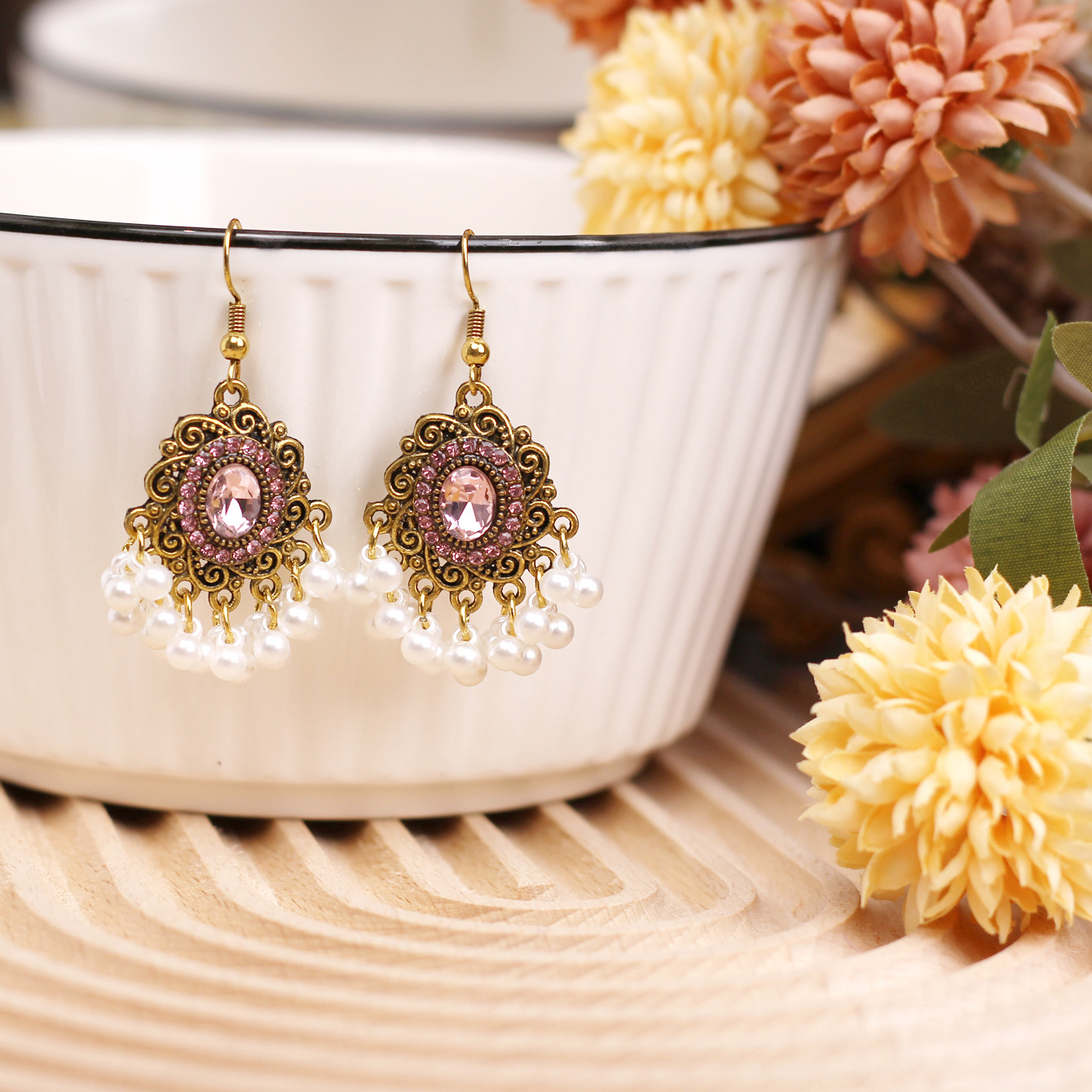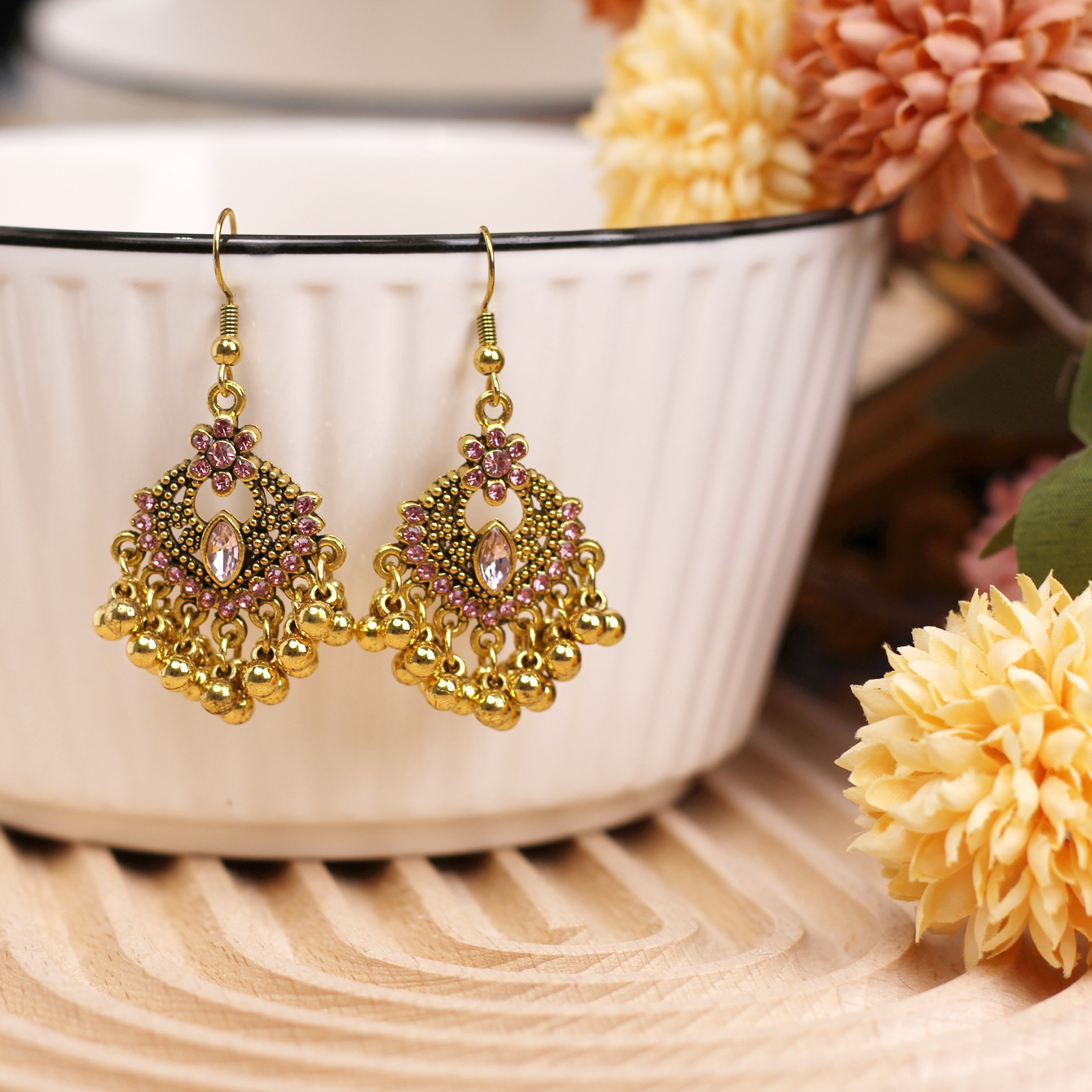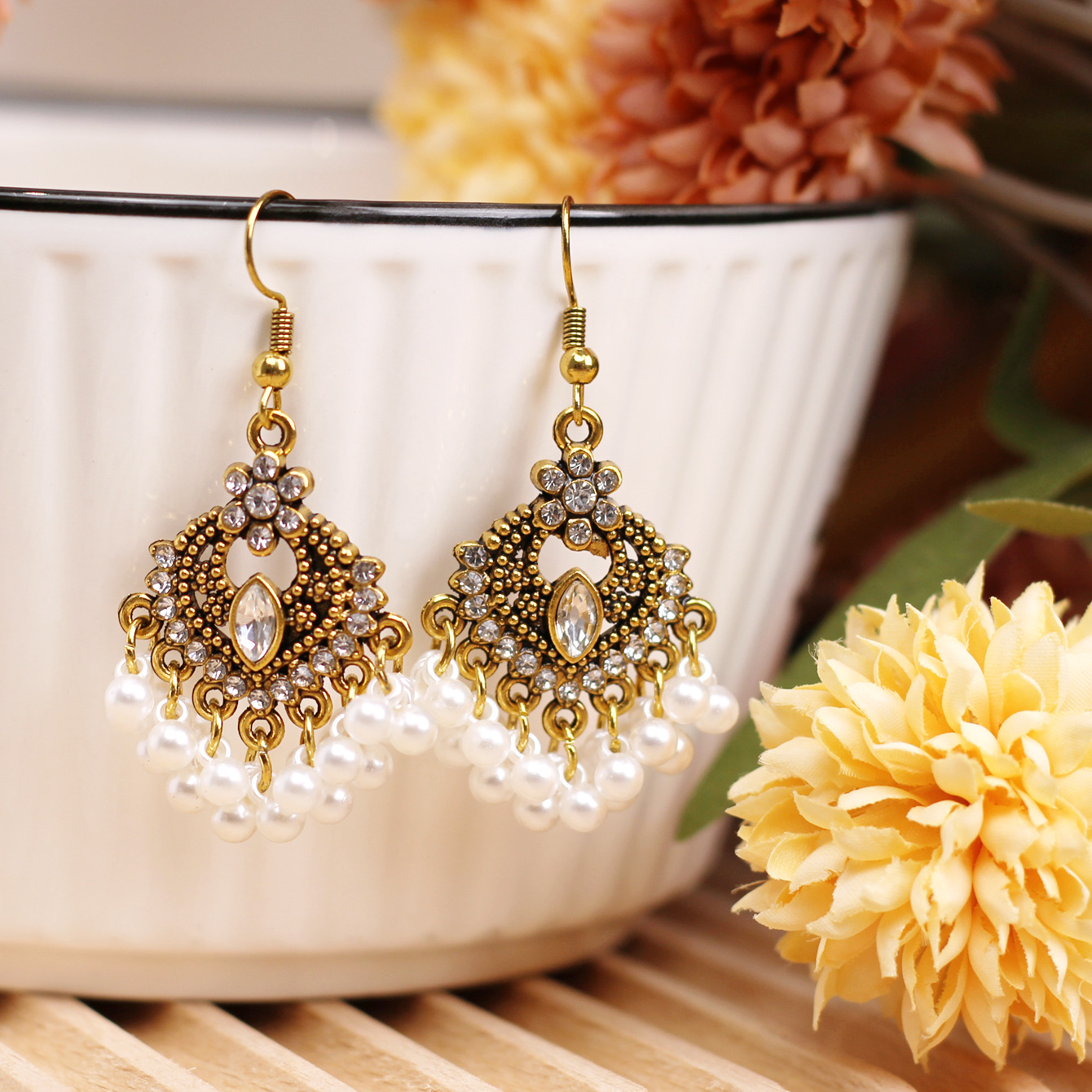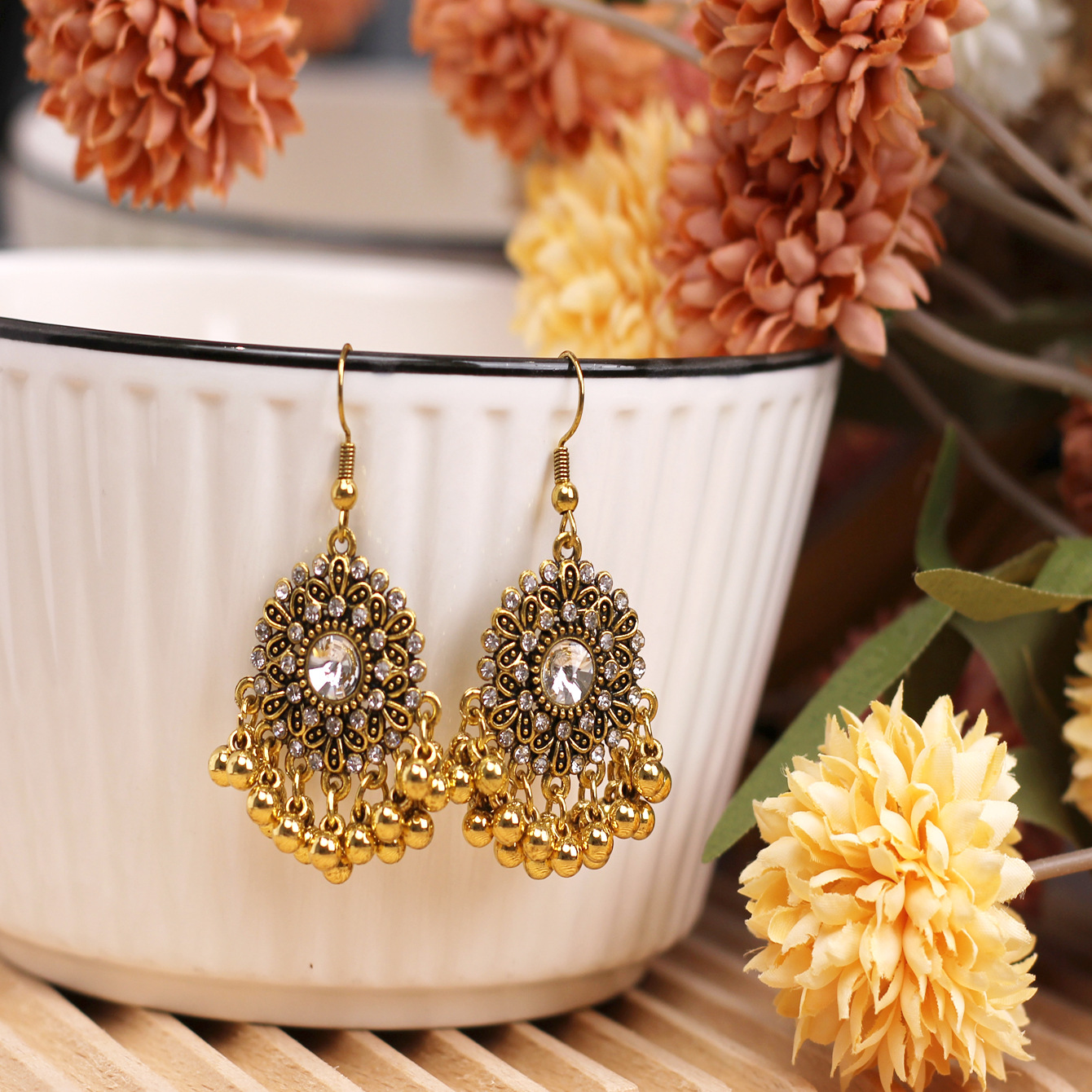 欧美百搭优雅苗疆流苏风小款重工复古设计感合金镶钻花朵项链耳环