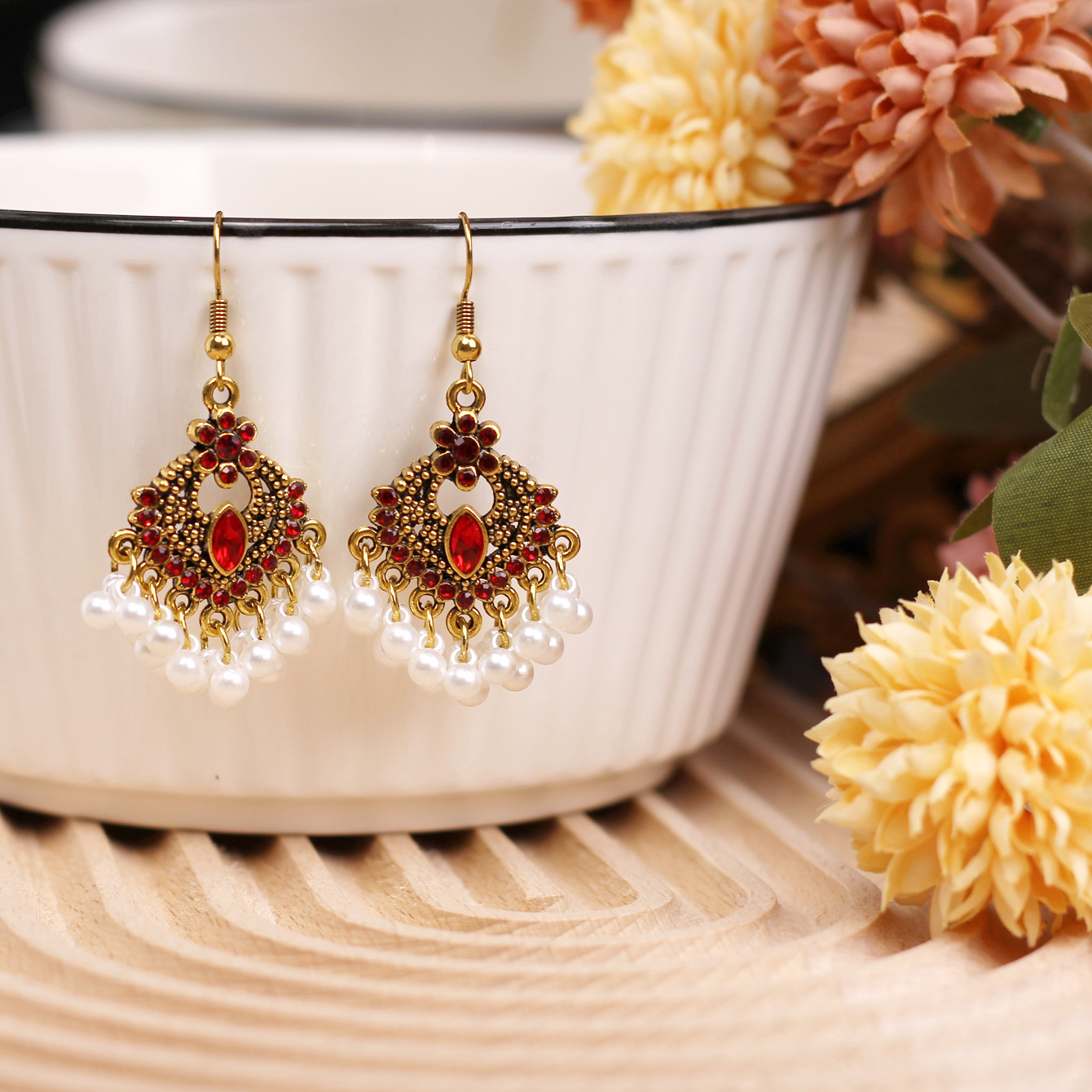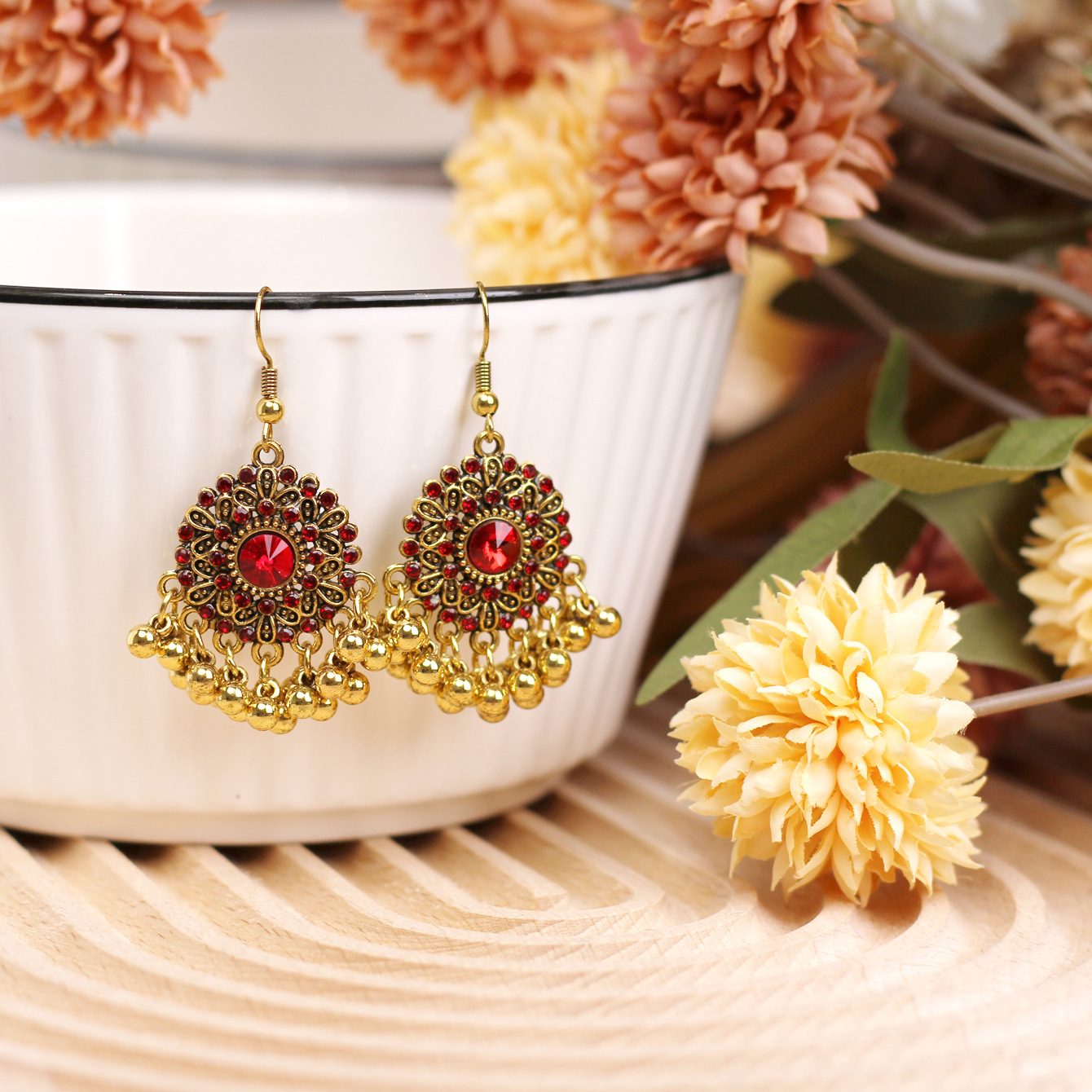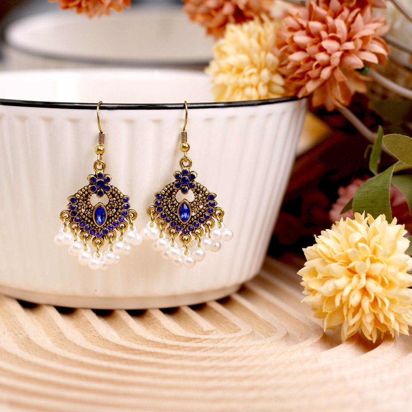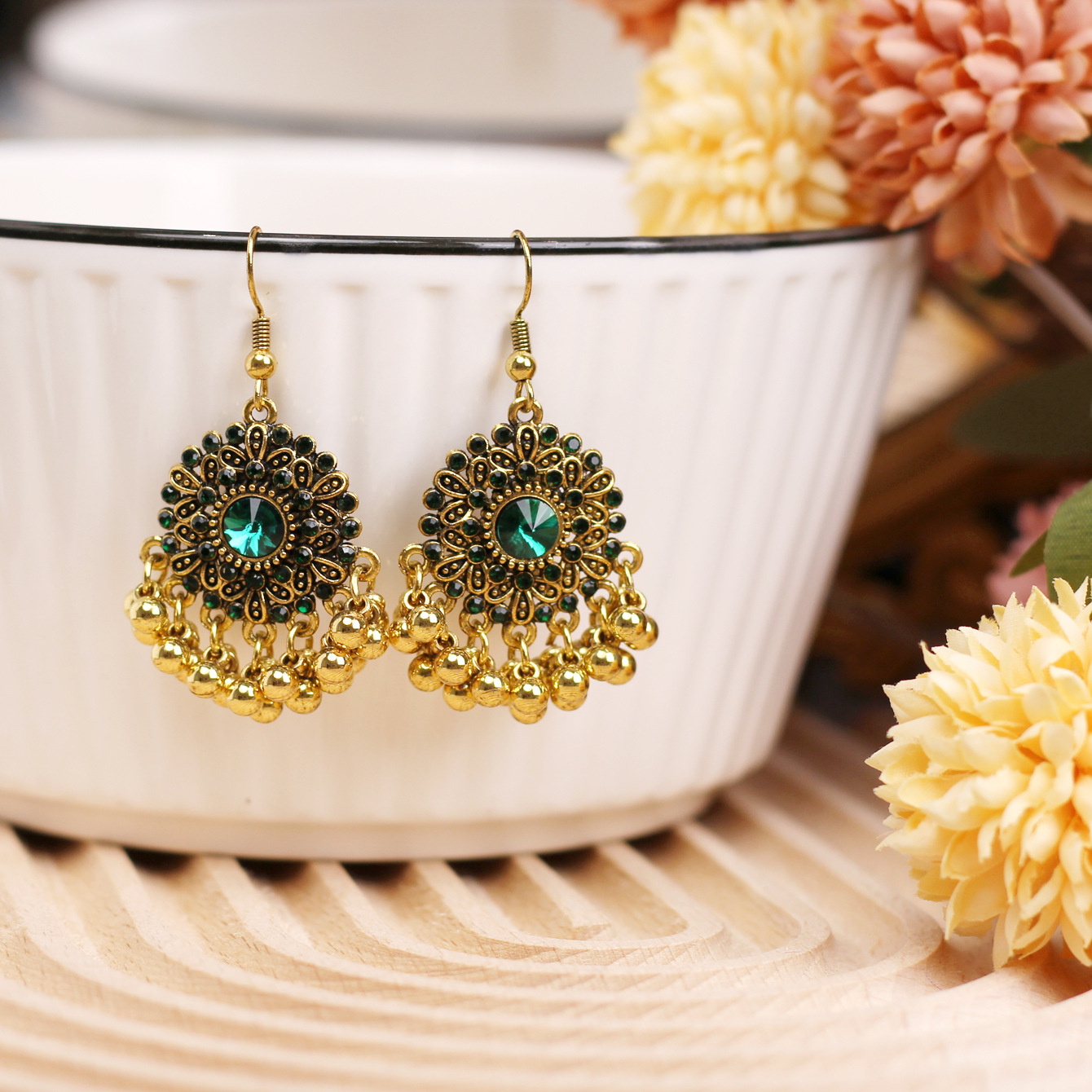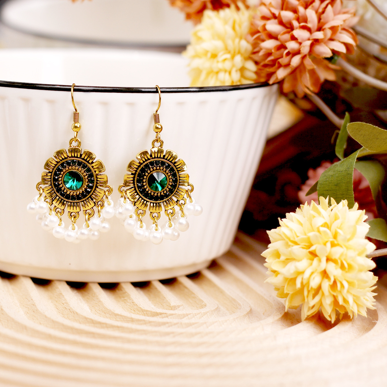 欧美百搭优雅苗疆流苏风小款重工复古设计感合金镶钻花朵项链耳环