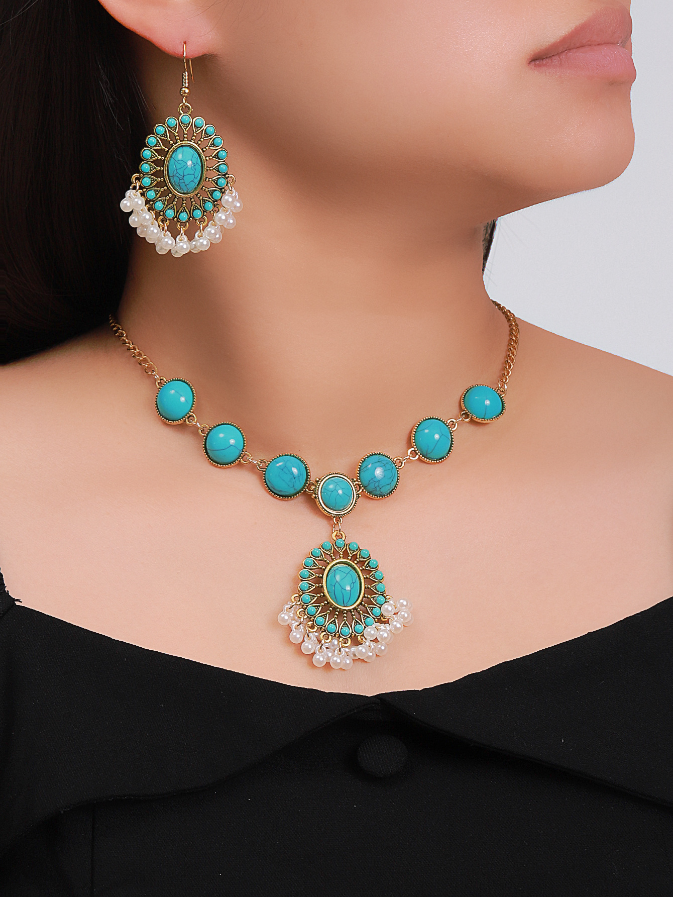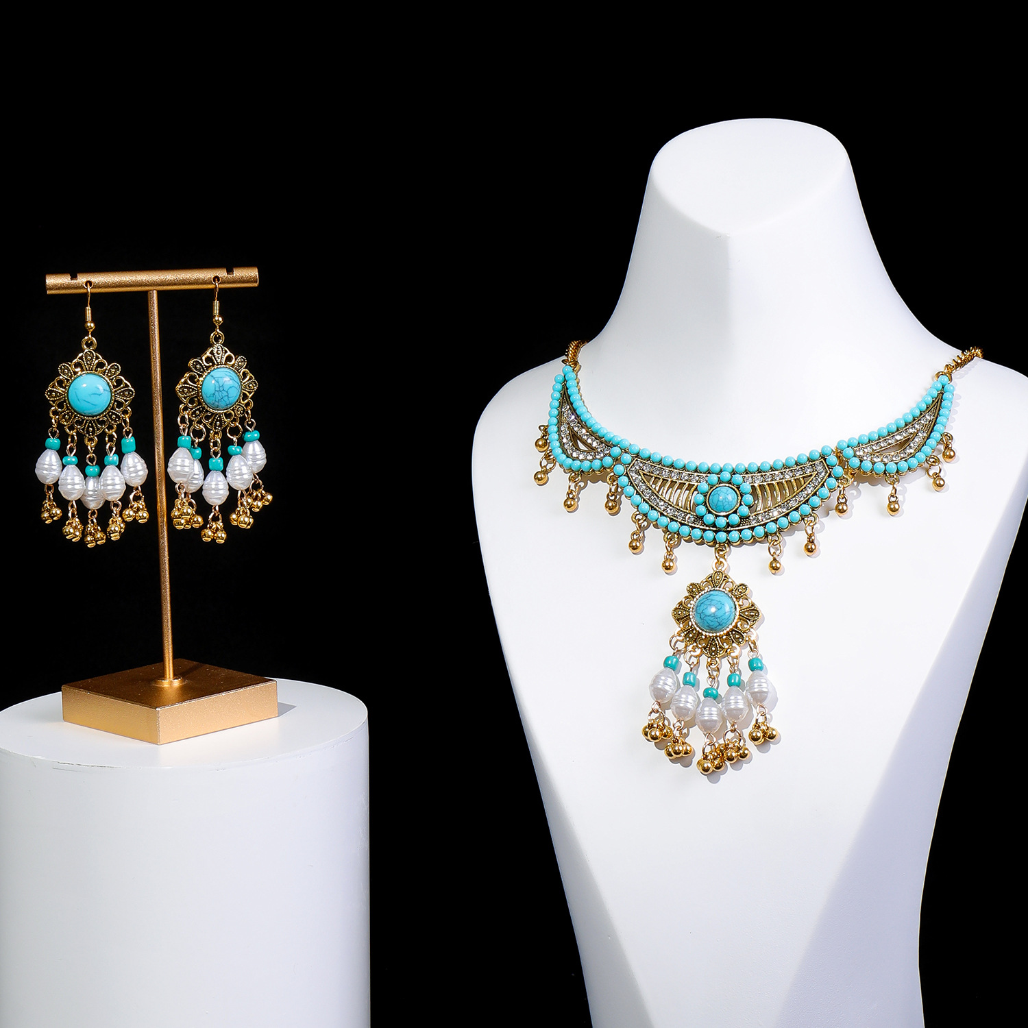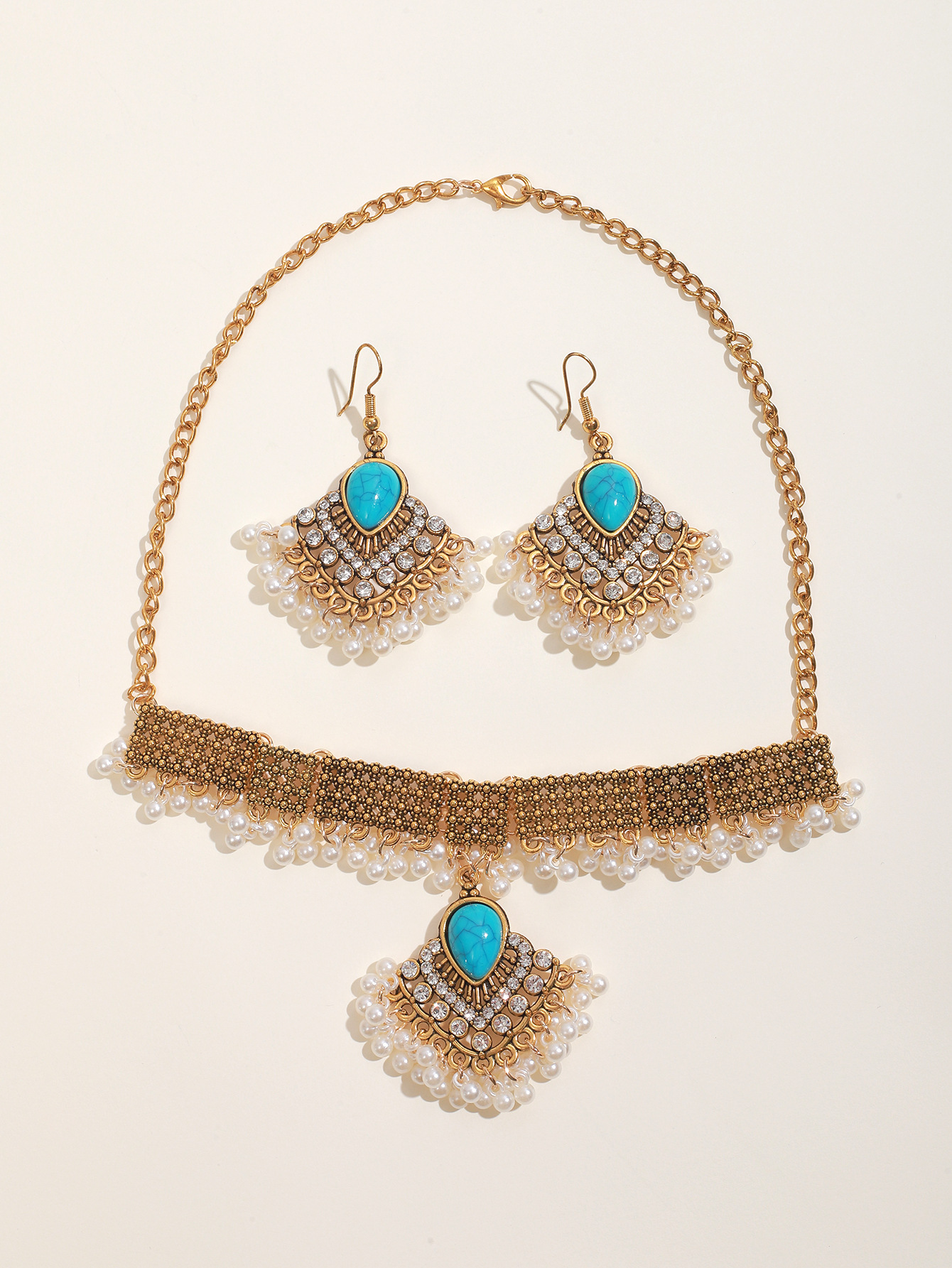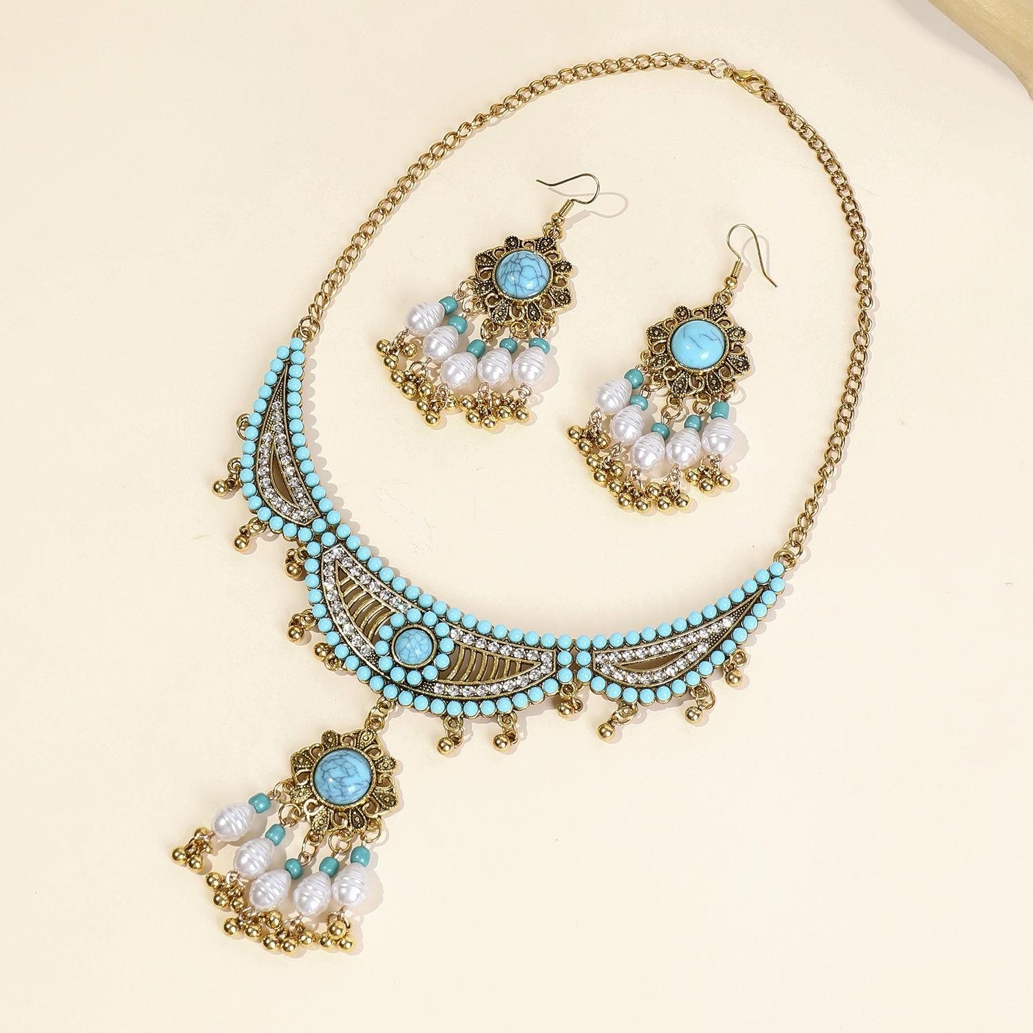欧美跨境松石流苏项链耳环重工复古珍珠套链