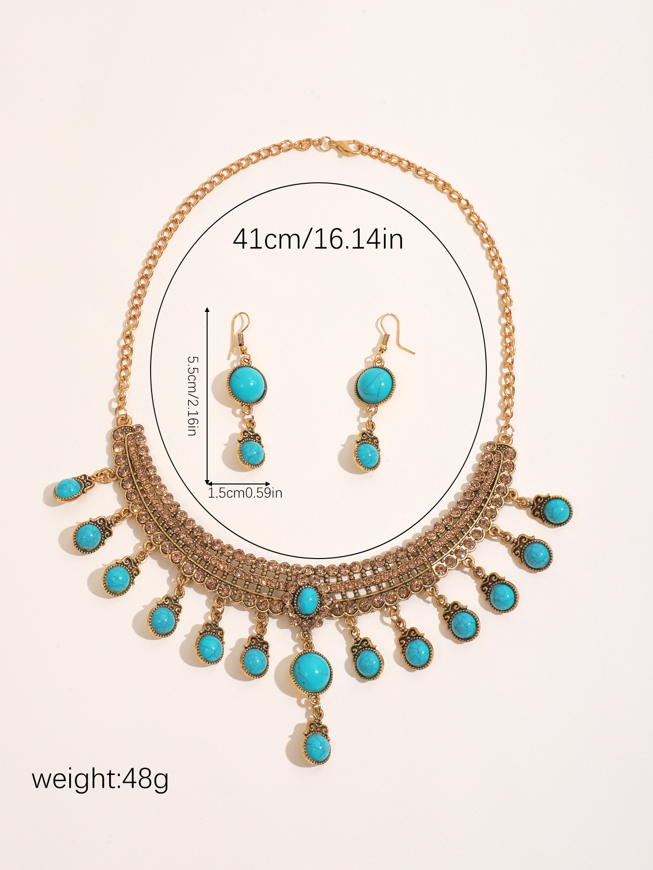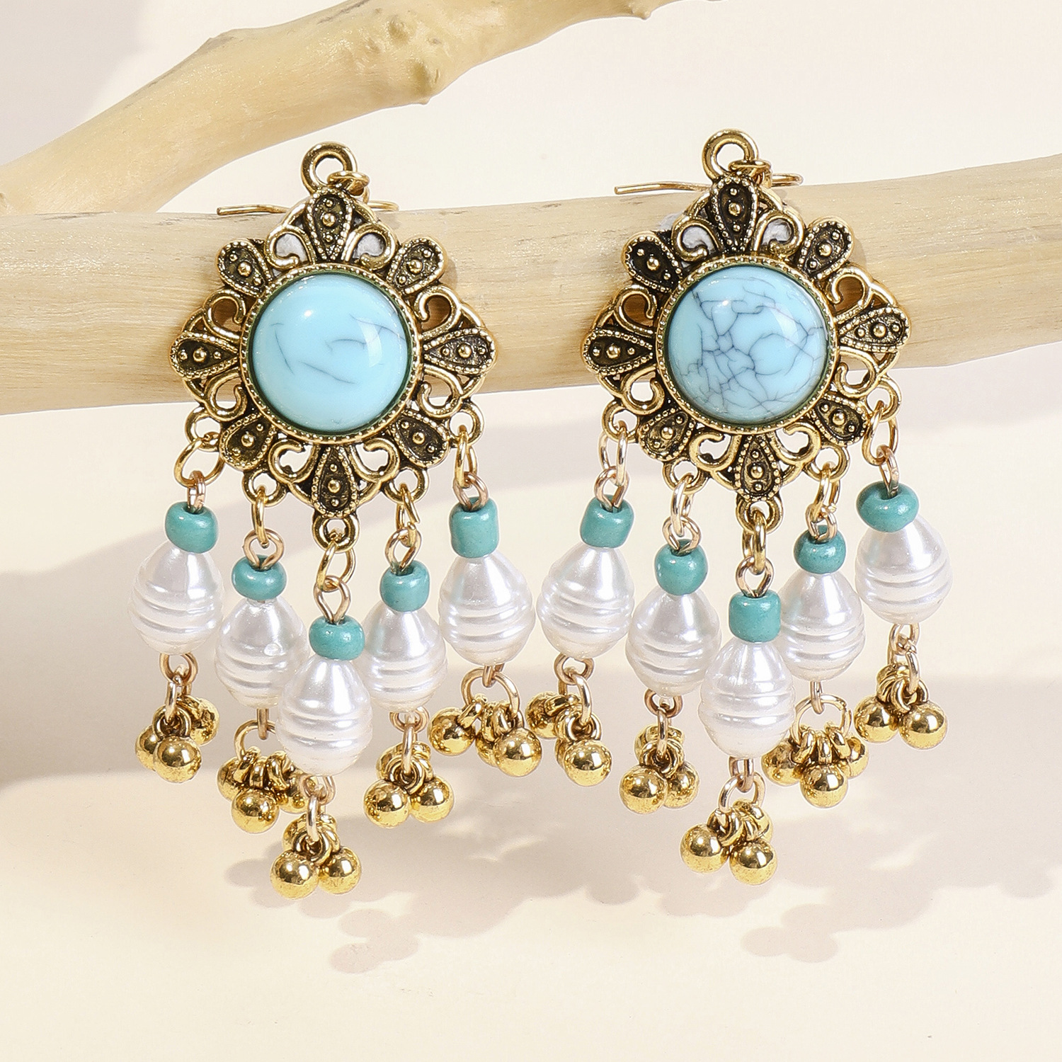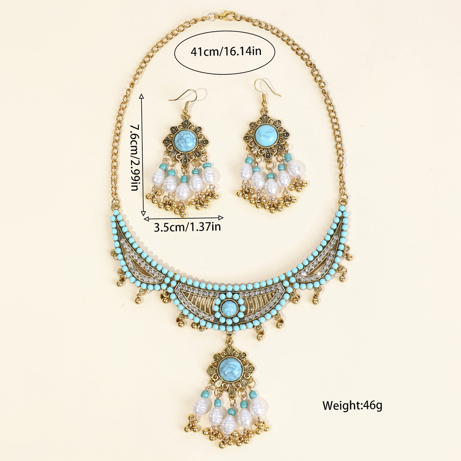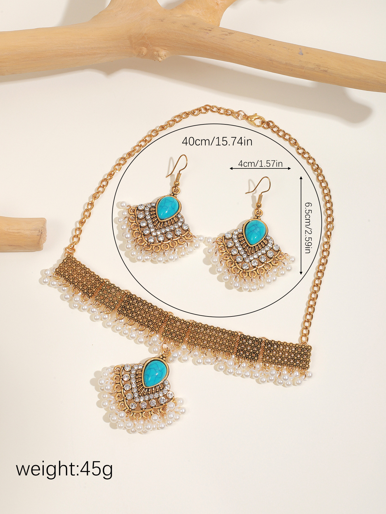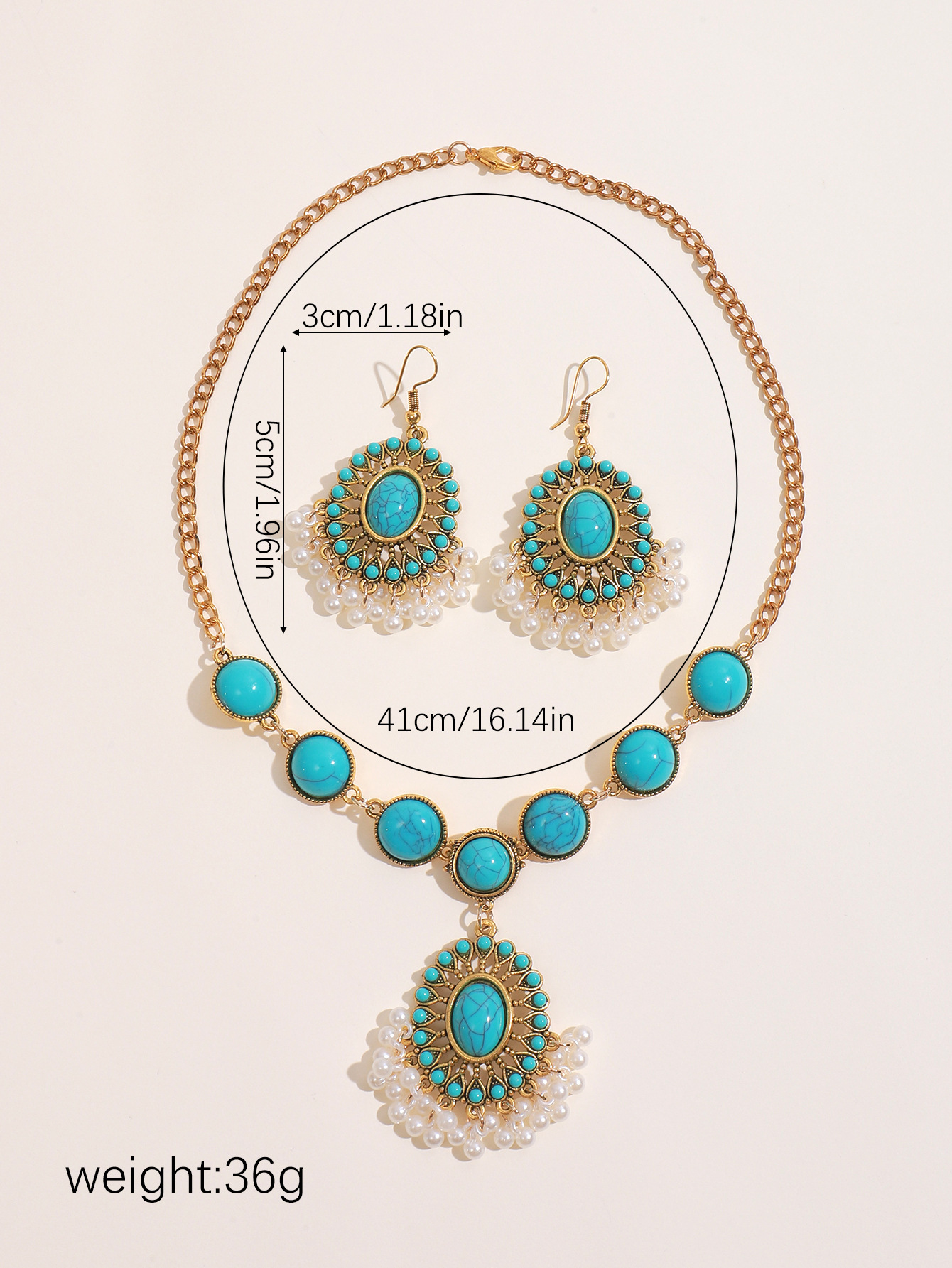 欧美跨境松石流苏项链耳环重工复古珍珠套链