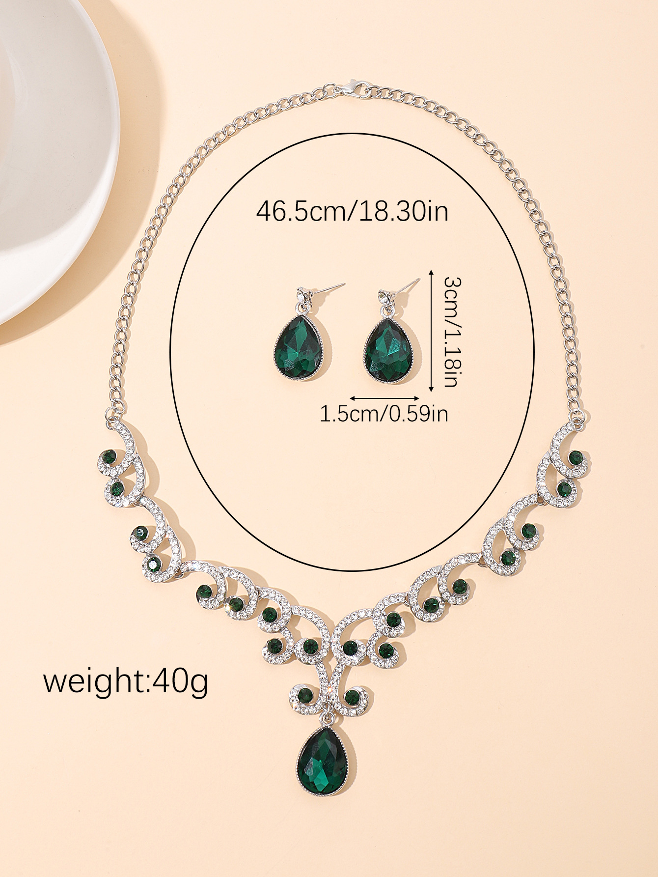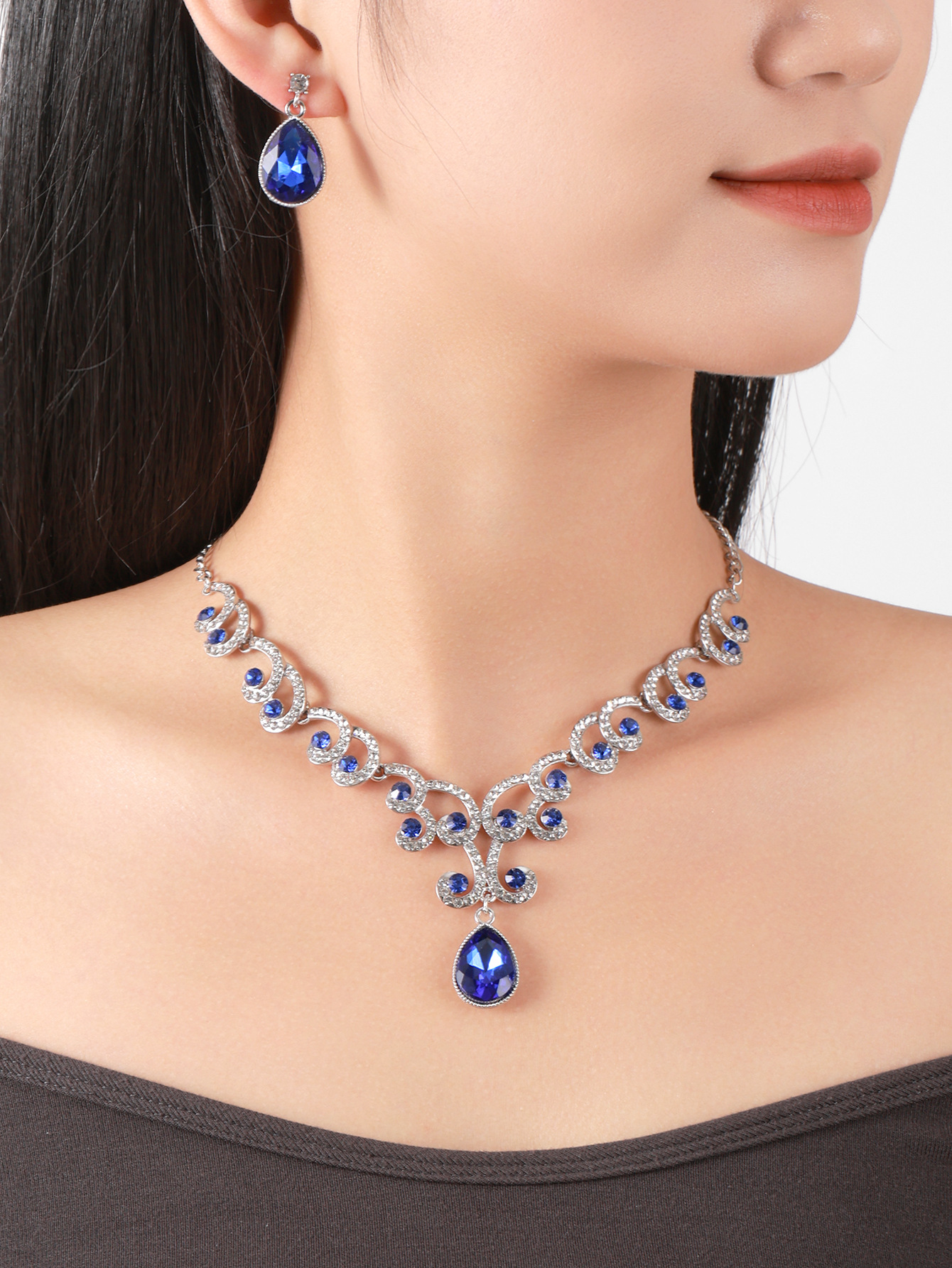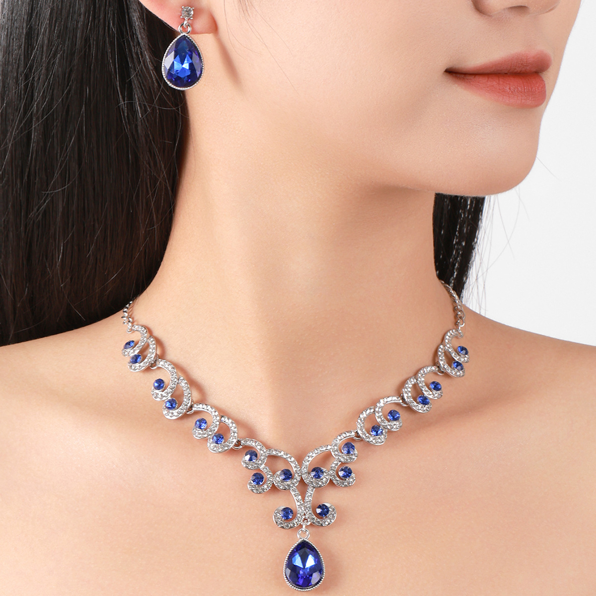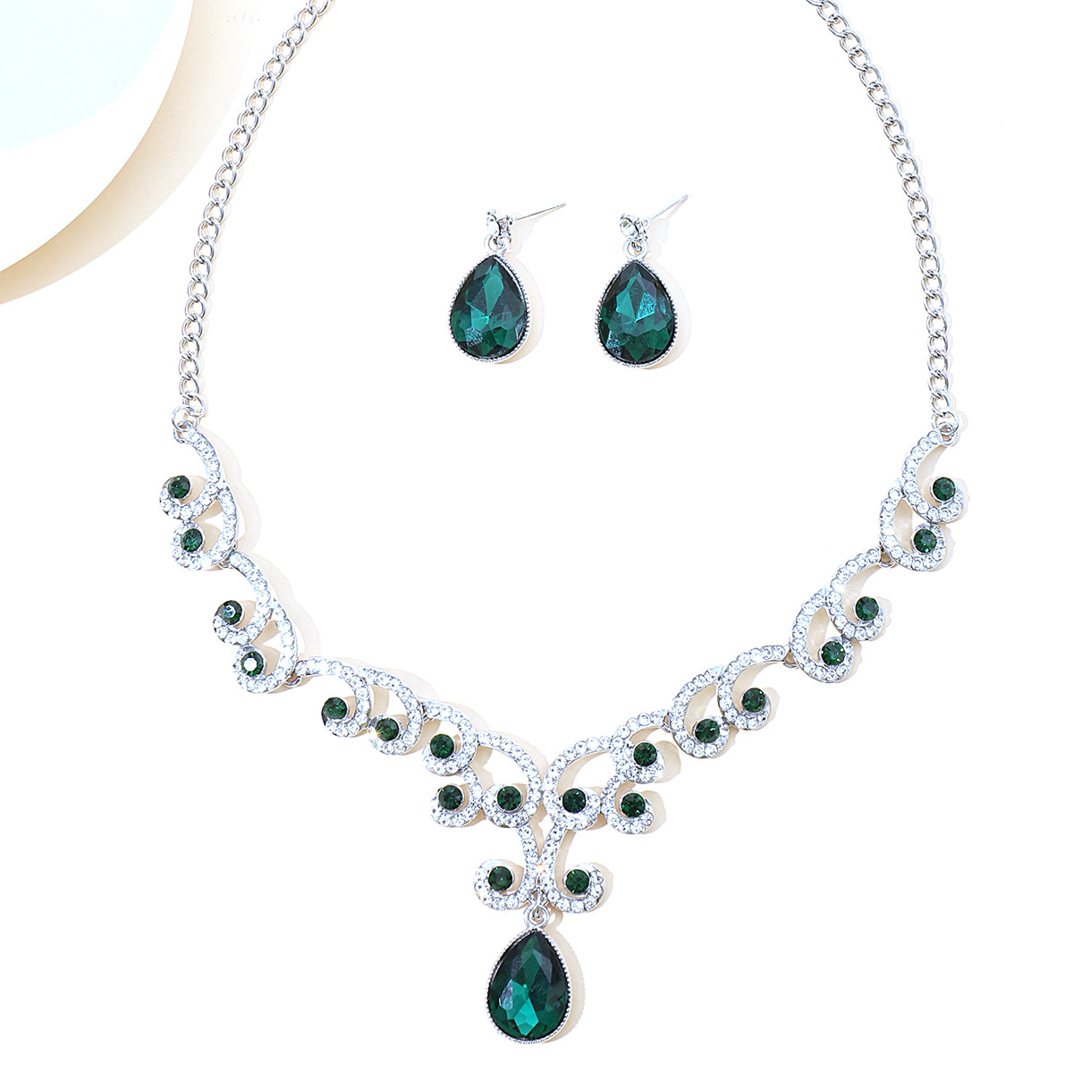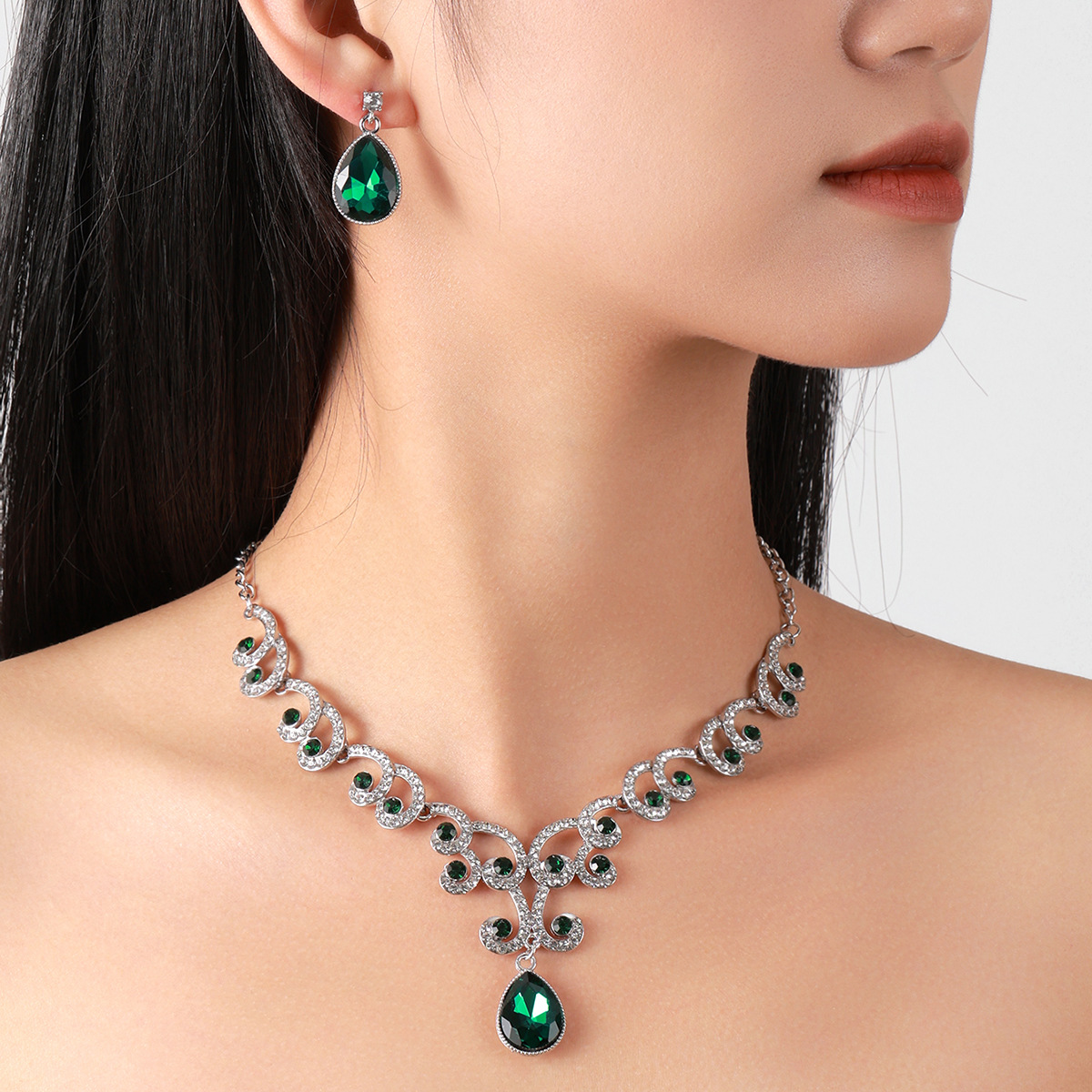 欧美首饰套链耳环吊坠水钻项链女饰品祖母绿水滴时尚新娘配饰跨境