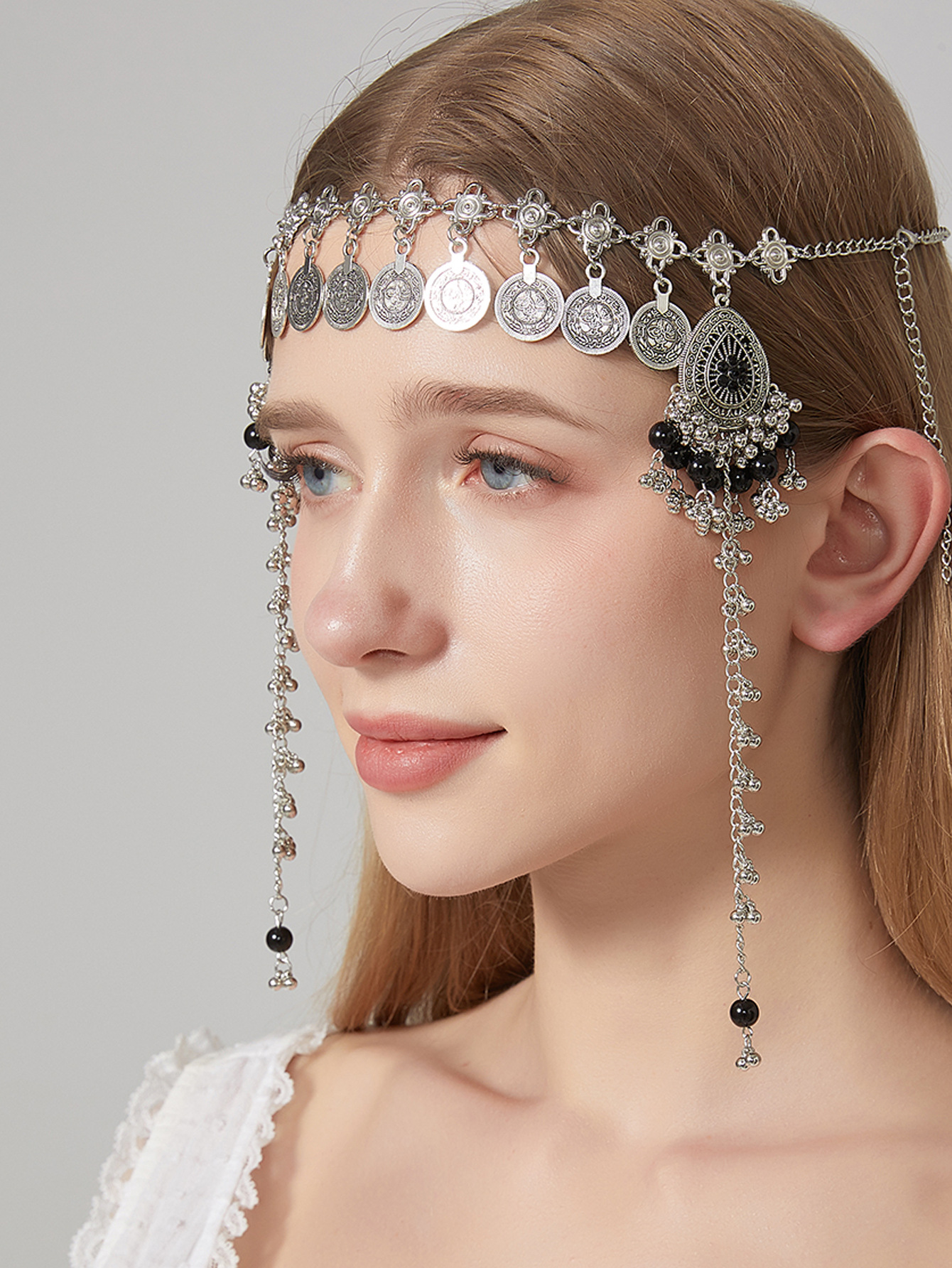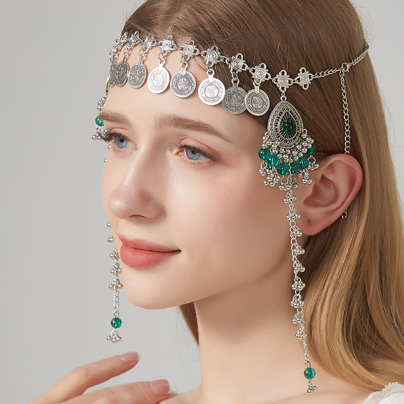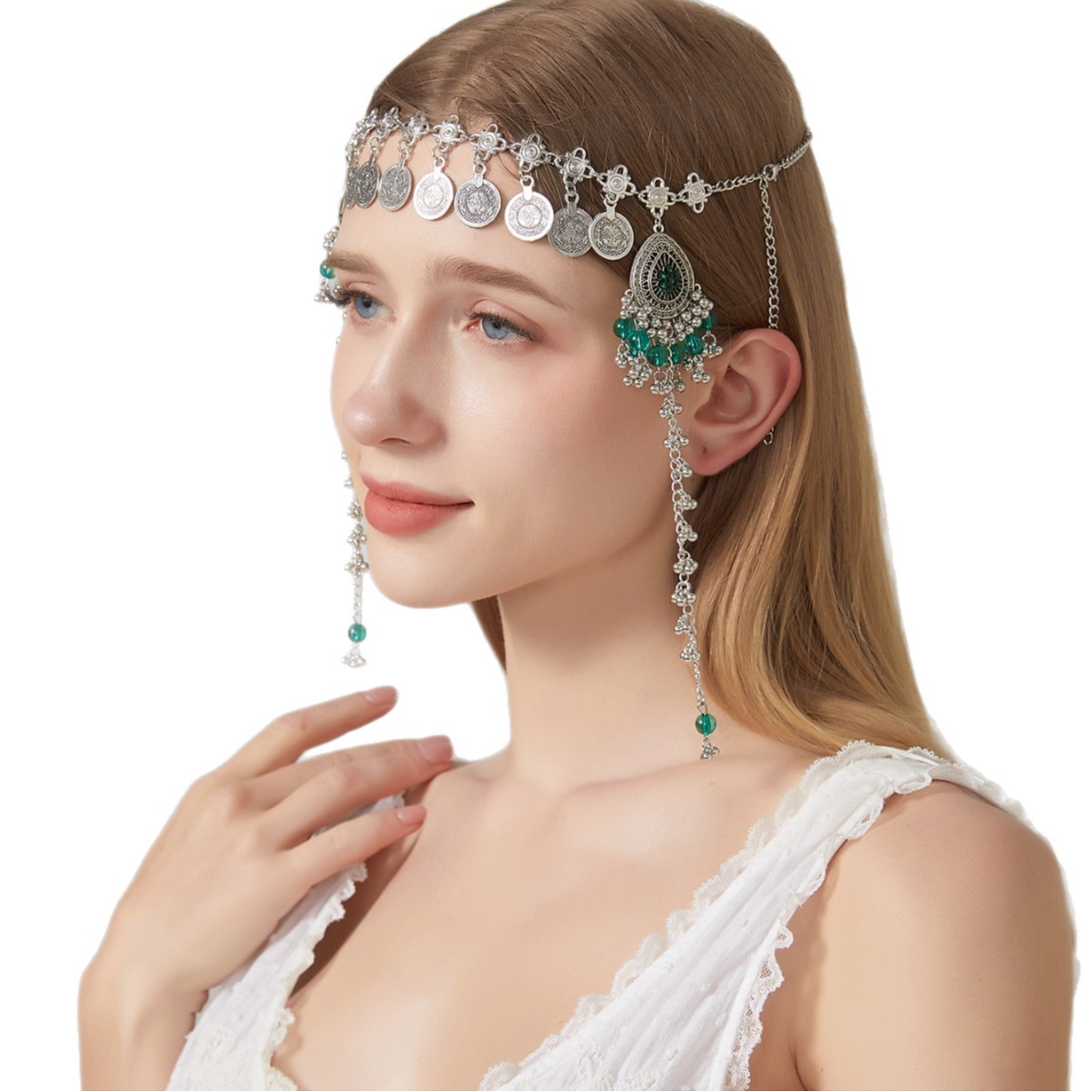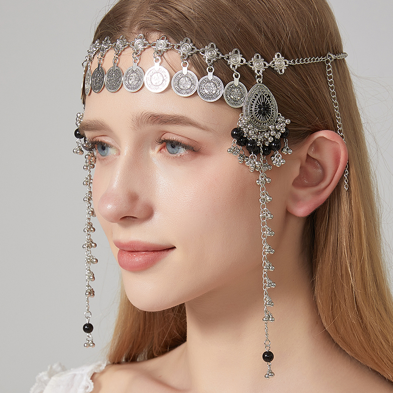 跨境热卖民族风多个古钱币发饰 水滴长款流苏额头链 设计感发链