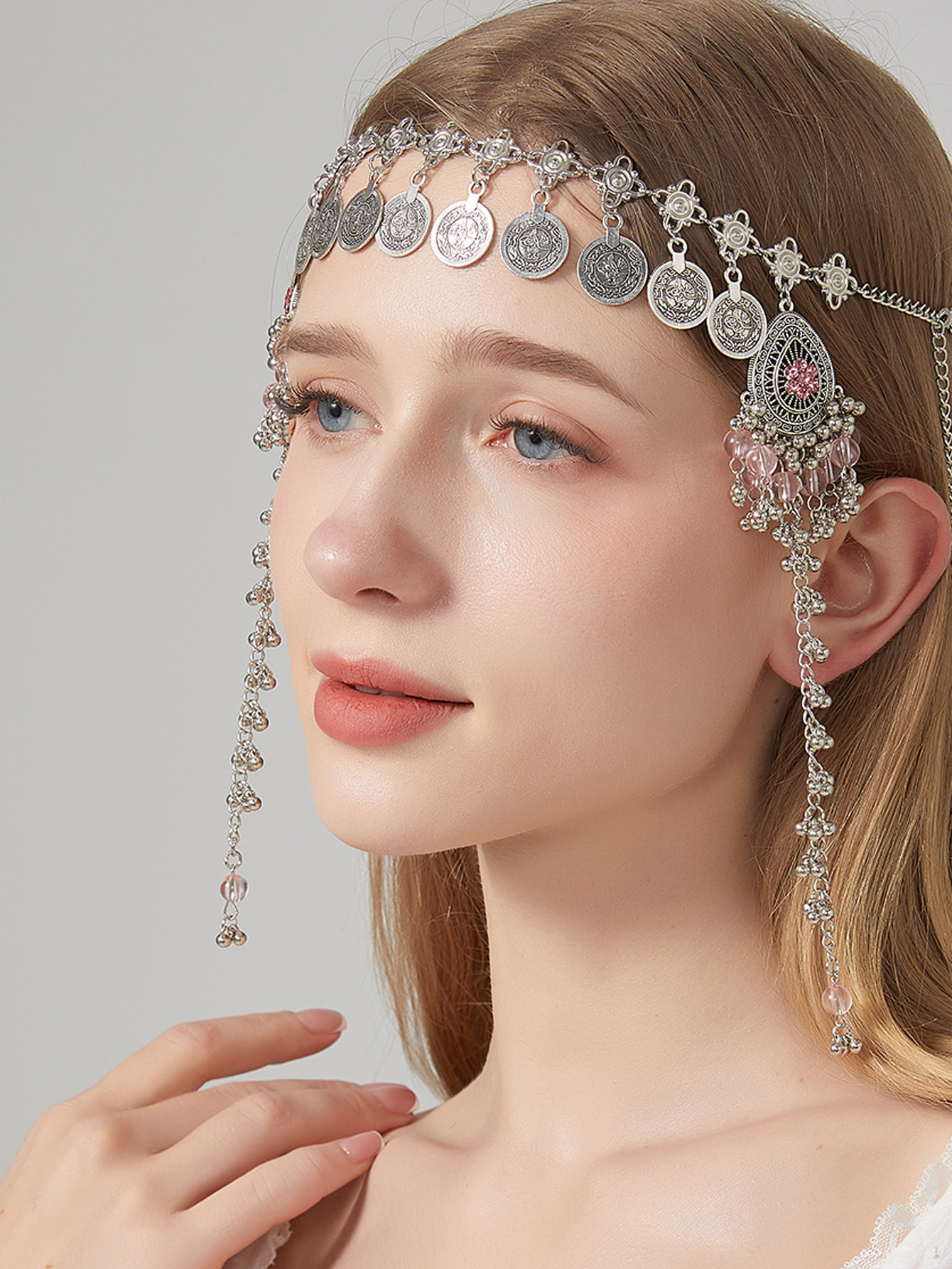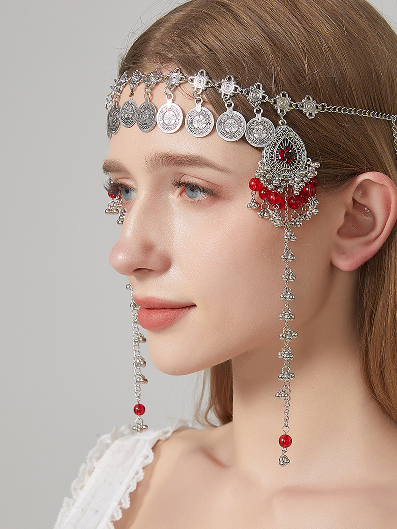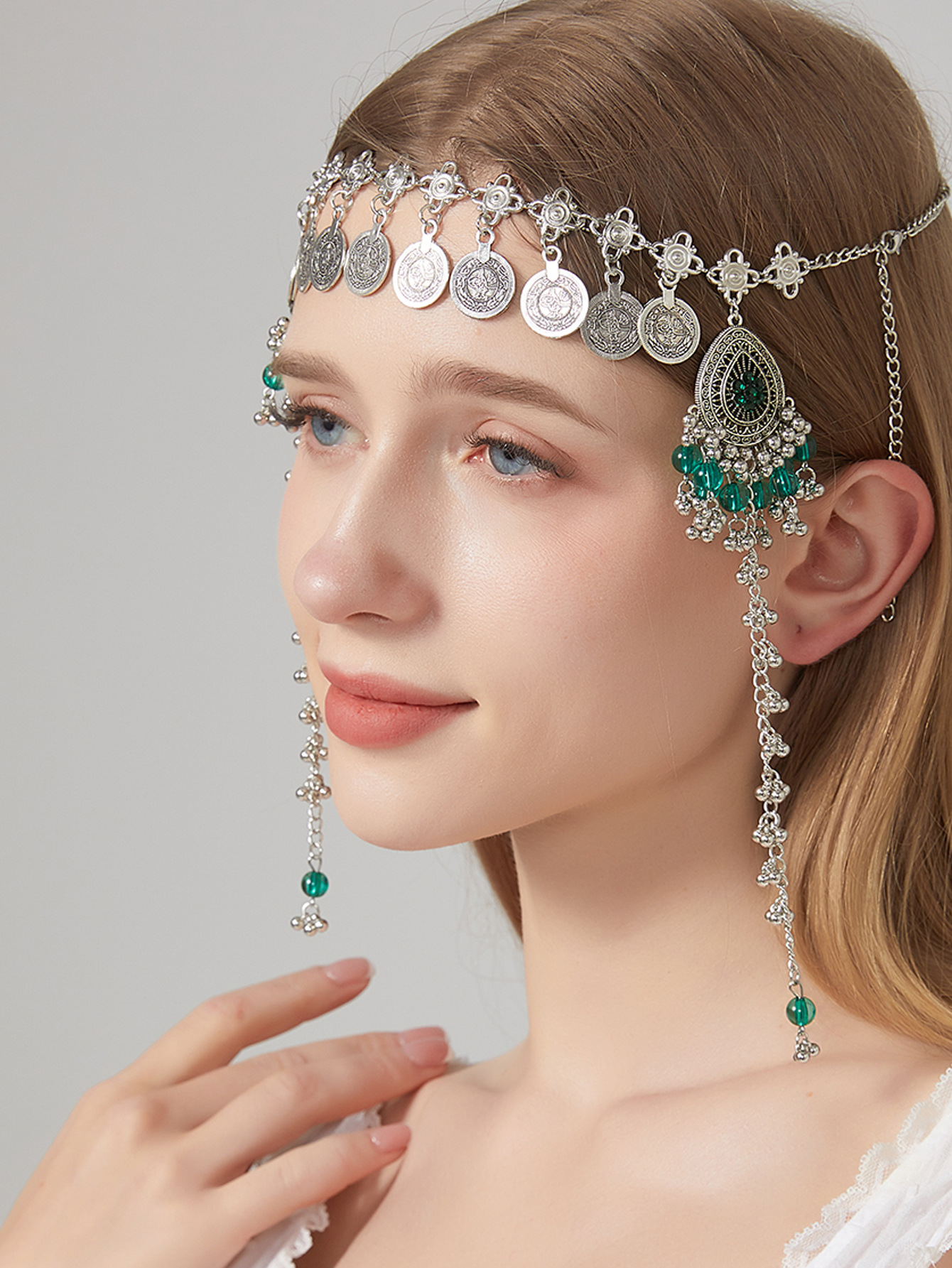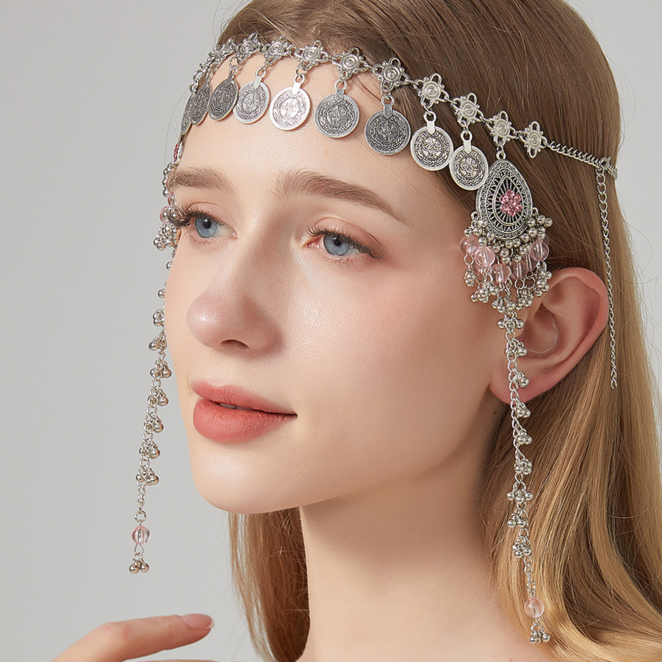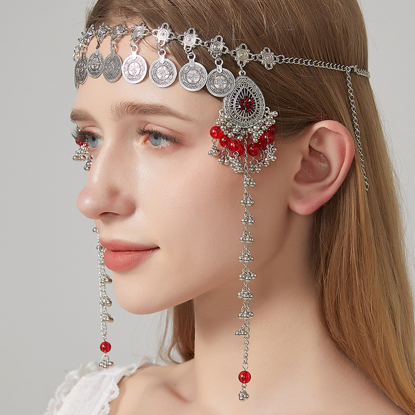 跨境热卖民族风多个古钱币发饰 水滴长款流苏额头链 设计感发链